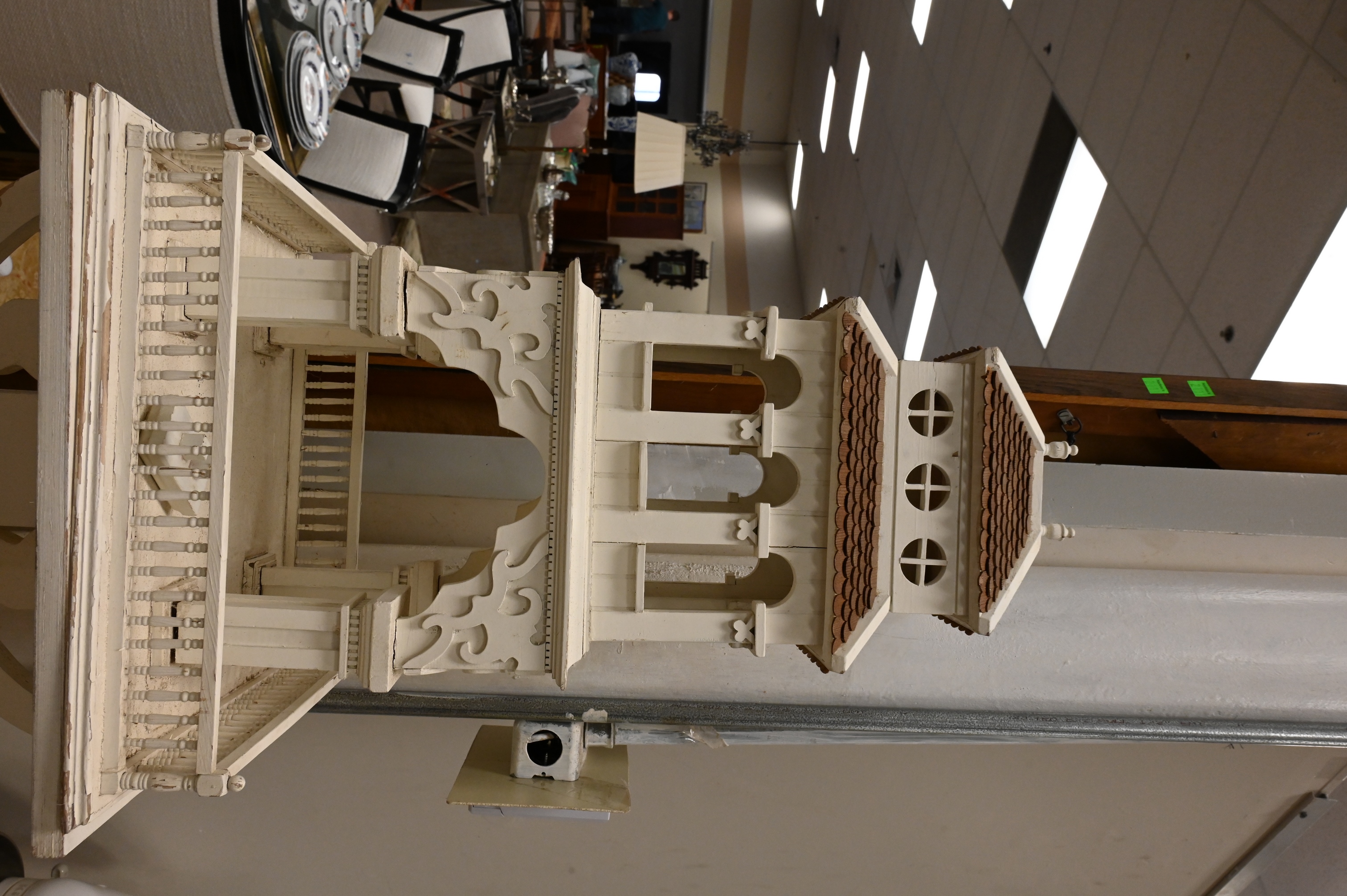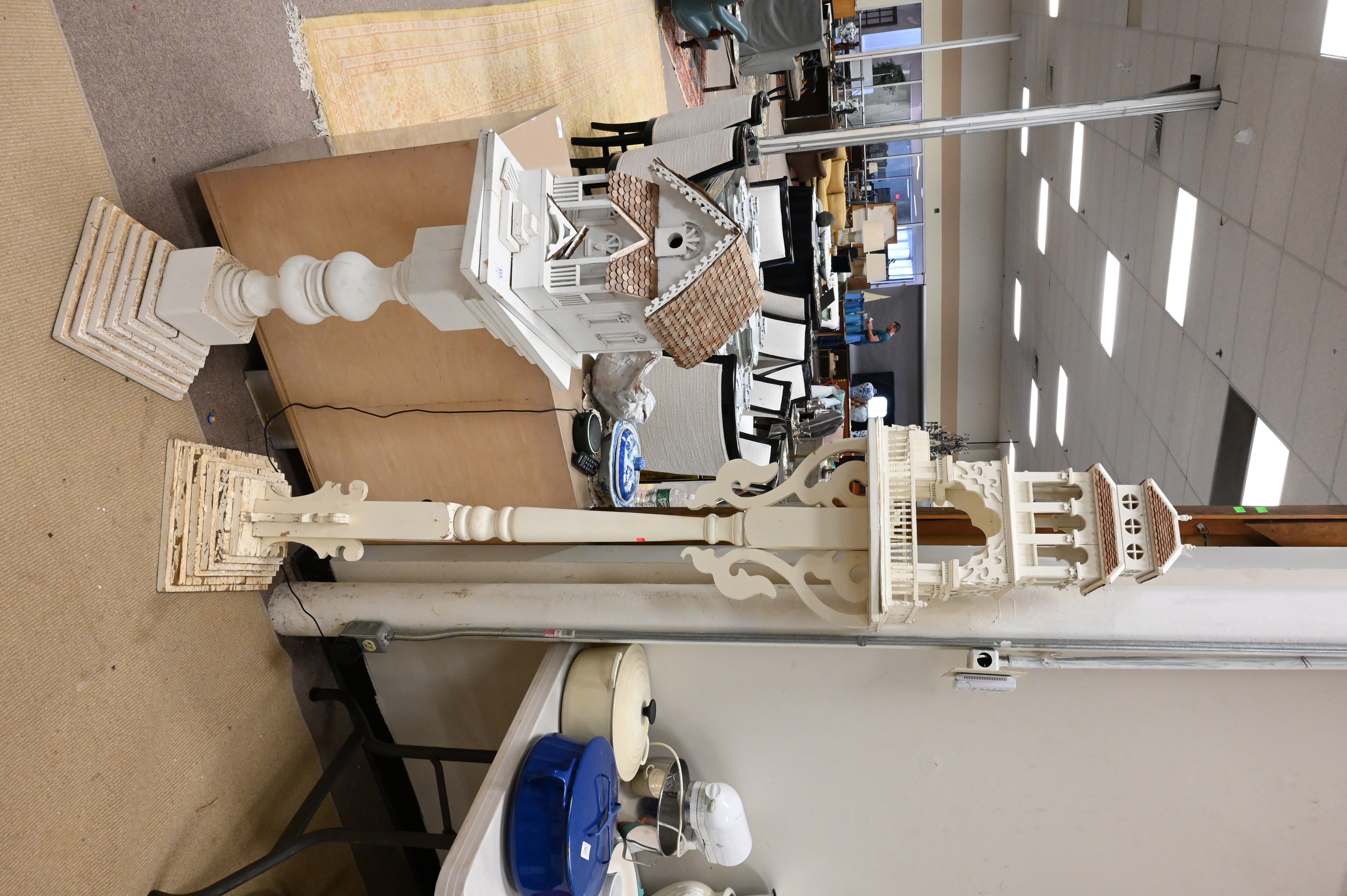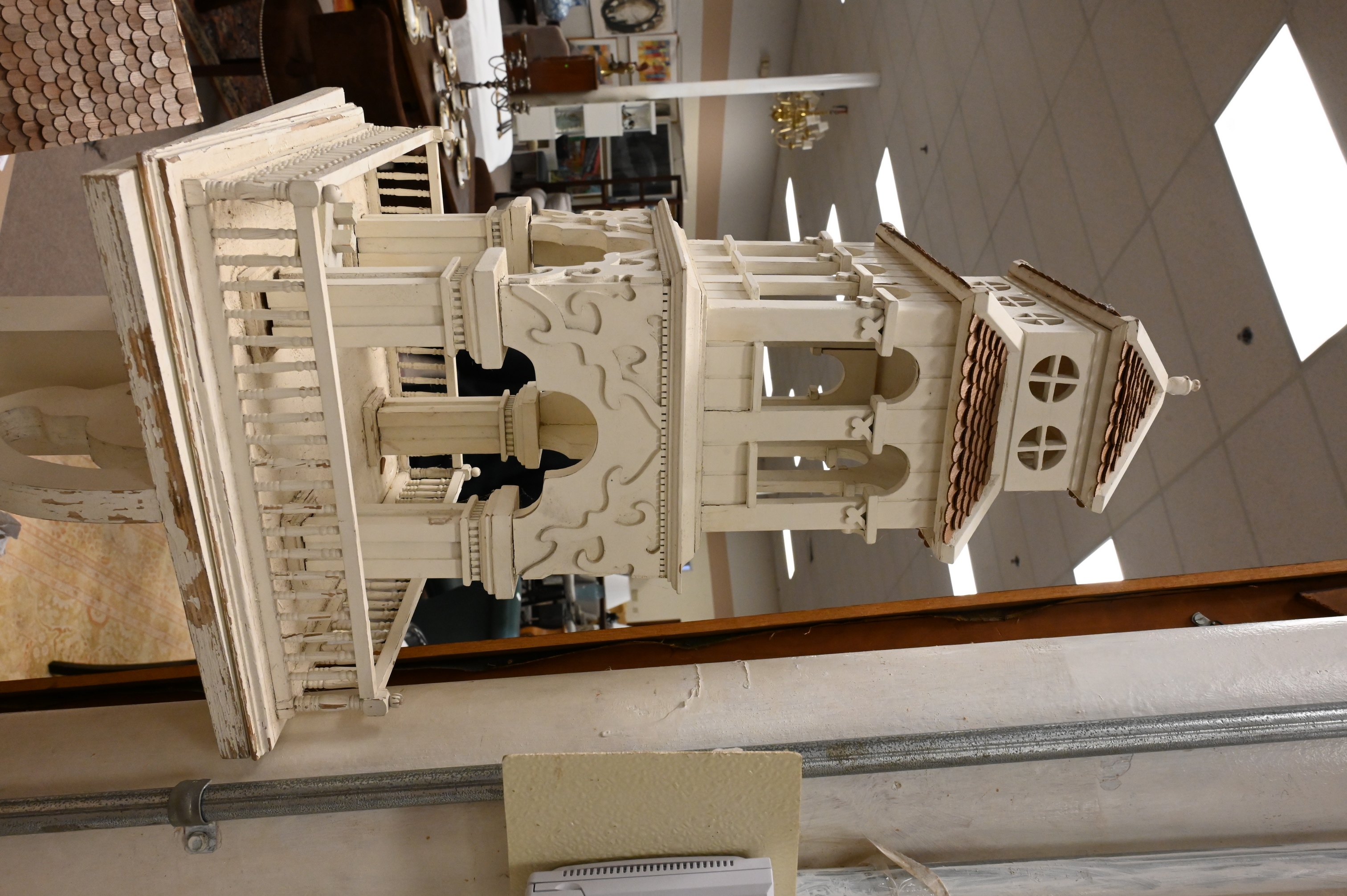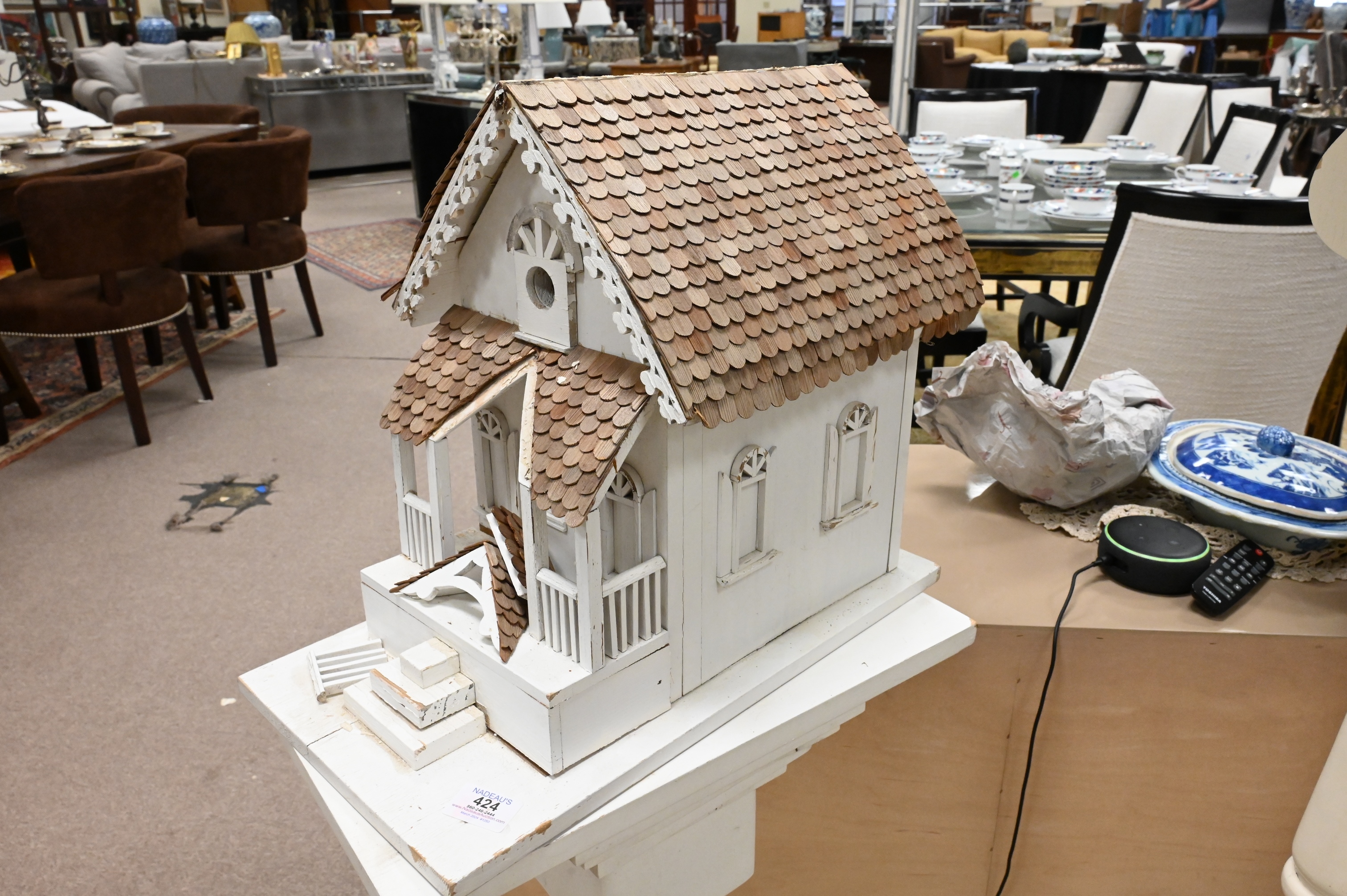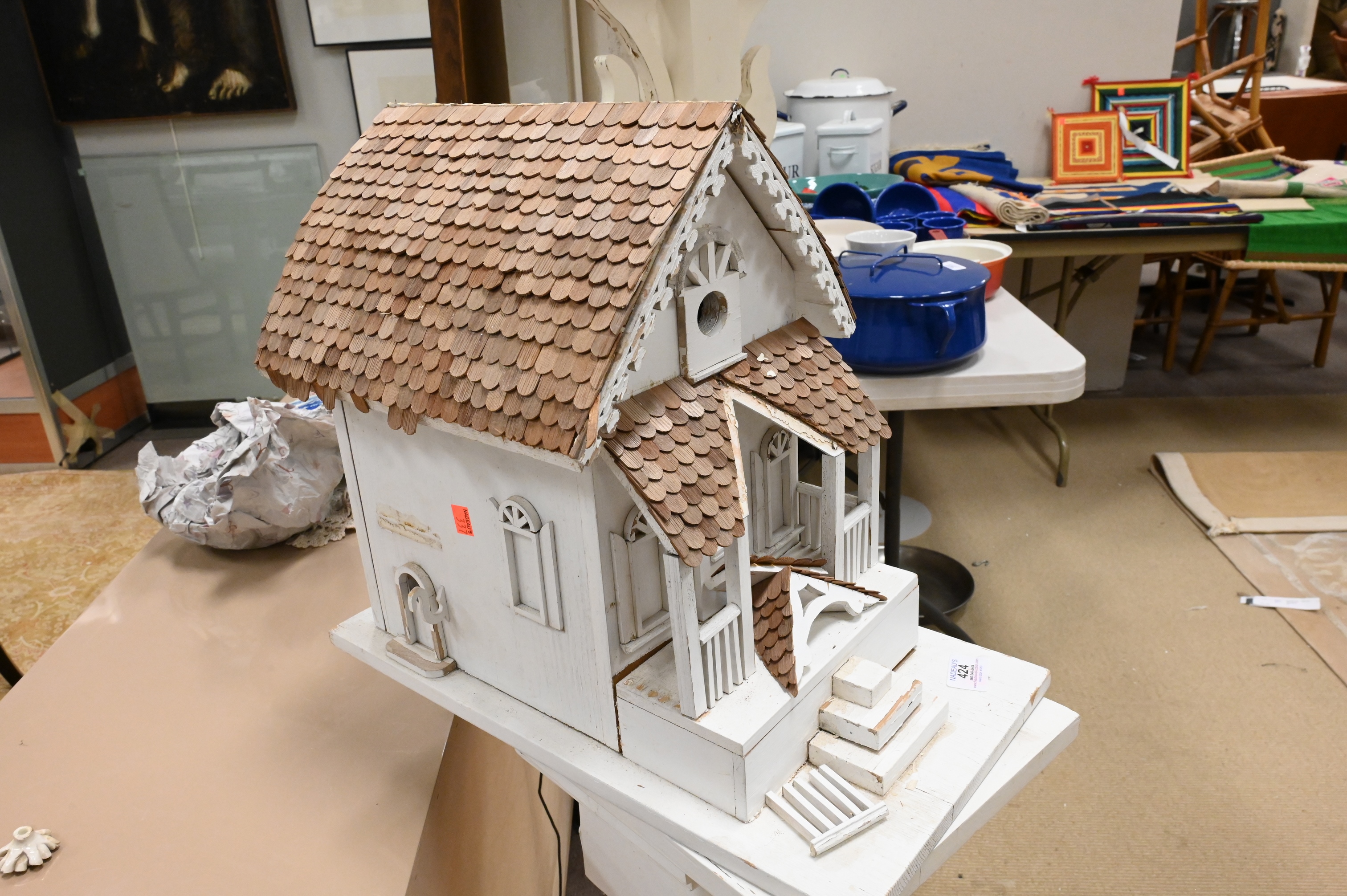 to include three-story bird feeder pagoda, victorian garden style house, each painted white on tall pedestal bases