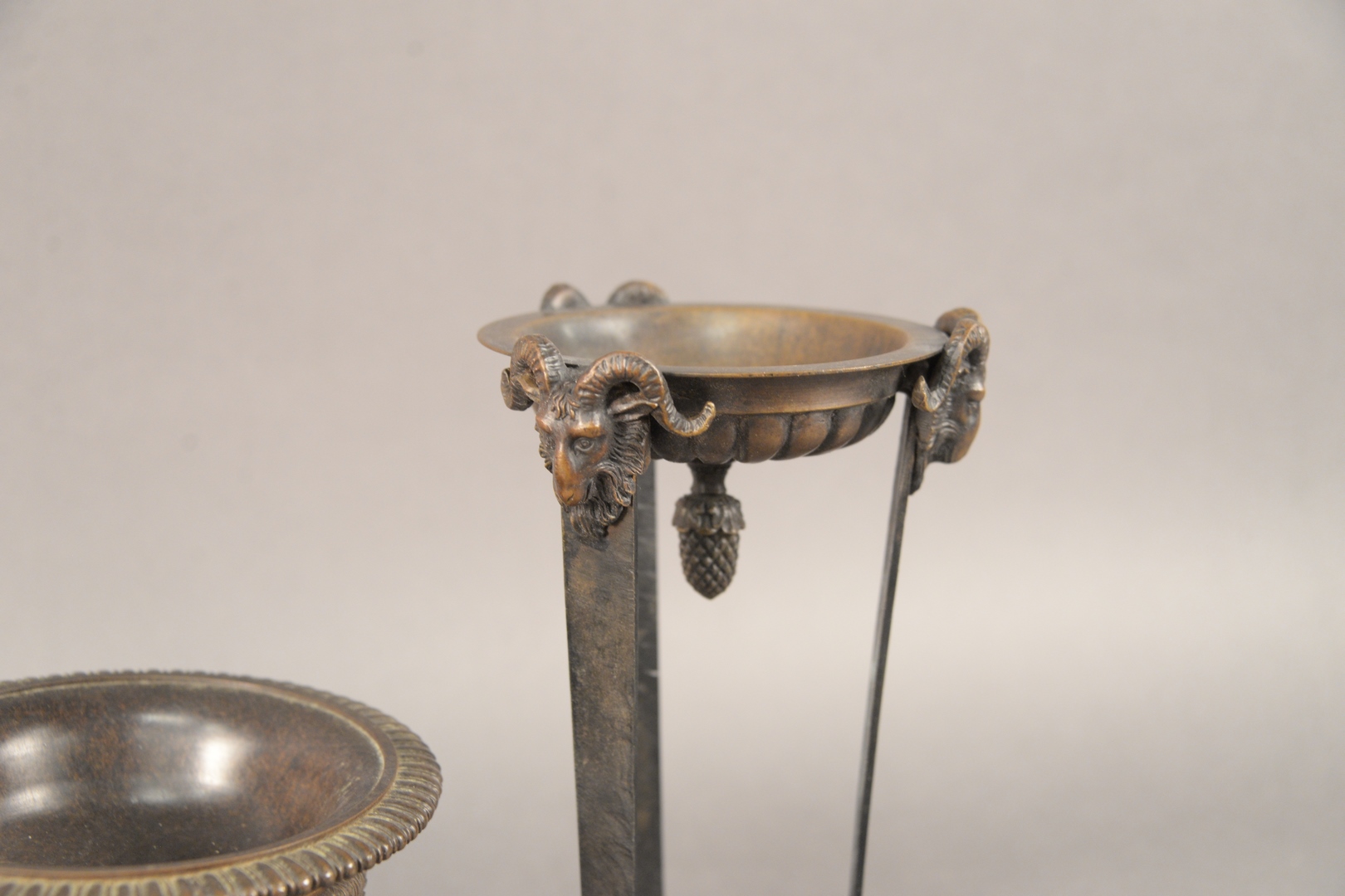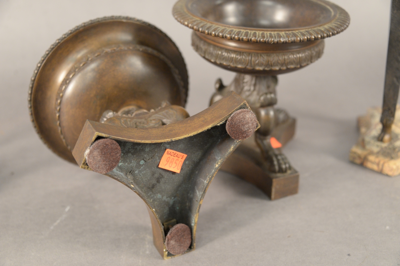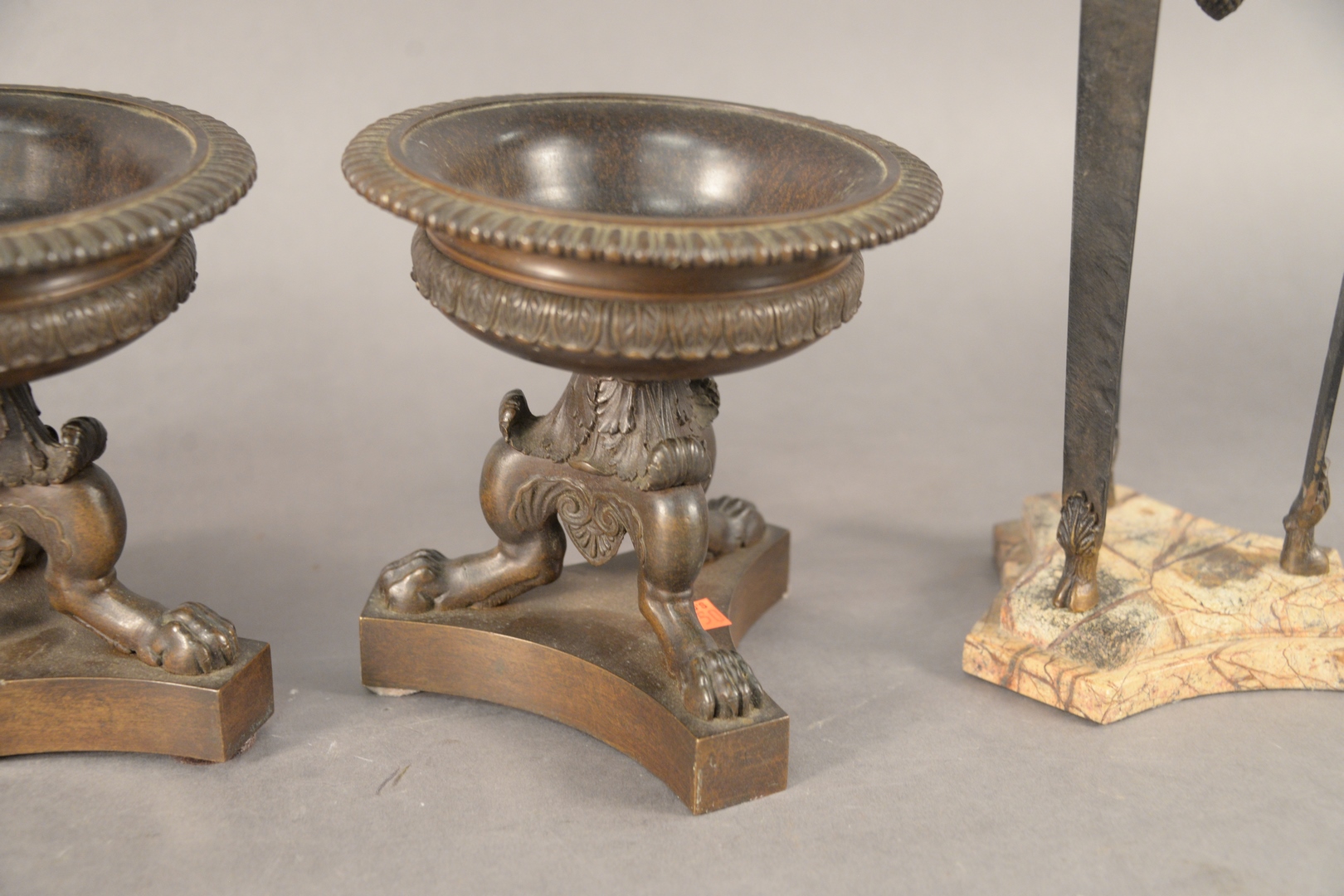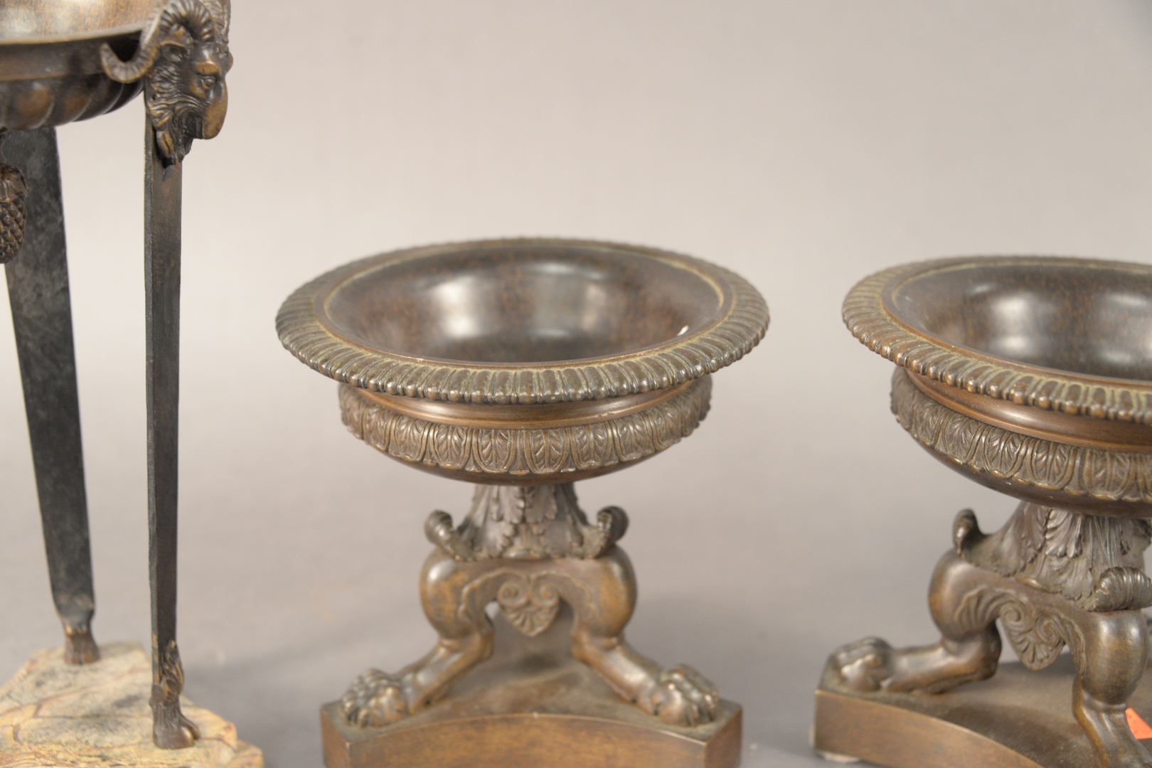 Lot 424: Two Pairs of Bronze Grand Tour Urns, one pair having mounted ram heads and ending in hoofed feet, mounted on marble bases along with a pair ending in paw feet and on bronze bases, 11 x 5 1/2 and 6 1/2 x 6 1/2.
