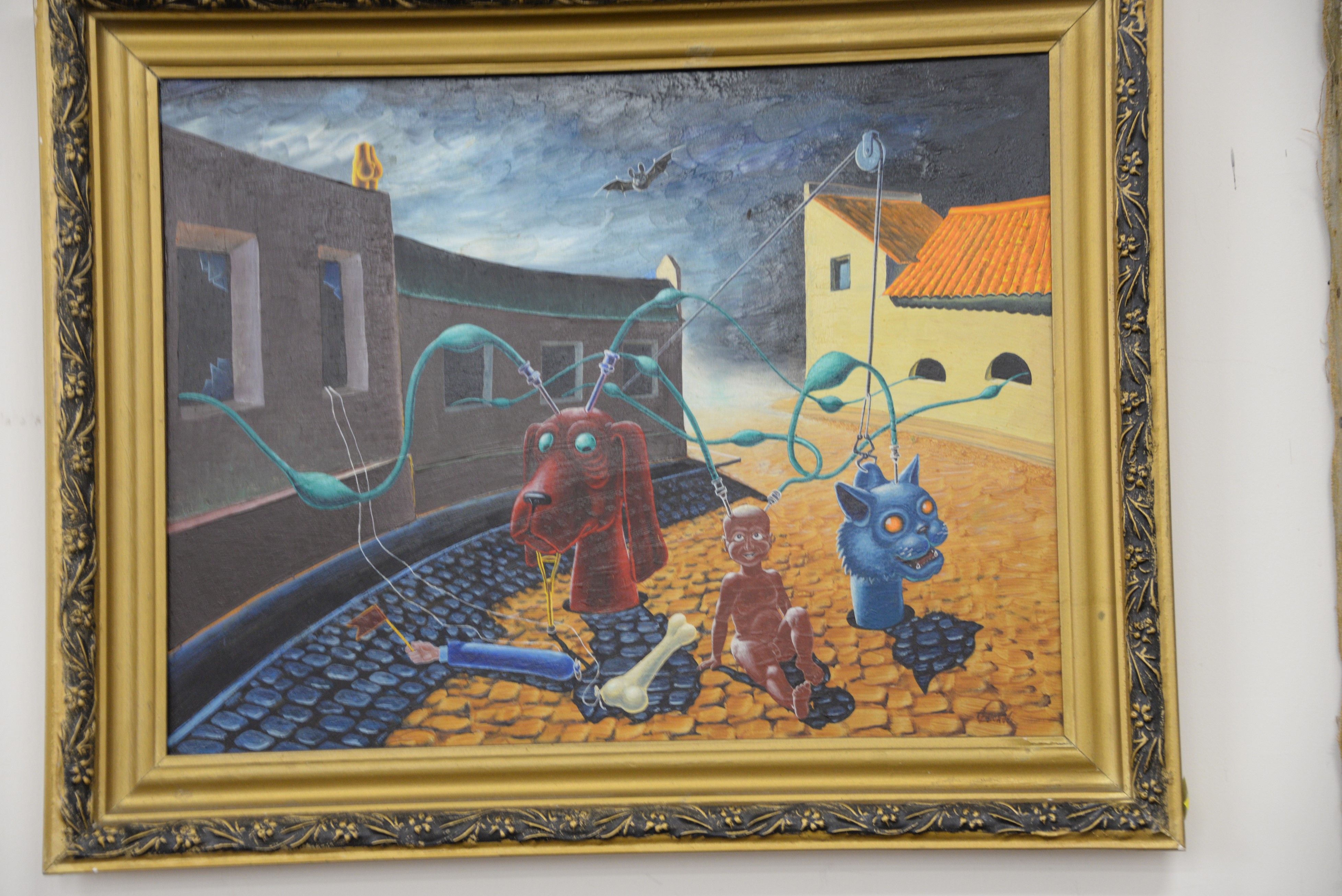 Five piece lot including 20th century town on ocean edge 8 x 10 oil on canvas bust of a boy 20 x 16 and three Russian oil on board Science Fiction abstract paintings, signed indistinctly lower right, 13 x 11, 16 x 20, and 11 x 9.