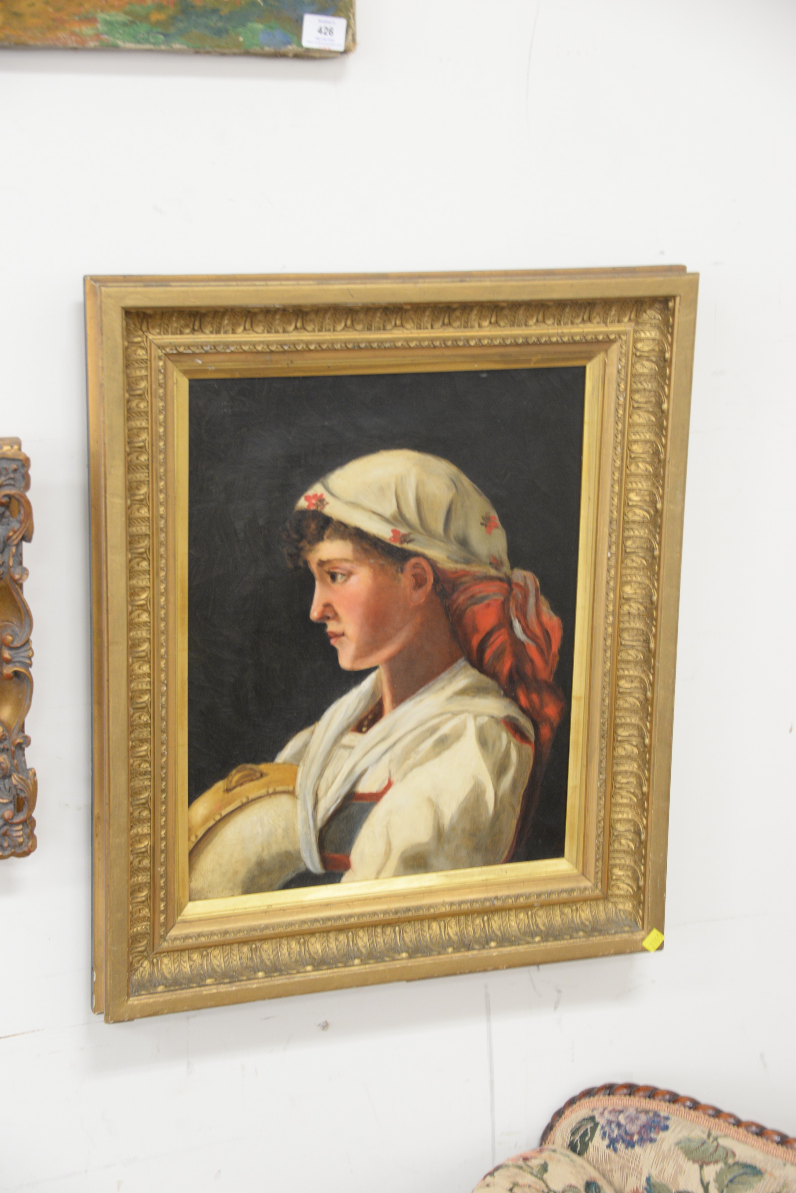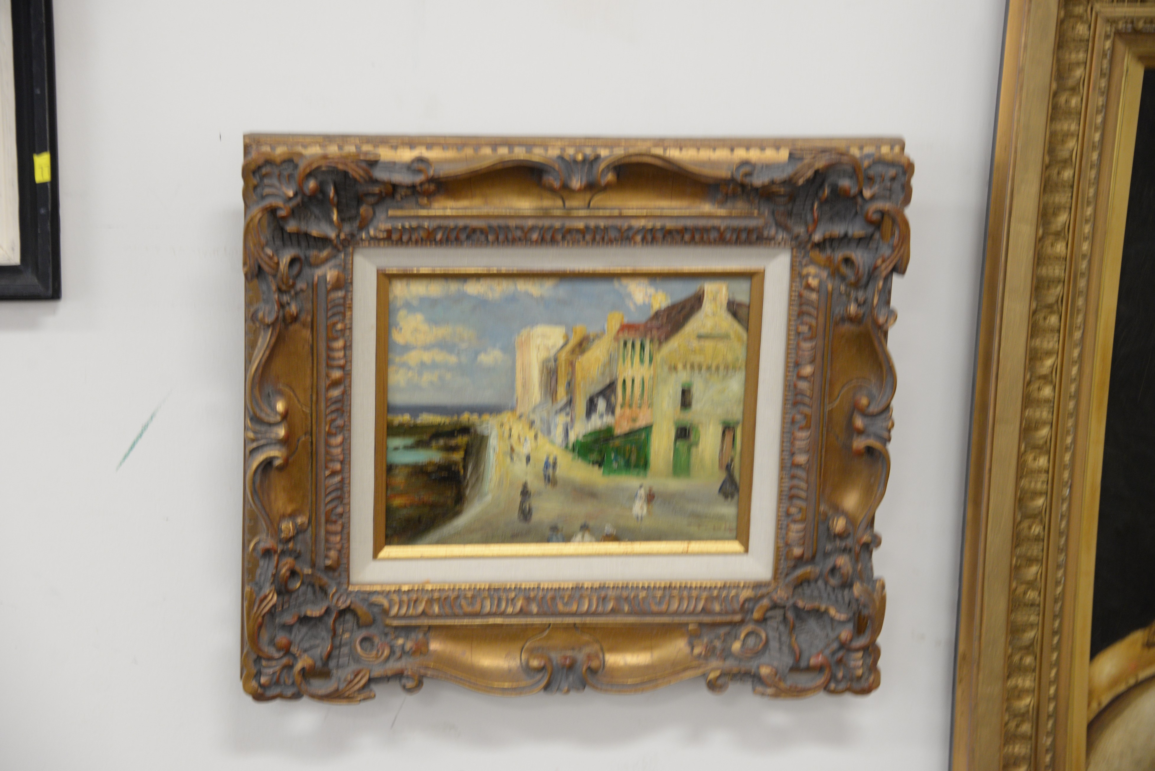 Lot 425: Five piece lot including 20th century town on ocean edge 8 x 10 oil on canvas bust of a boy 20 x 16 and three Russian oil…