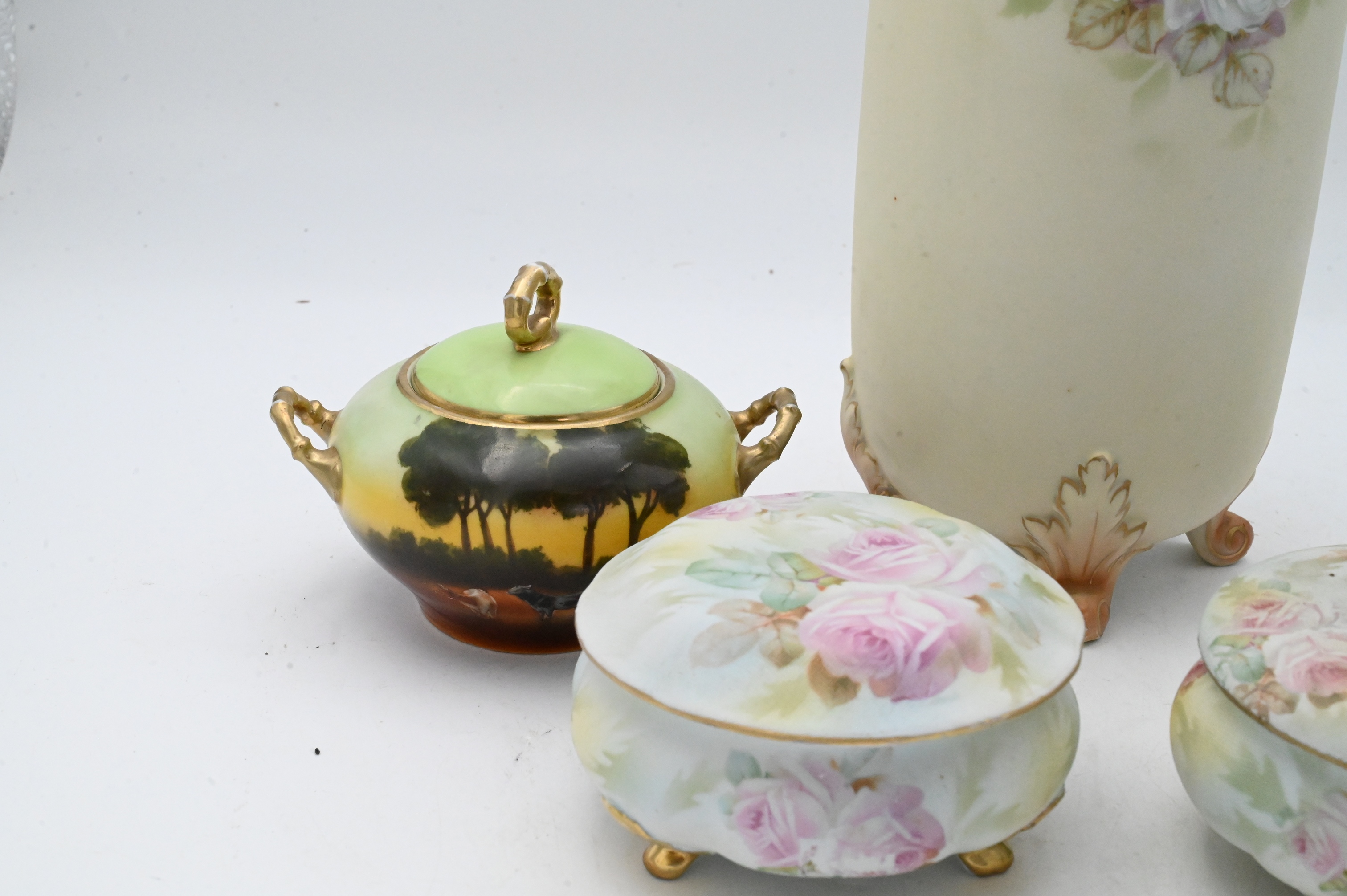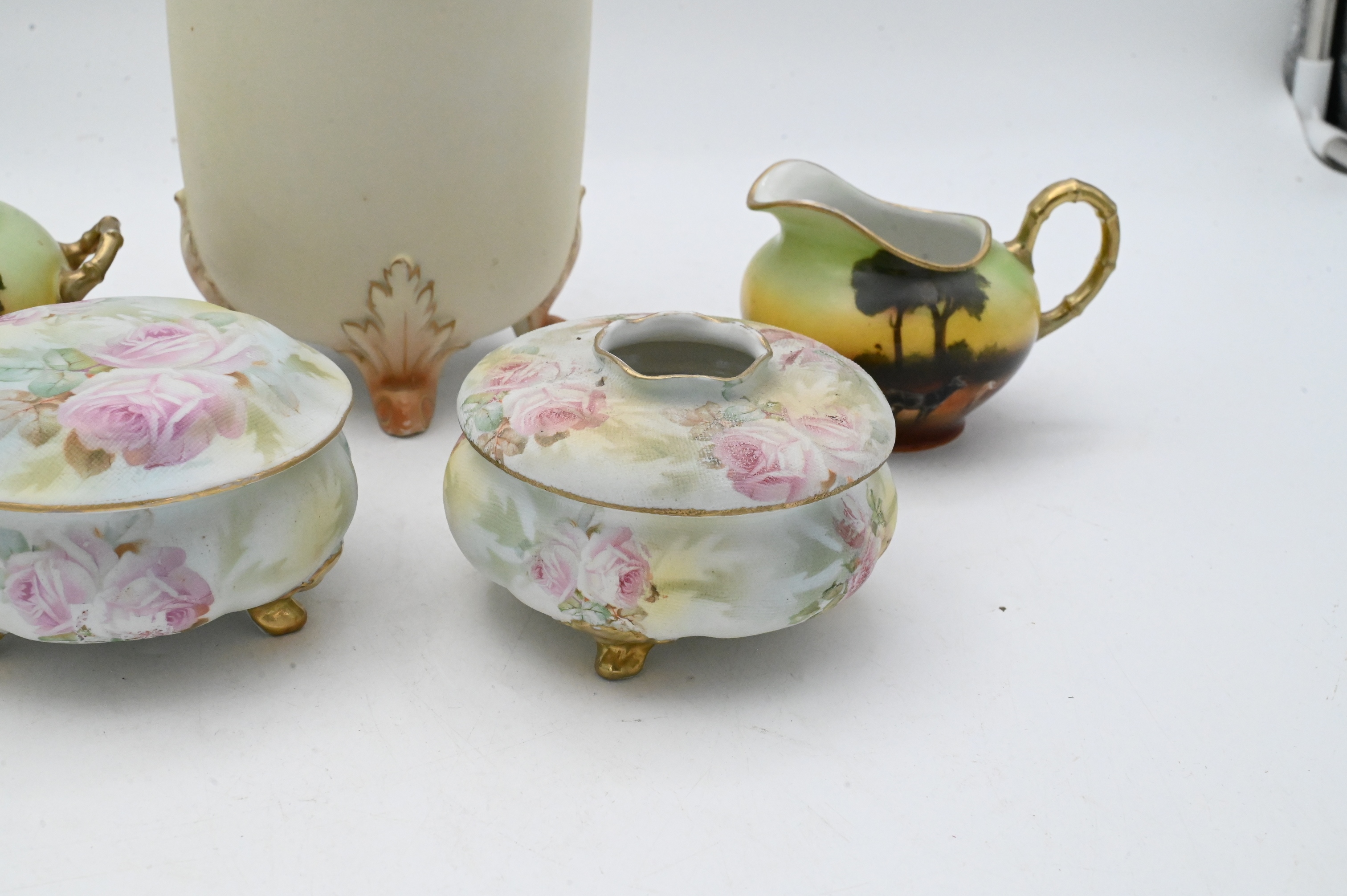 reticulated and scroll footed vase, two rose tapestry covered jars, one cream and one sugar with cow motif