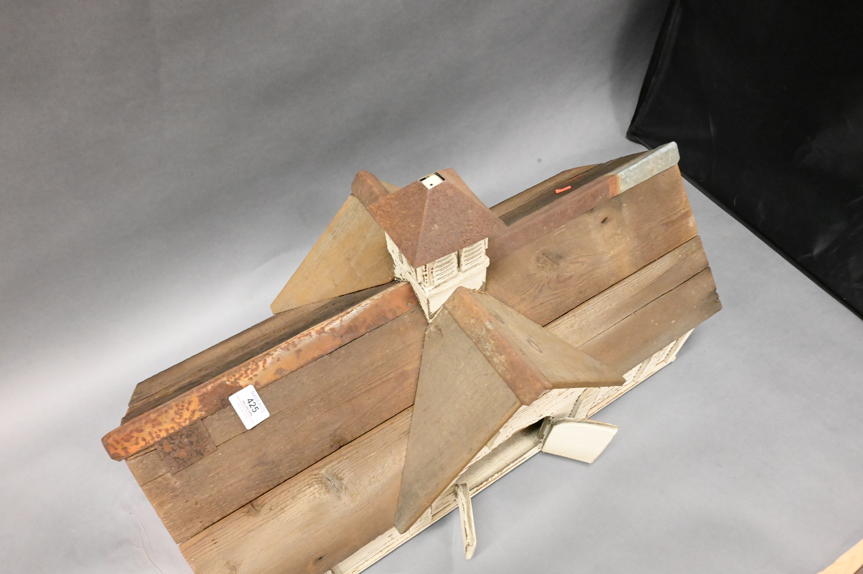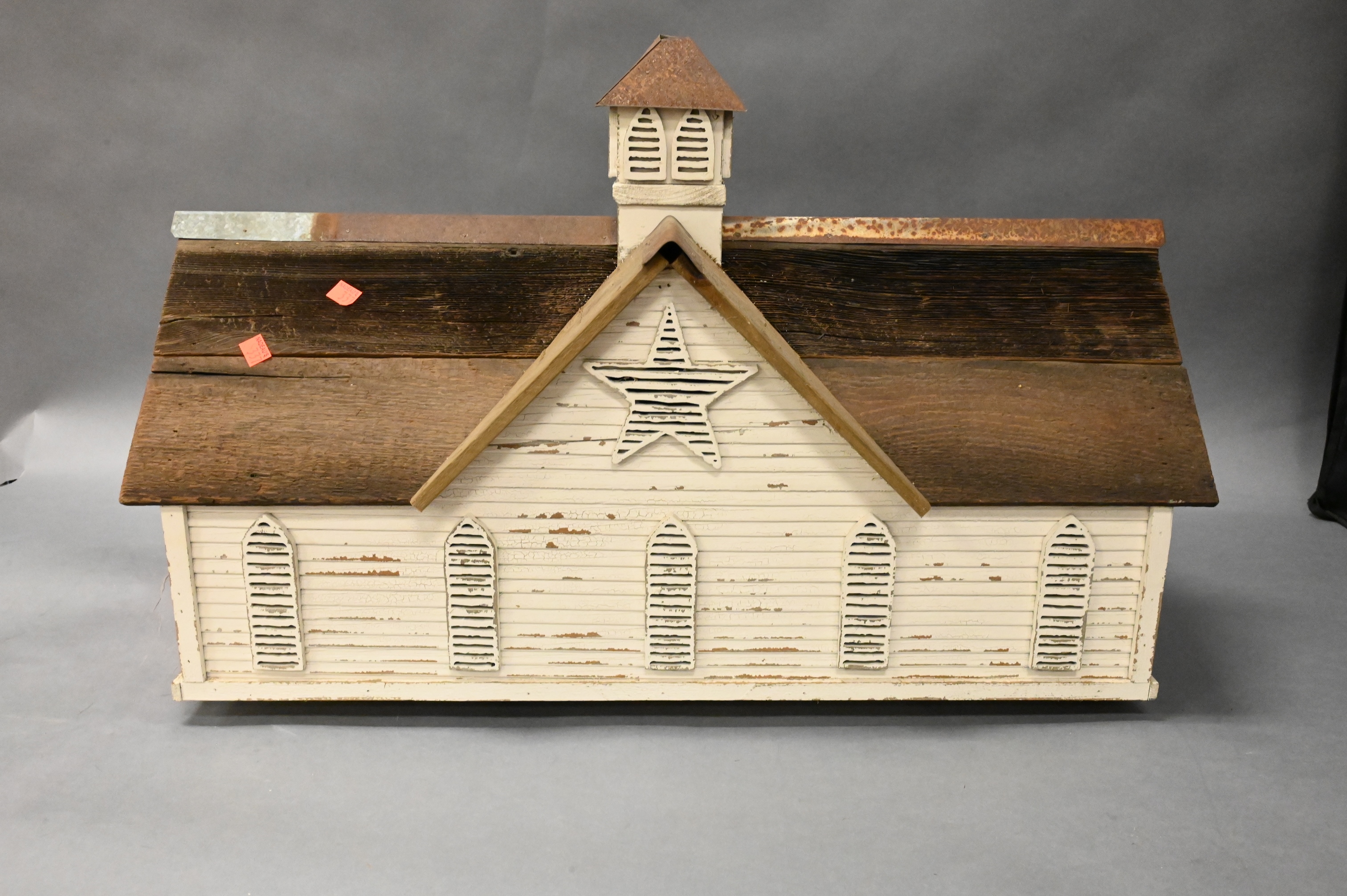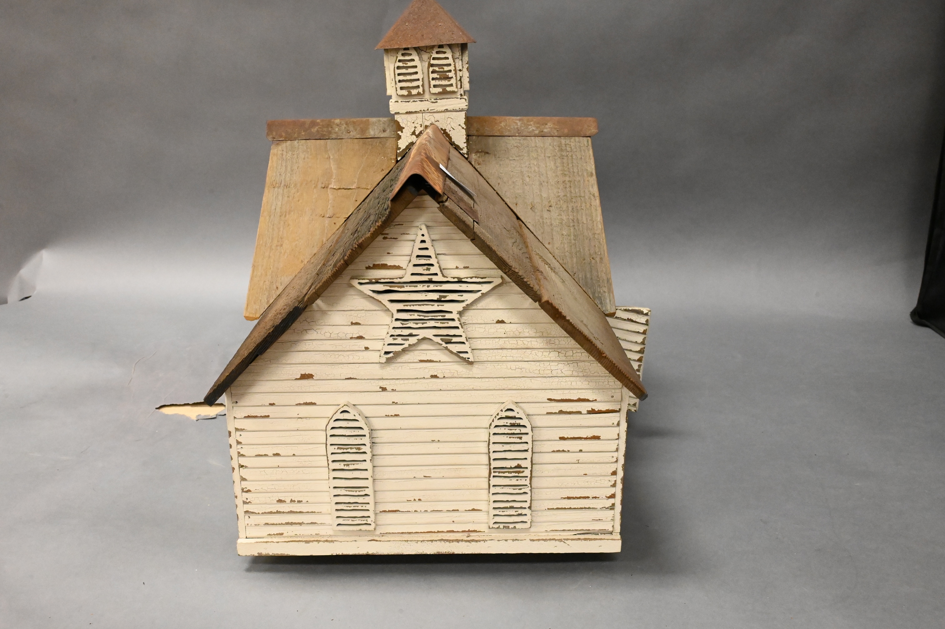 in the form of a barn, having star accents and wood and tin roof, painted white