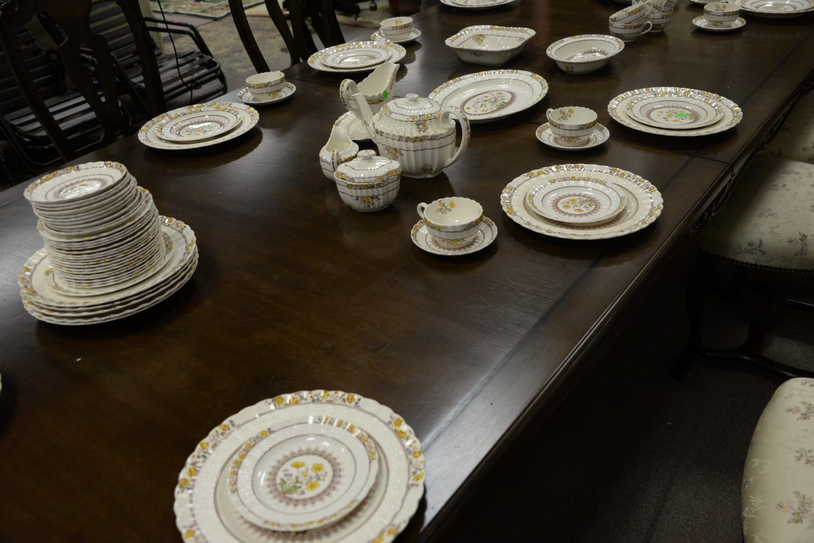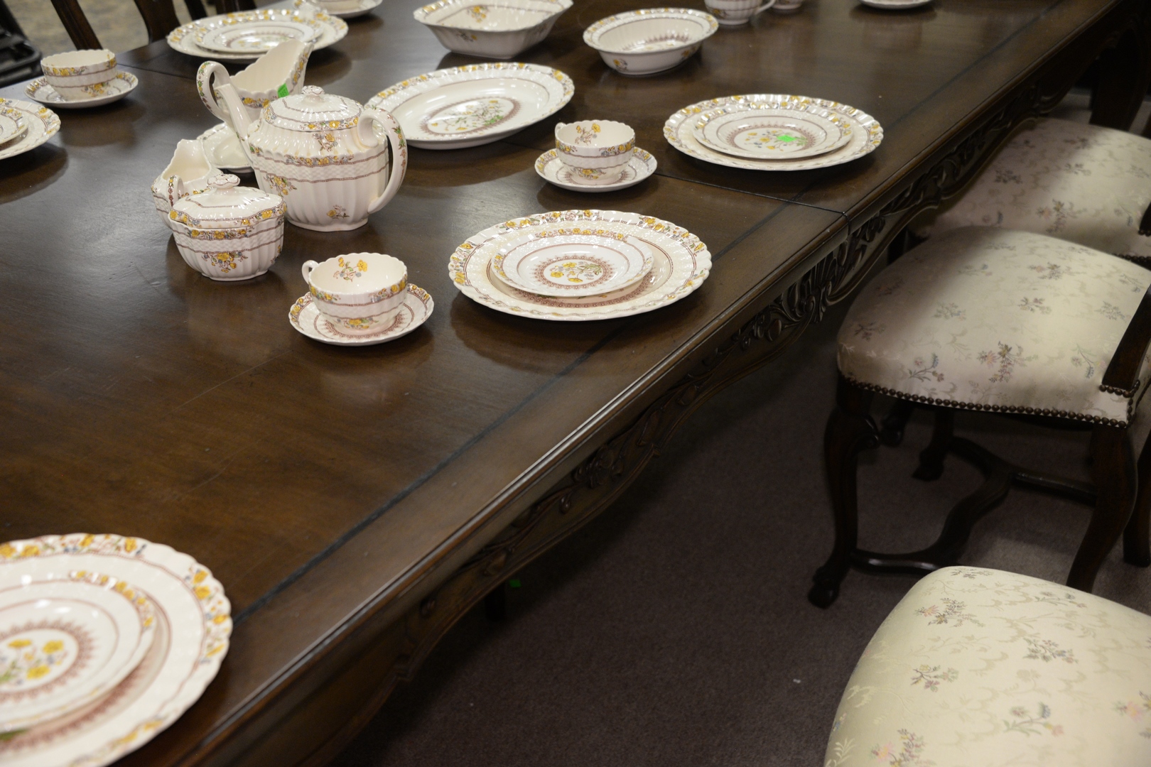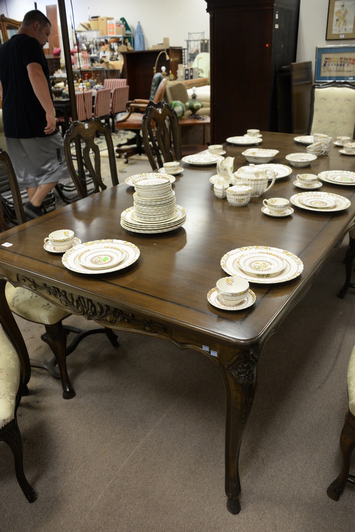 Lot 425: Large Louis XV Style Dining Table, attributed to Auffray and Company Furniture, along with two extra 24″ leaves, open 158 inches, height 30 inches, top 48″ x 110″.