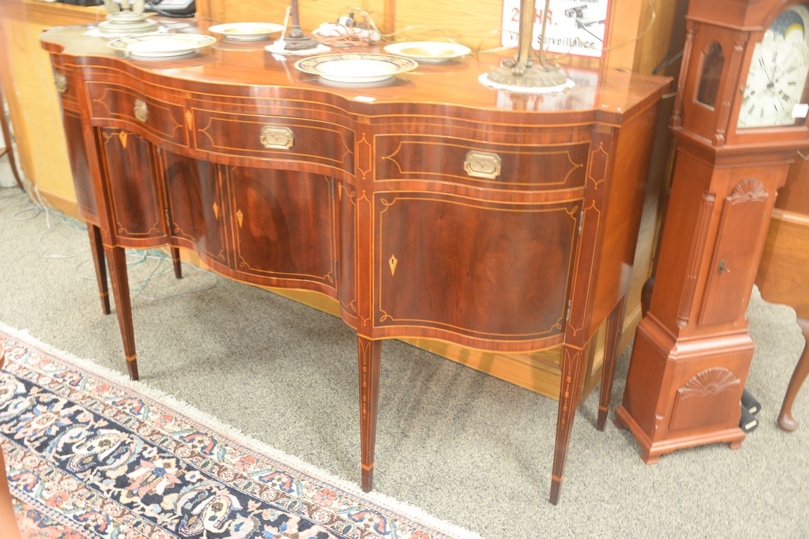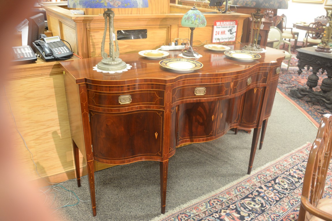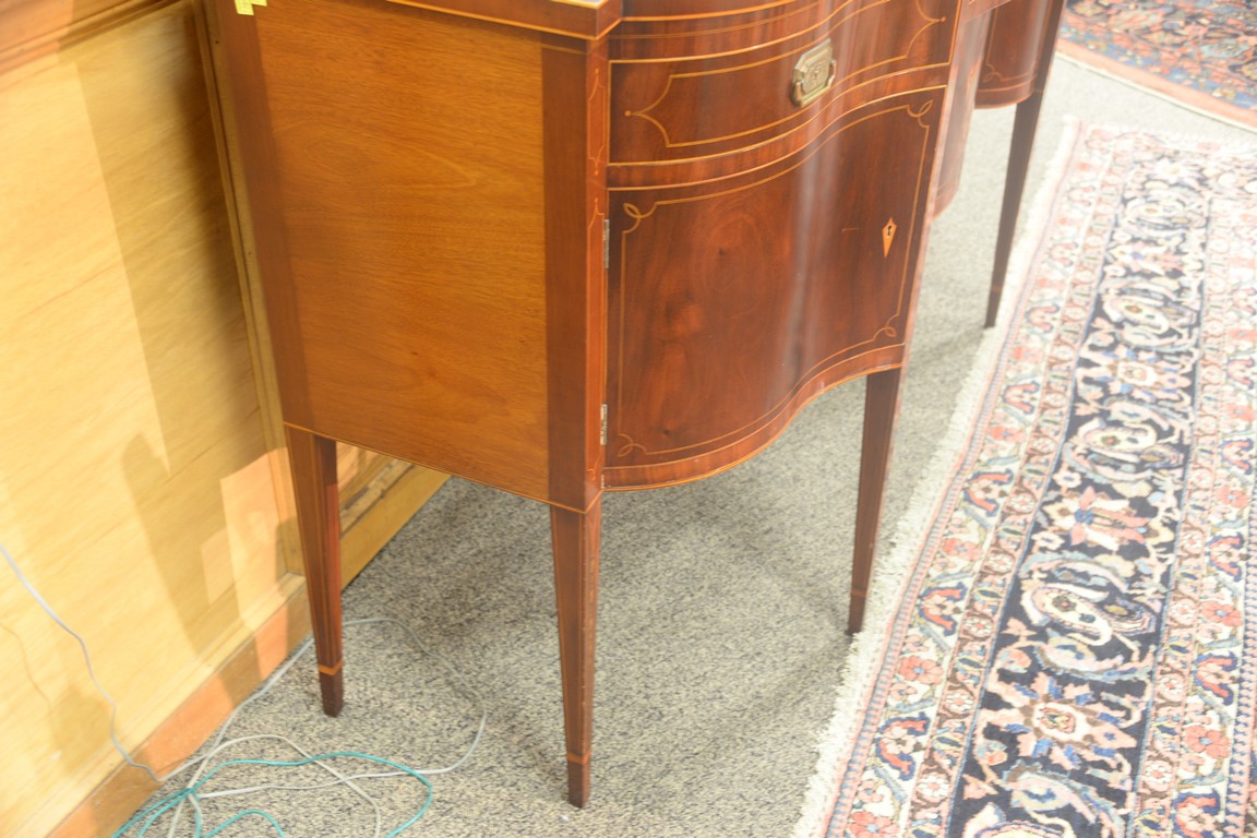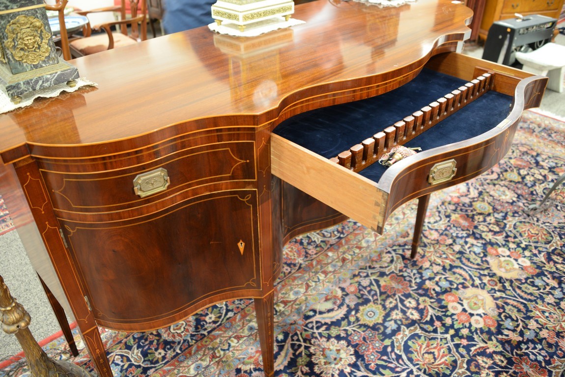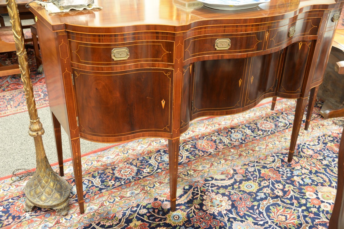 Lot 425: Margolis mahogany sideboard, Federal style with shaped top over conforming case with one center drawer flanked by two drawers over t…