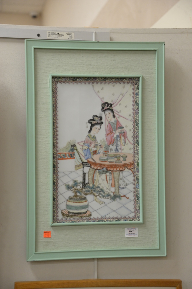Lot 425: Pair of Chinese Painted Porcelain Tiles, one having two women and a pagoda, the other depicting two women in an interior scene, in m…
