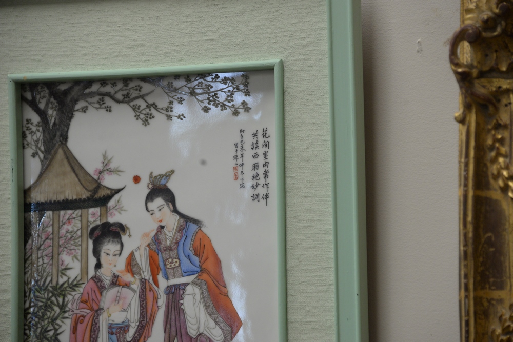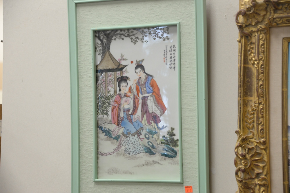 Pair of Chinese Painted Porcelain Tiles, one having two women and a pagoda, the other depicting two women in an interior scene, in matching frames, sight size 16″ x 9 1/2″.