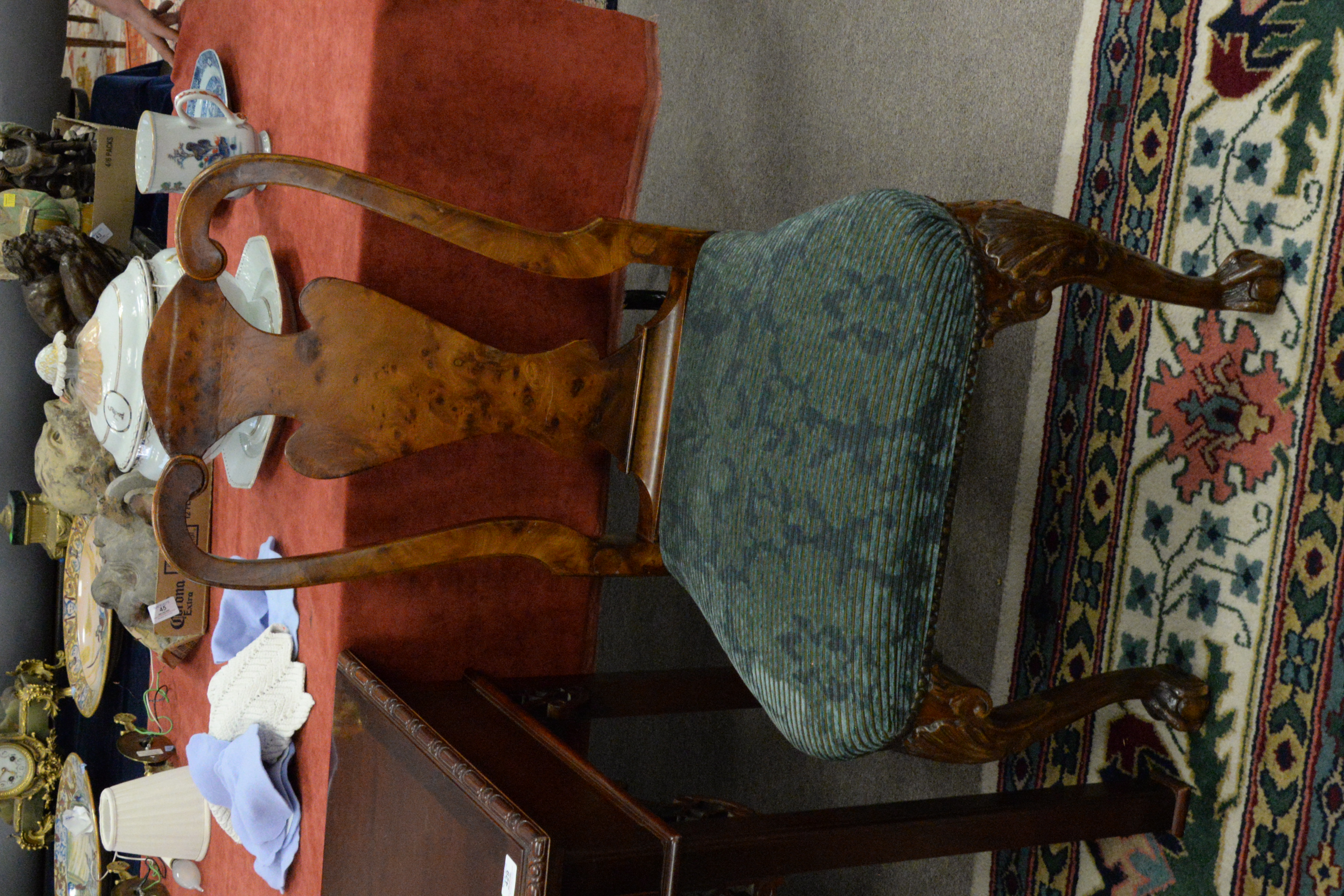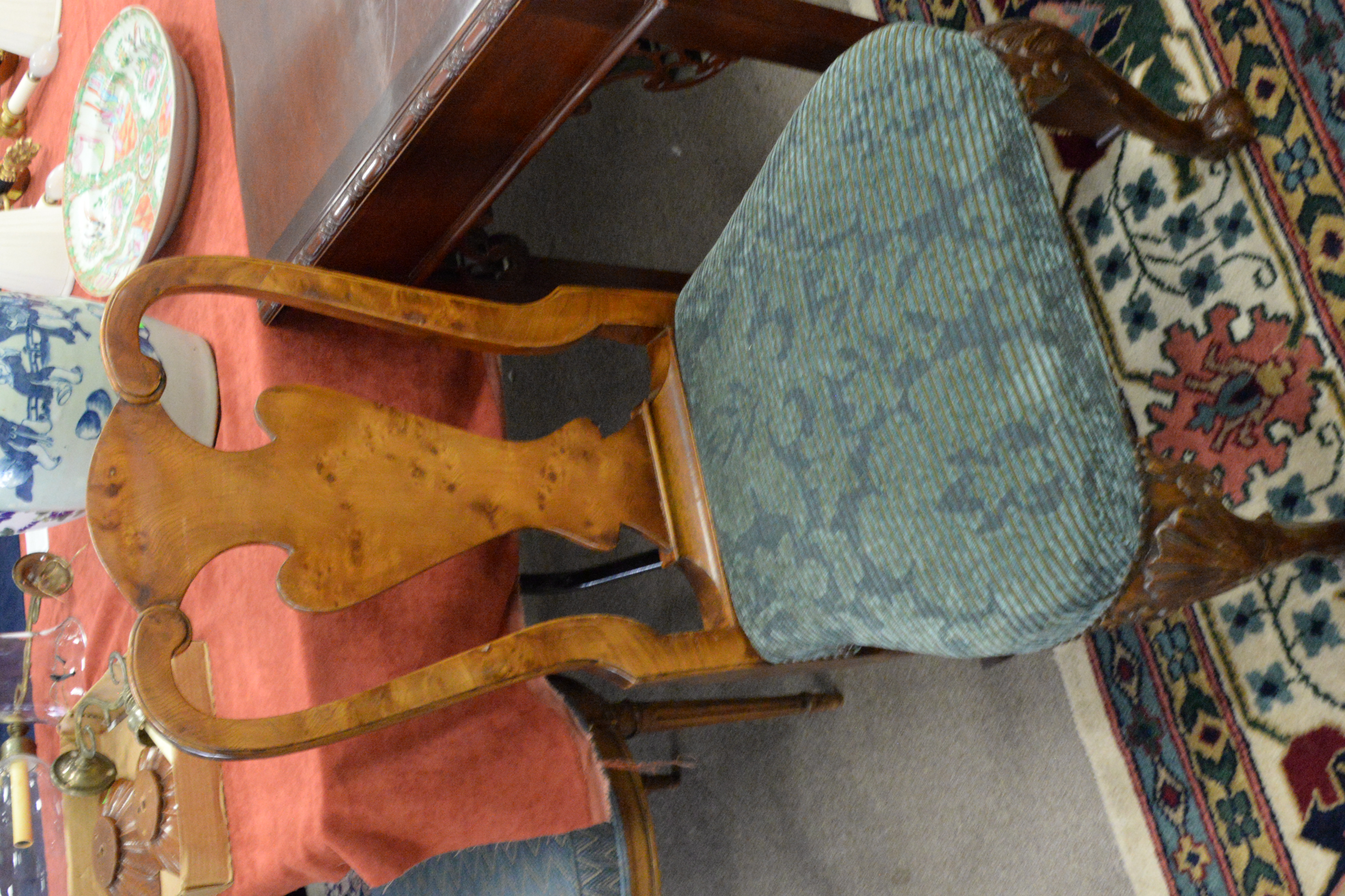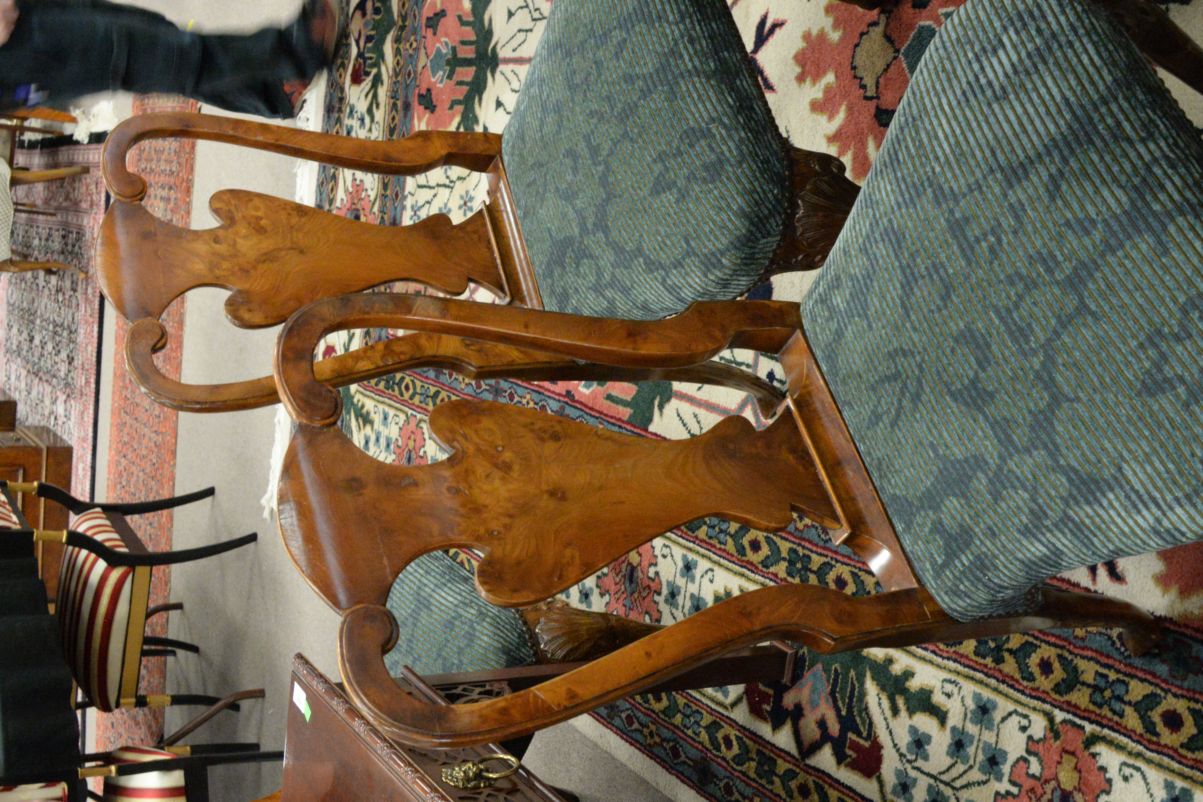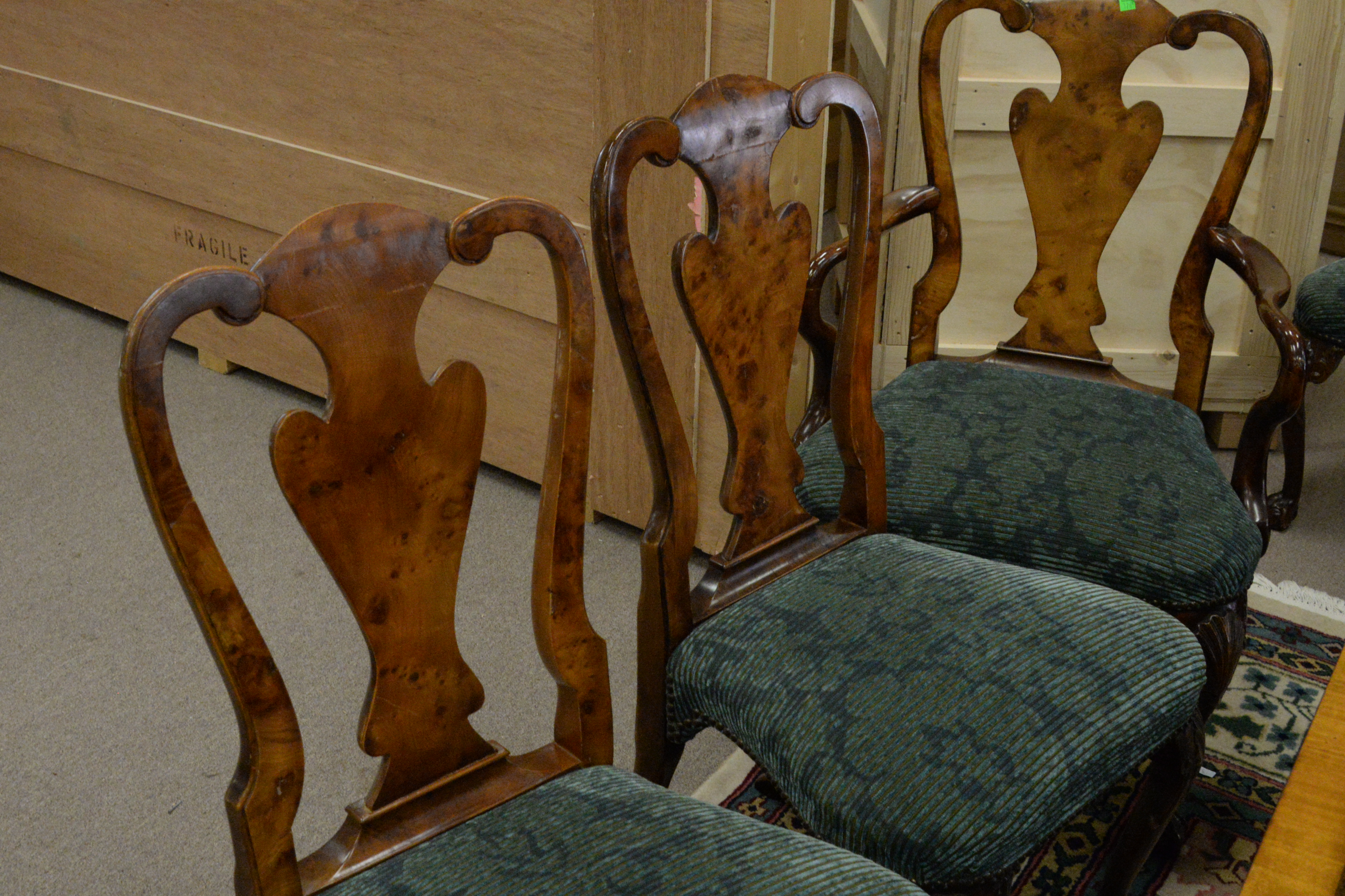 Set of 10 Queen Anne Style Dining Chairs, burlwood, two arm, eight side chairs, height 39 inches, diameter 19 1/2 inches, width 22 inches