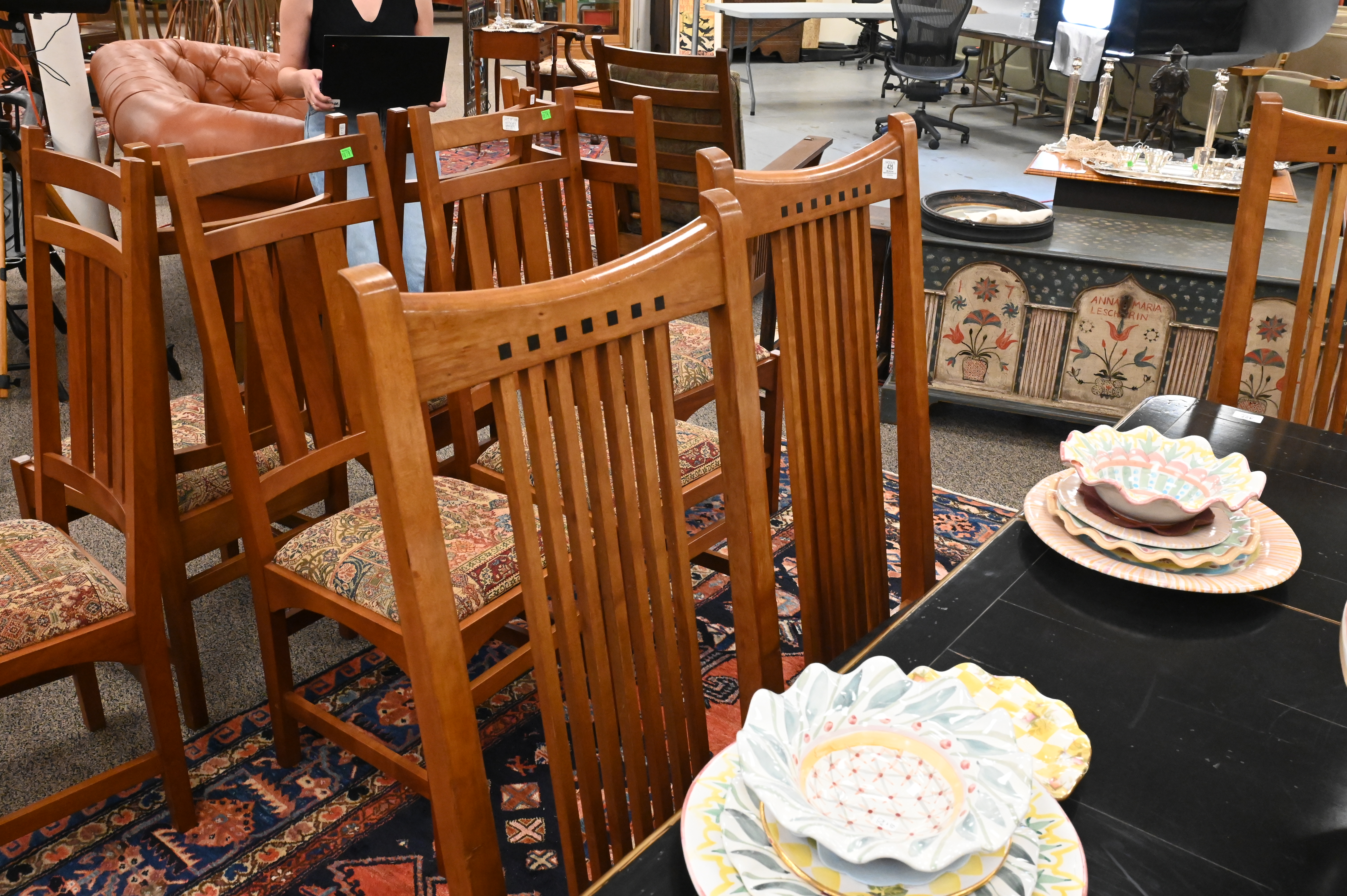 Lot 425: Set of Six Harvey Ellis Design Stickley Tall Spindle Back Inlaid Dining Chairs