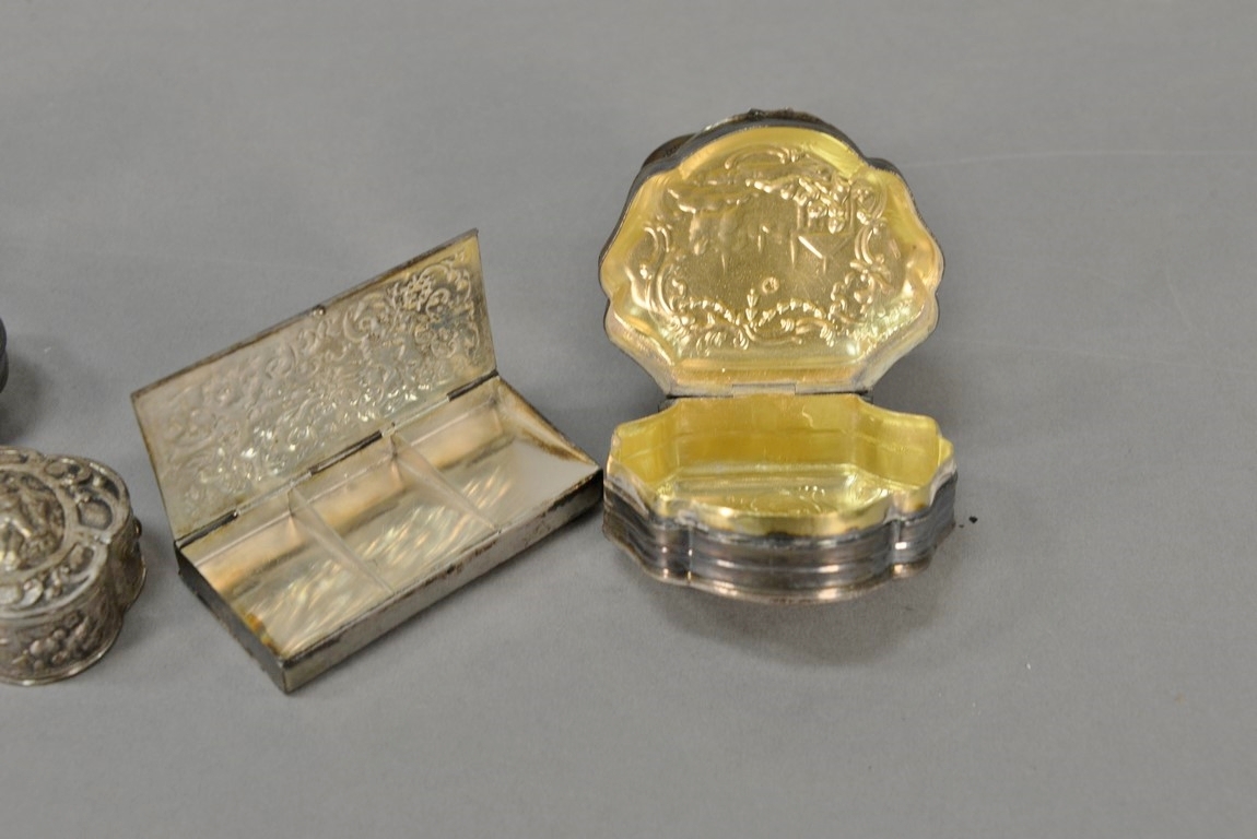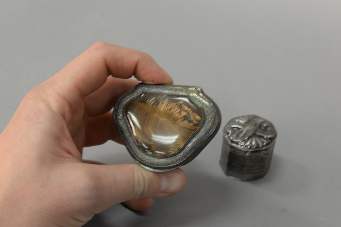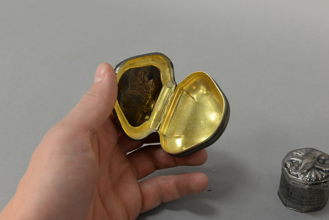 Six silver boxes including box with cover mounted with polished stone. ht. 1/2in. wd. 2 3/4in. dp. 2in.