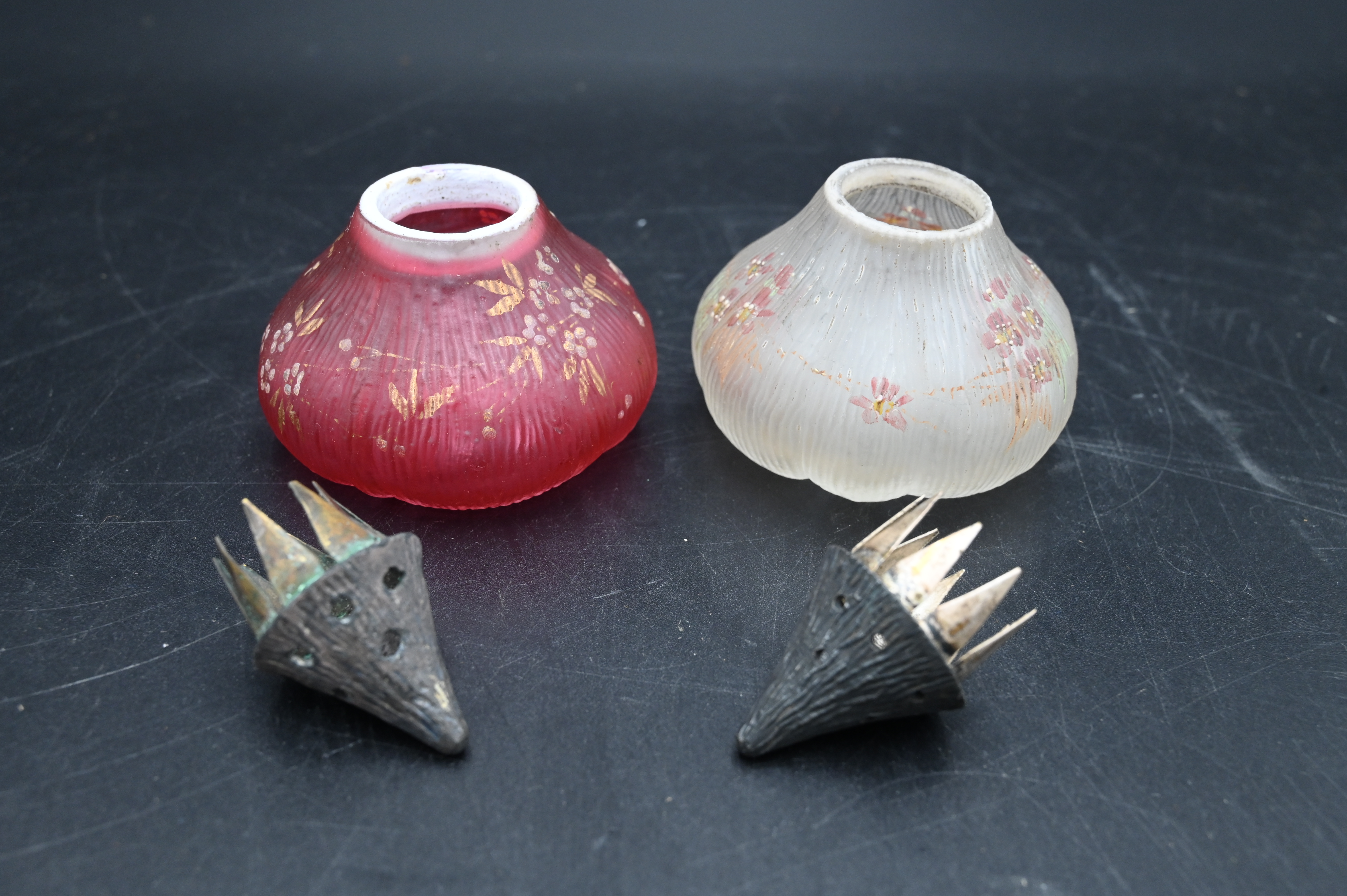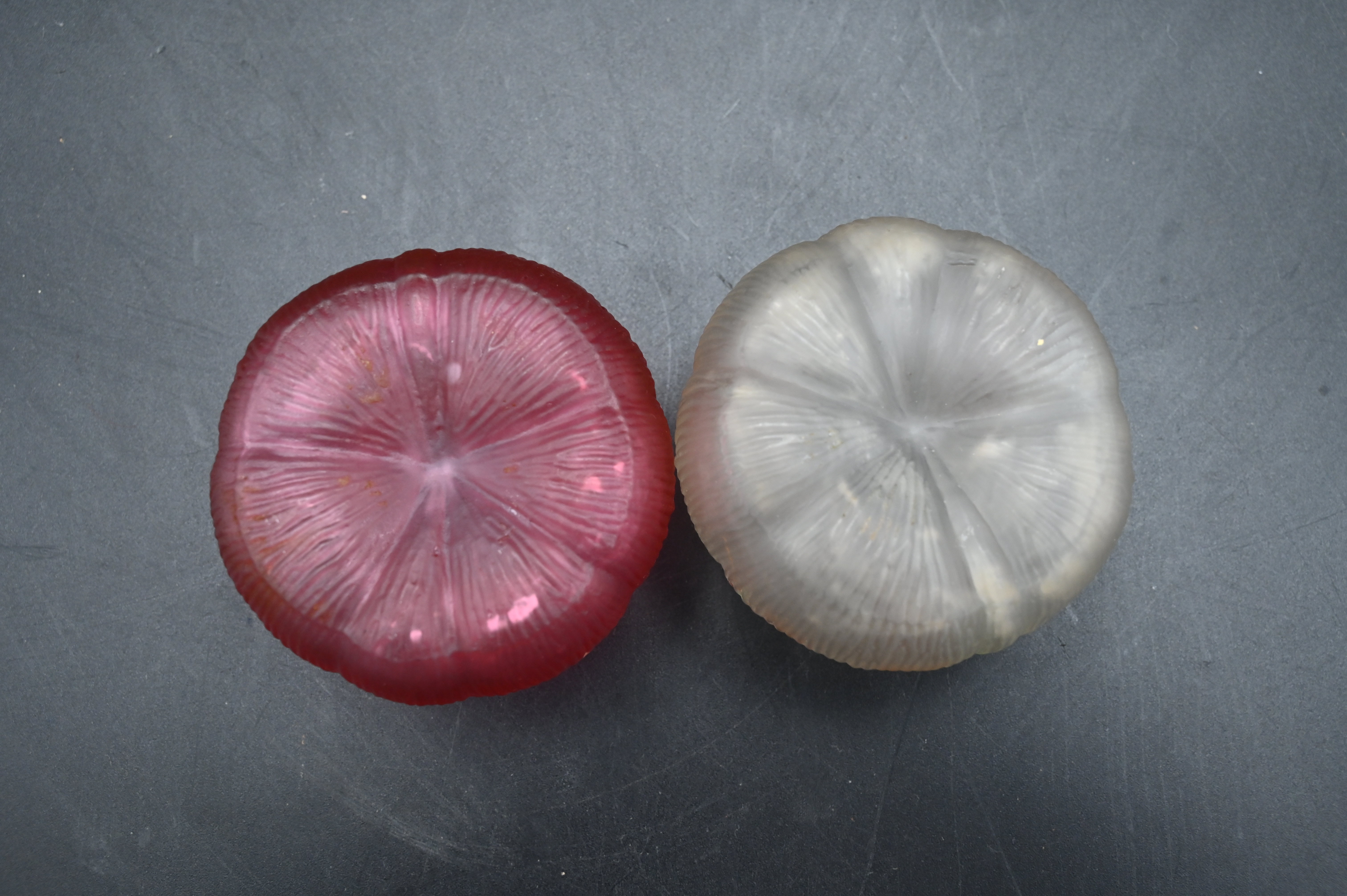 Two Mt. Washington Glass Salt Shakers, one clear, one red bark, height 2 1/2 inches.