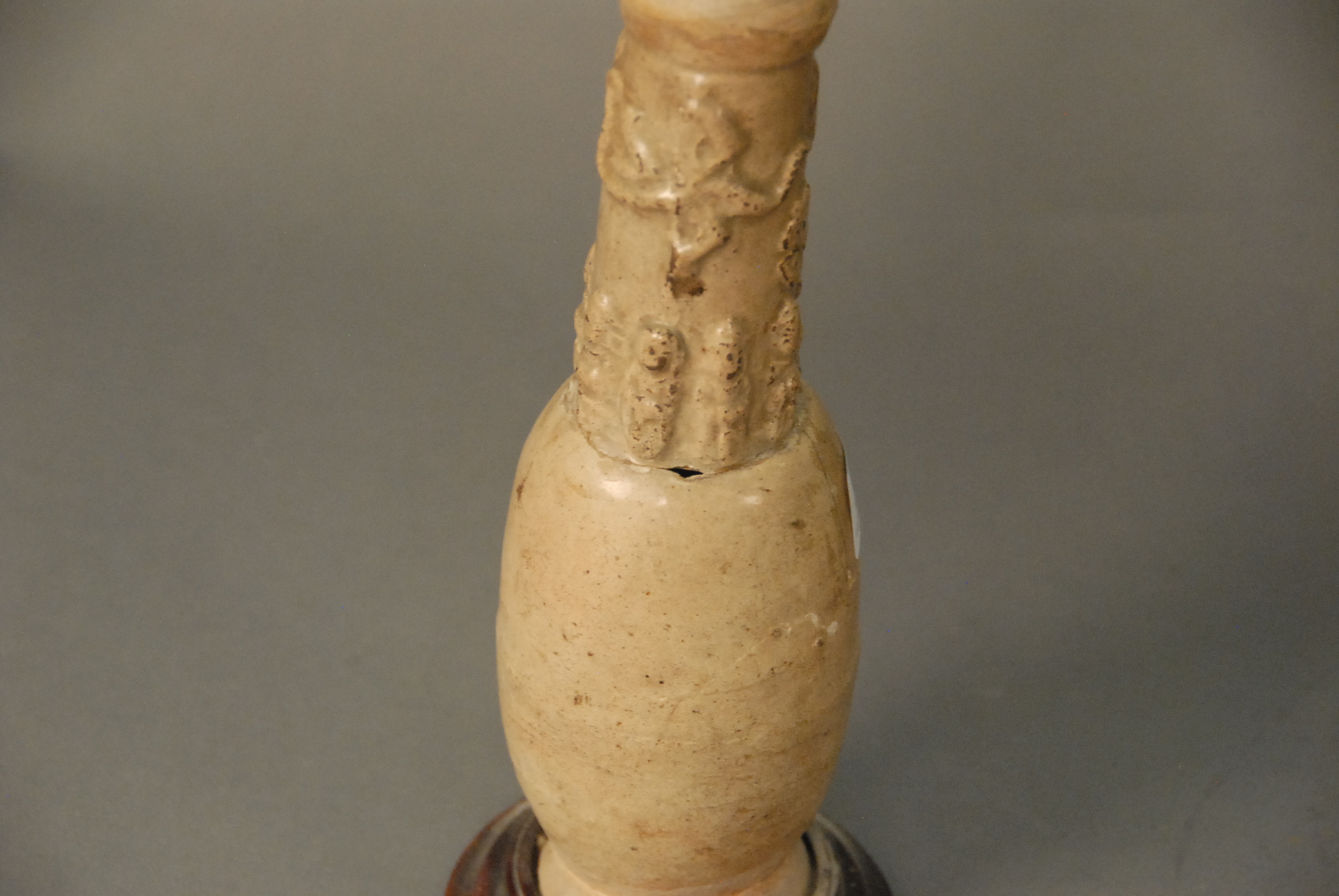 Lot 426: Chinese white glazed funerary vase, probably Song Dynasty, slender form with figures and dragon in relief around the neck as is. ht. 12 1/2 in. Provenance: Property from The Estate of Margaret Oliphant of Old Lyme, Connecticut