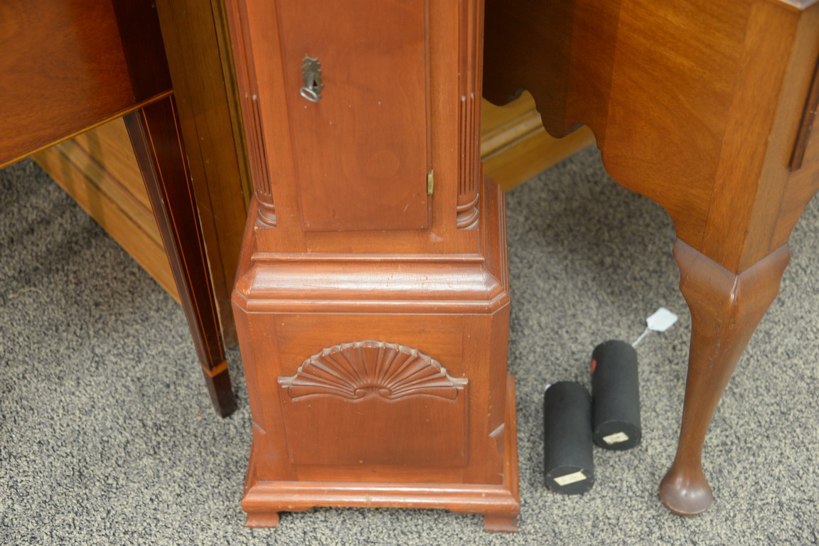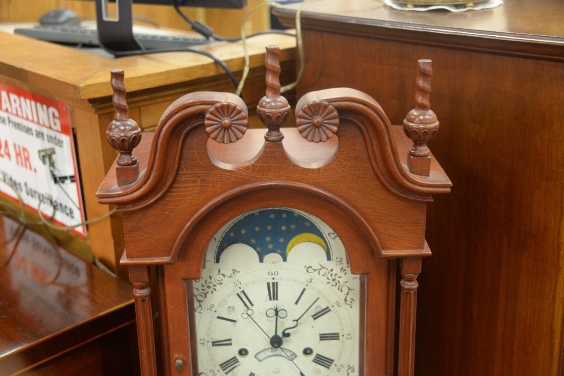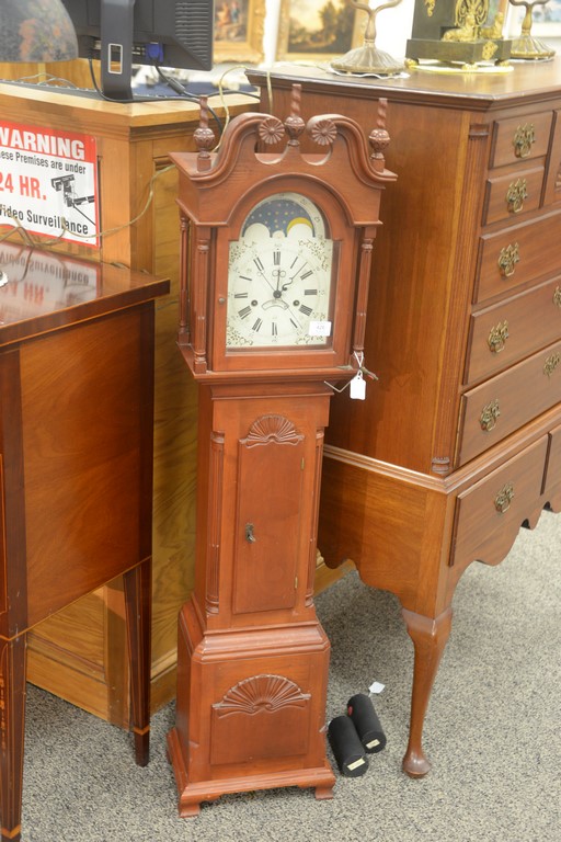 Custom cherry grandmother’s clock with shell carved case, moon phase dial, and brass works. ht. 55in., wd. 12in.