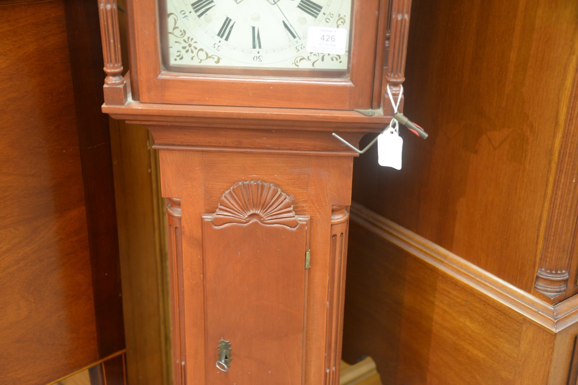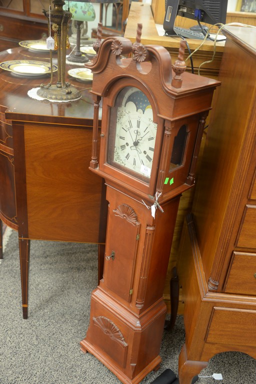 Lot 426: Custom cherry grandmother’s clock with shell carved case, moon phase dial, and brass works. ht. 55in., wd. 12in.
