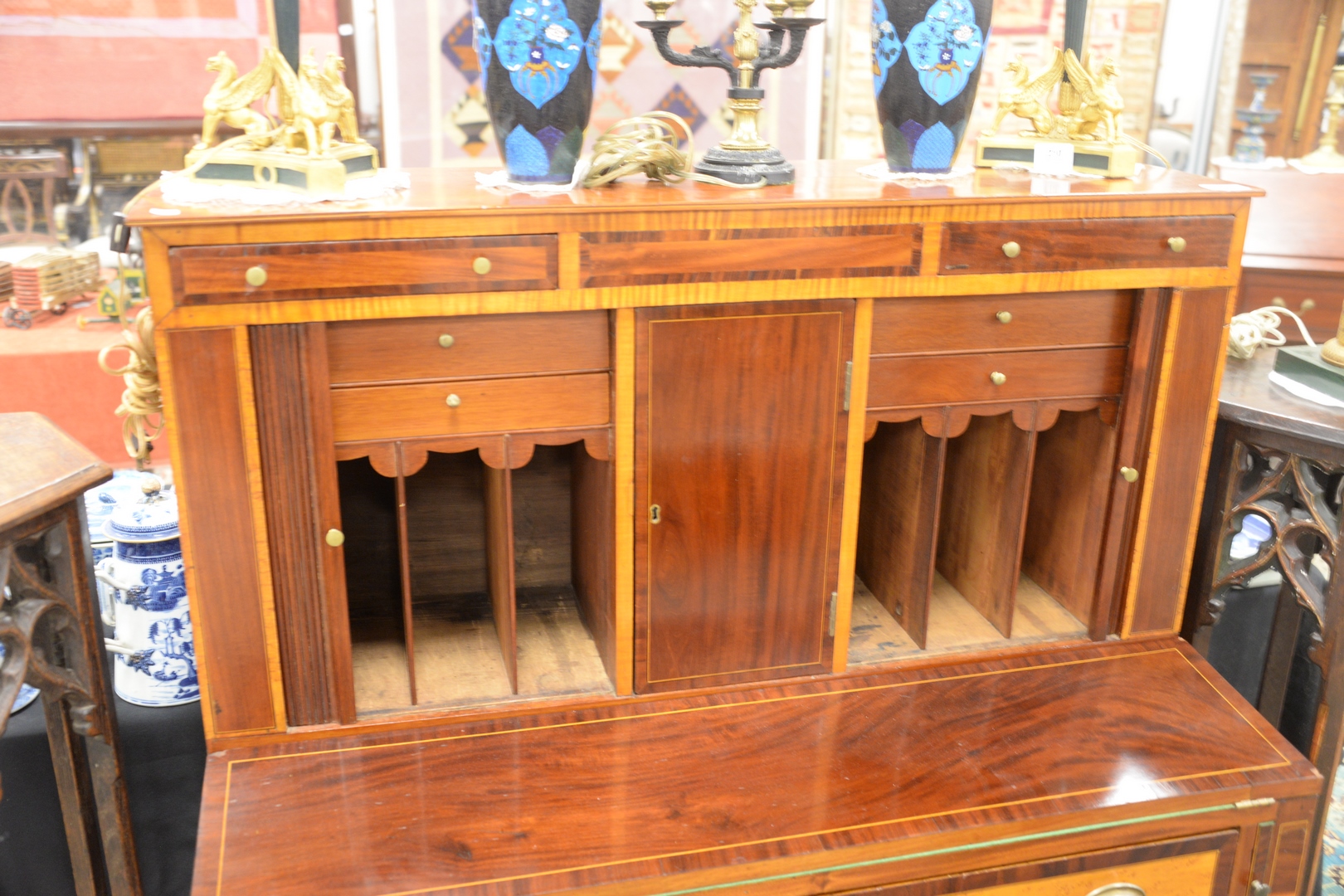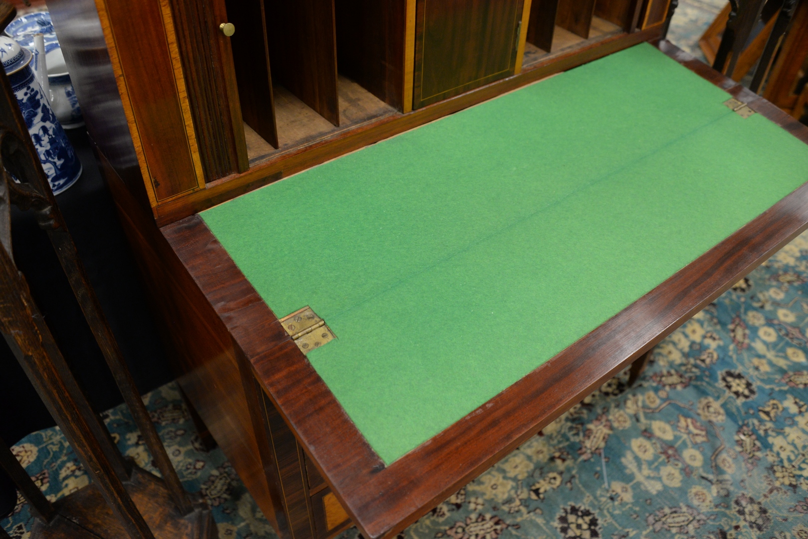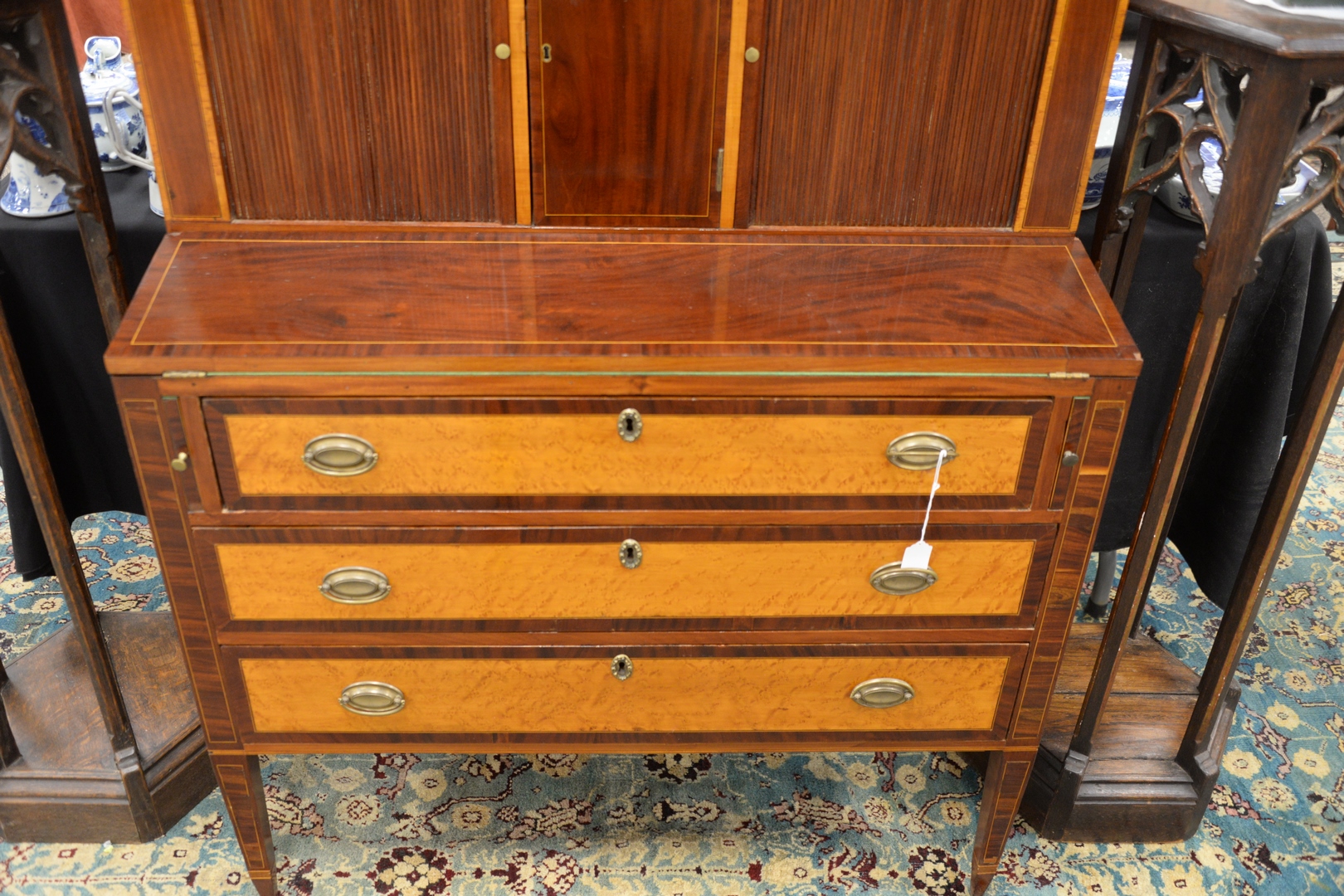Lot 426: Federal Mahogany and Birdseye Maple Tambour Desk in two parts, upper section with drawers and tambour doors on lower section with flip lid writing surface, over three drawers with birdseye maple fronts all on signed tapered legs, circa 1800, height 5