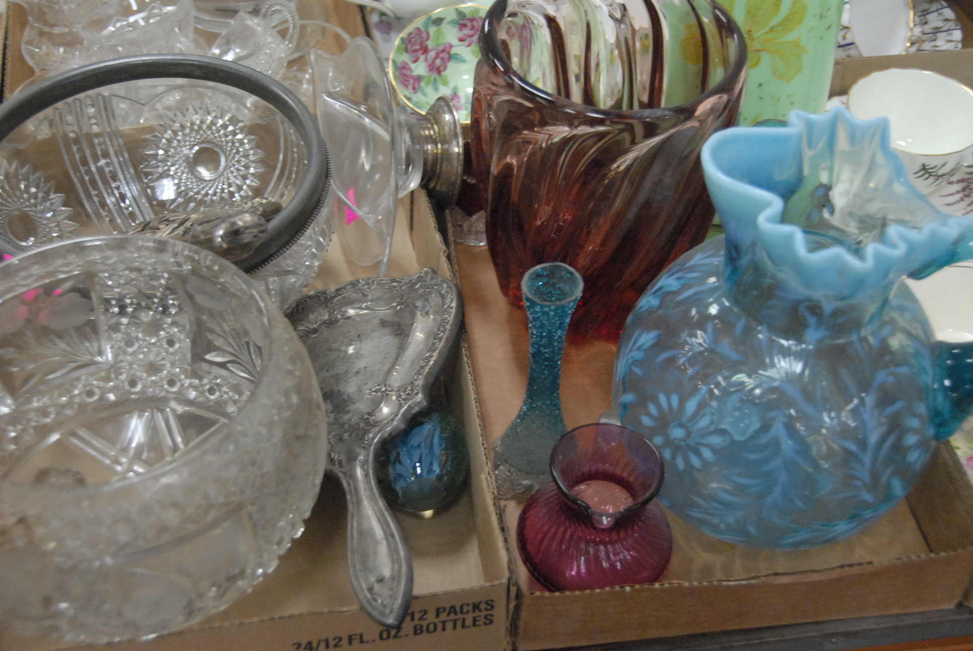 Lot 426: Five box lots of clear glass and colored glass to include sterling weighted mirror, candlesticks, stems, bowls, vases, etc.