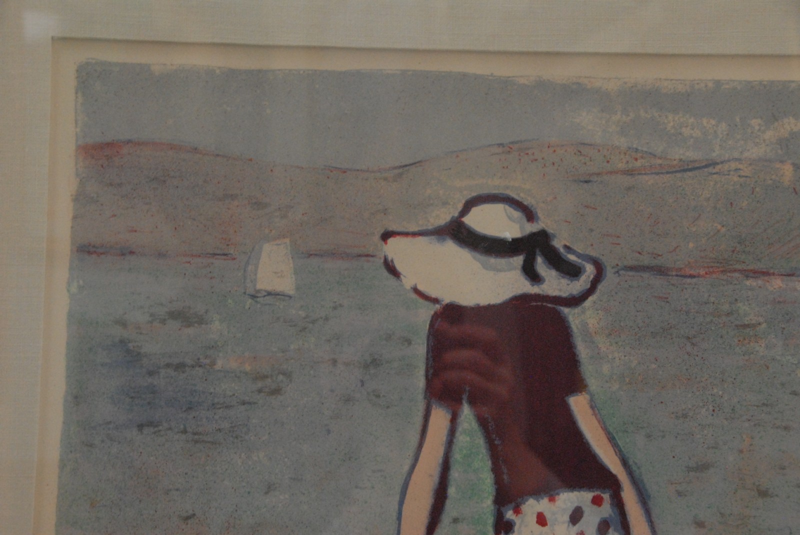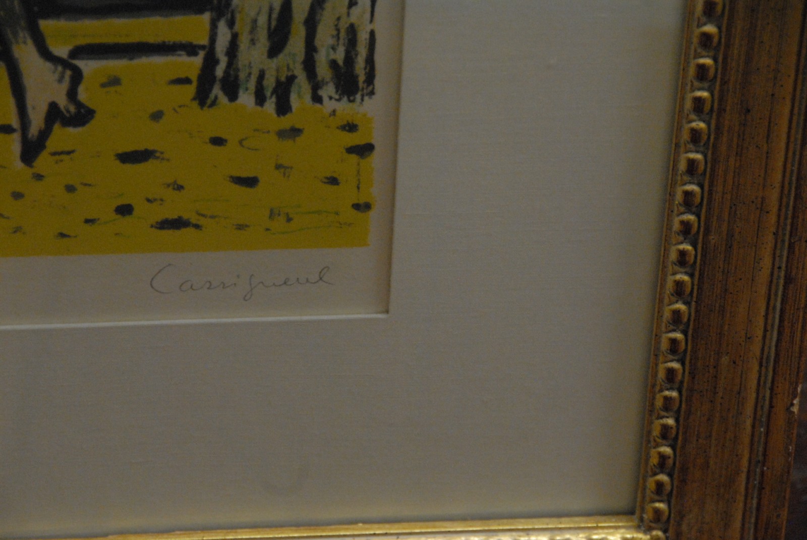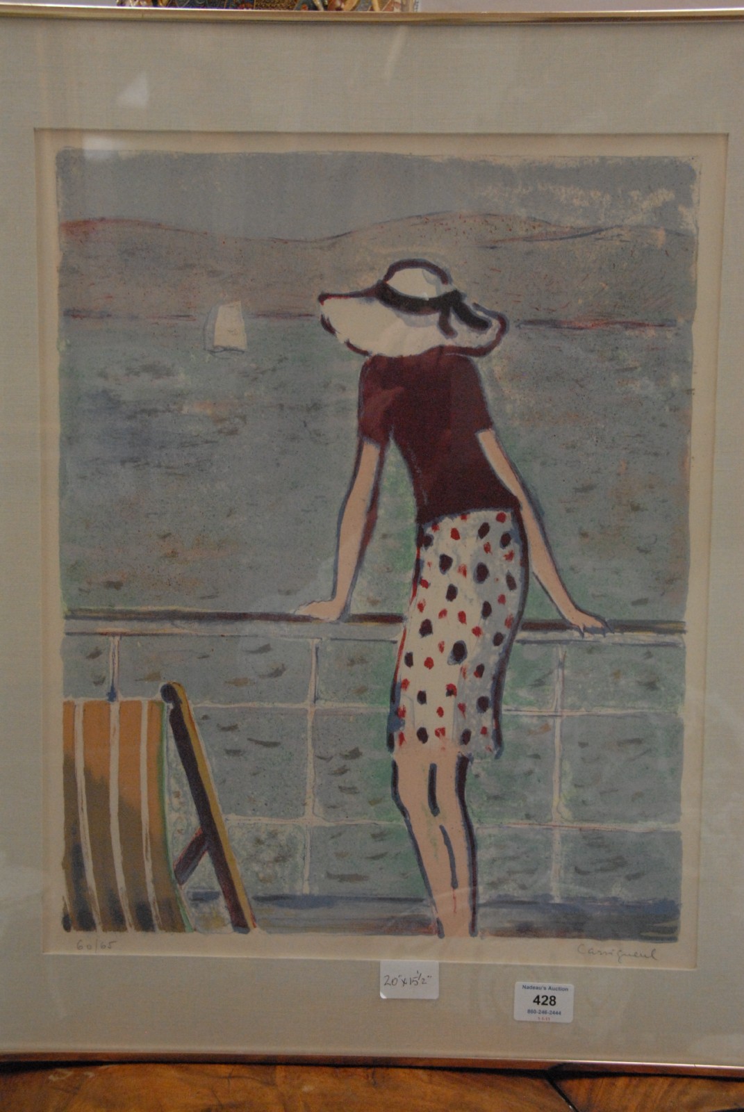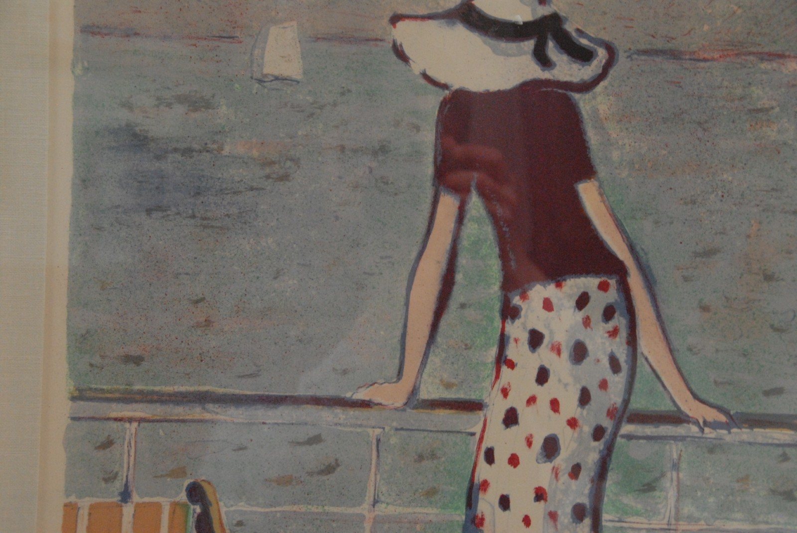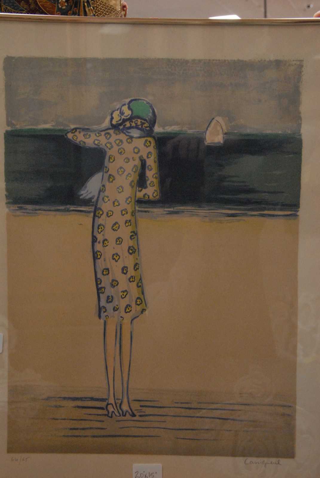 Group of three Jean-Pierre Cassigneul b 1935 LADY WITH DOGS colored lithograph signed lower right Cassigneul numbered lower left 74/120, DEVANT LA MER LES PROMENEUSES colored lithograph signed lower right Cassigneul numbered lower left 64/65 and LES PROMENEUSES SUR LE PONT colored lithograph signed lower right Cassigneul numbered lower left 60/65.