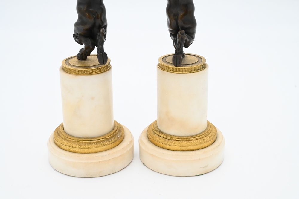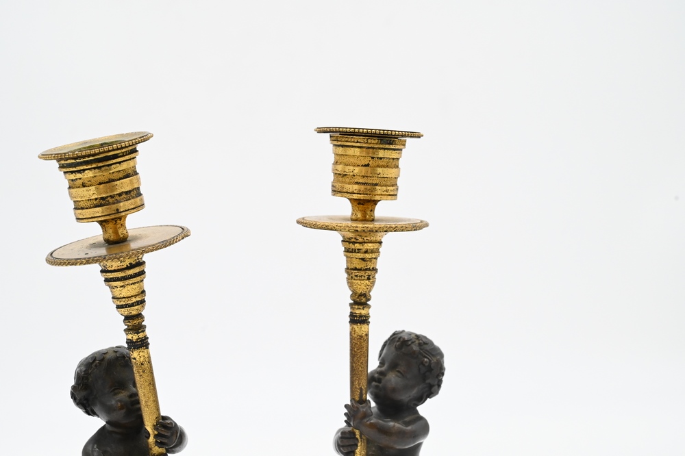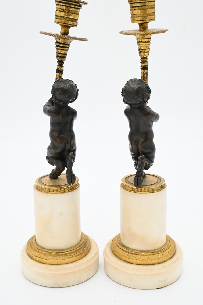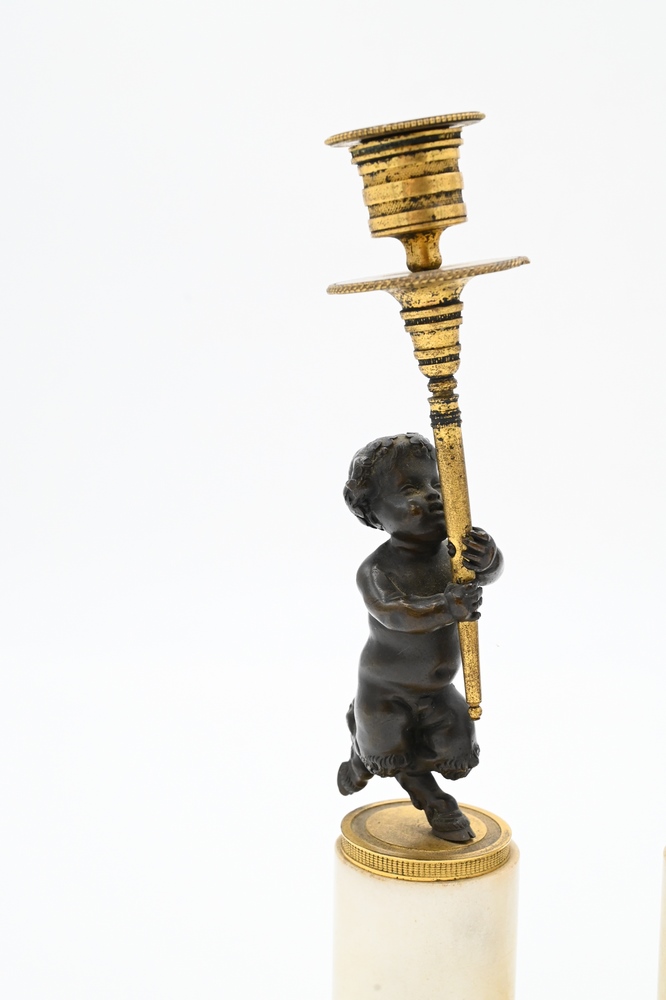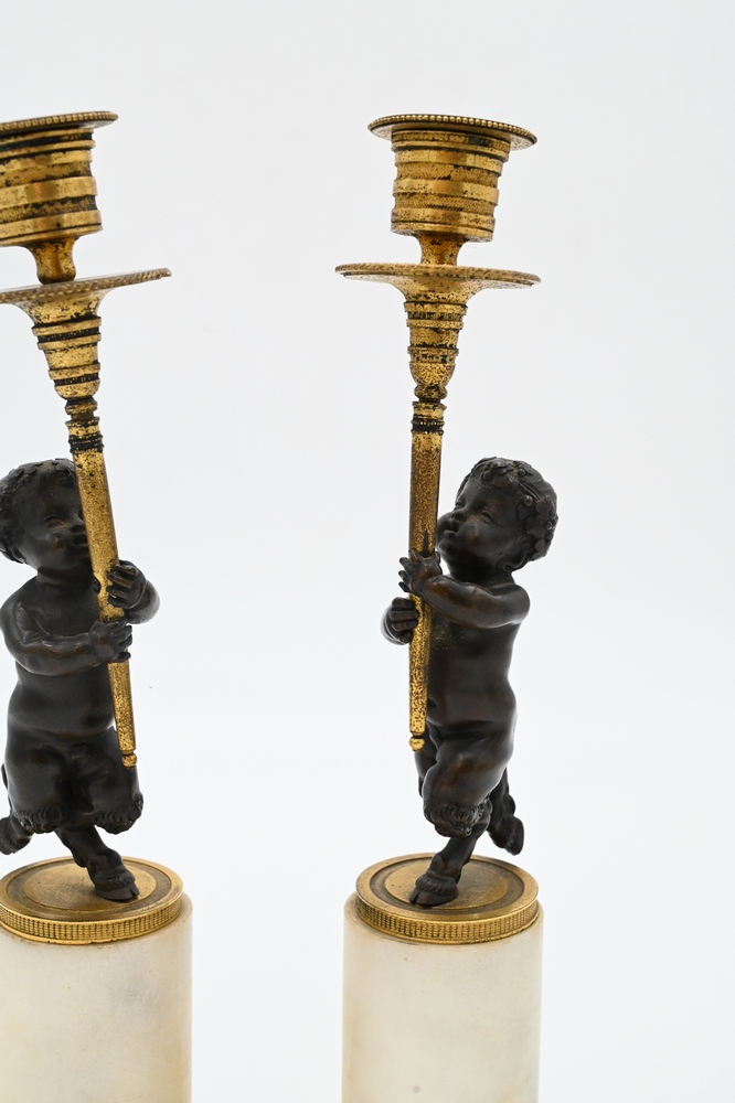 Lot 426: Pair of French Bronze and Marble Figural Candlesticks, having bronze putti with hoof feet holding gilt bronze candlesticks on white …