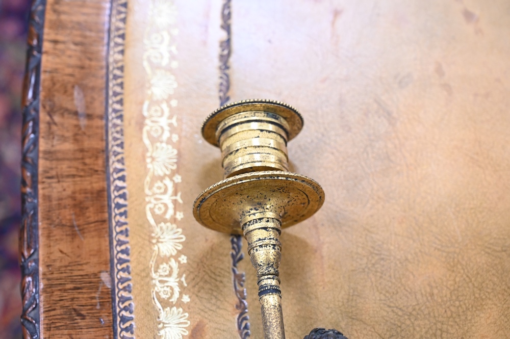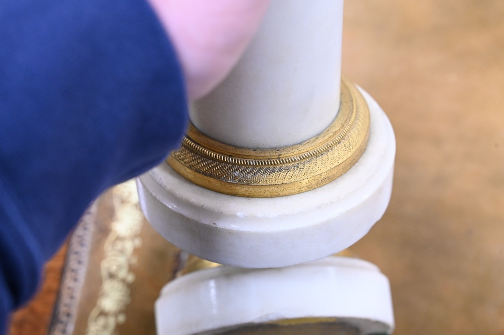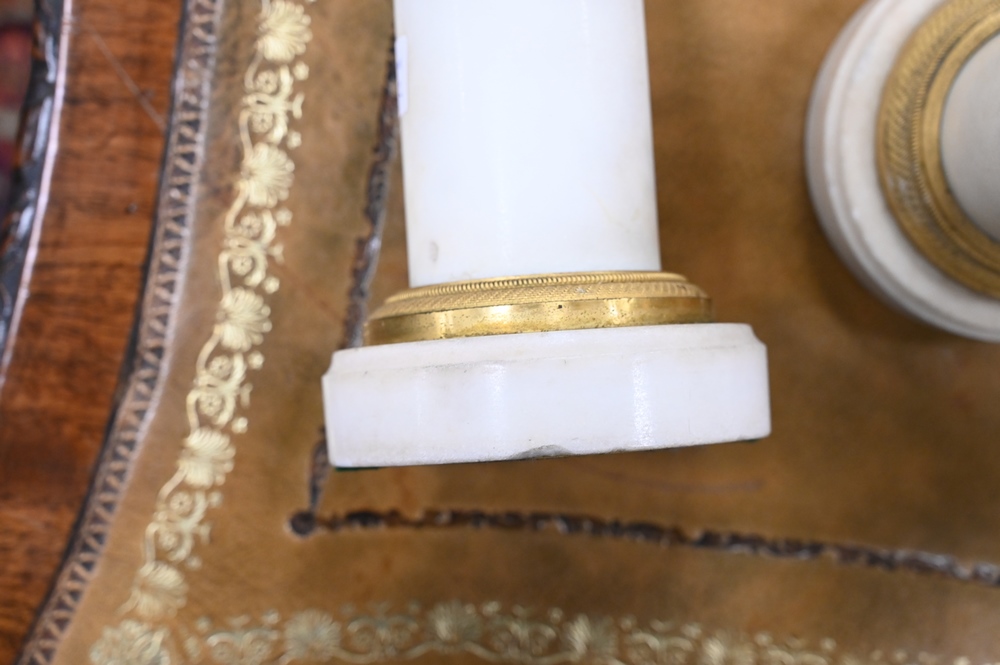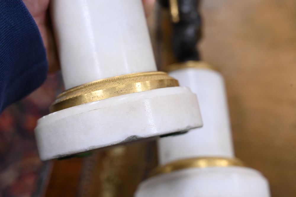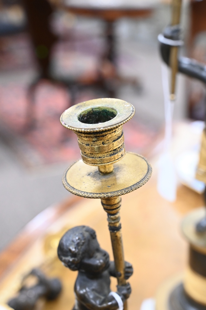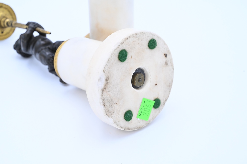 Lot 426: Pair of French Bronze and Marble Figural Candlesticks, having bronze putti with hoof feet holding gilt bronze candlesticks on white …