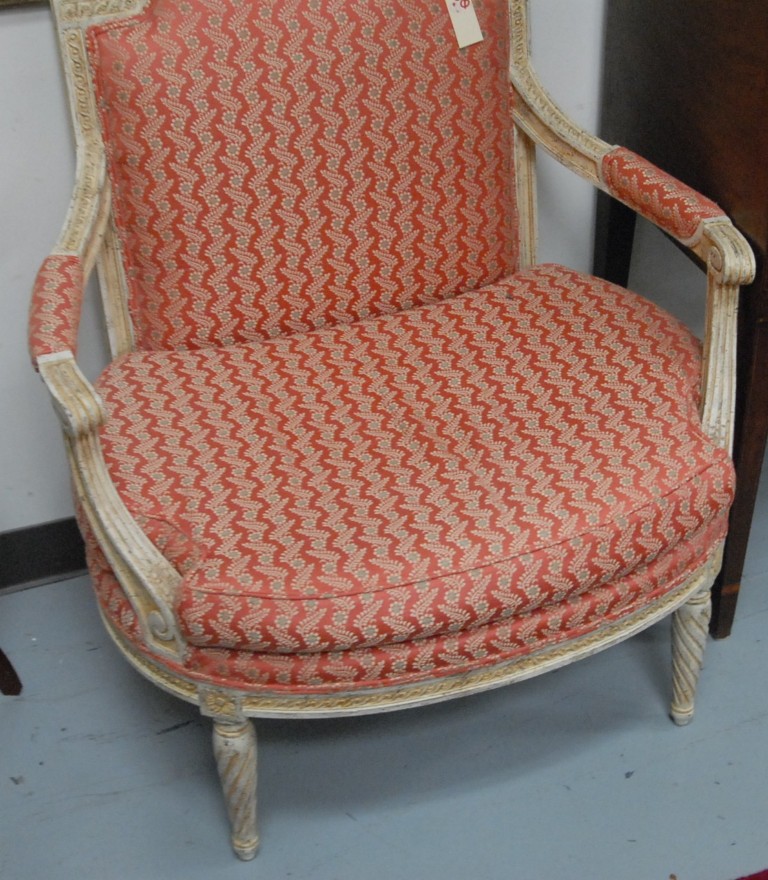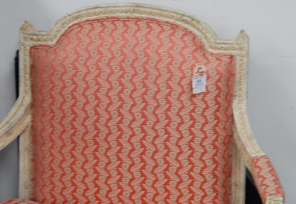 Pair of Louis XIV style armchairs with white painted frame and excellent rose upholstery.