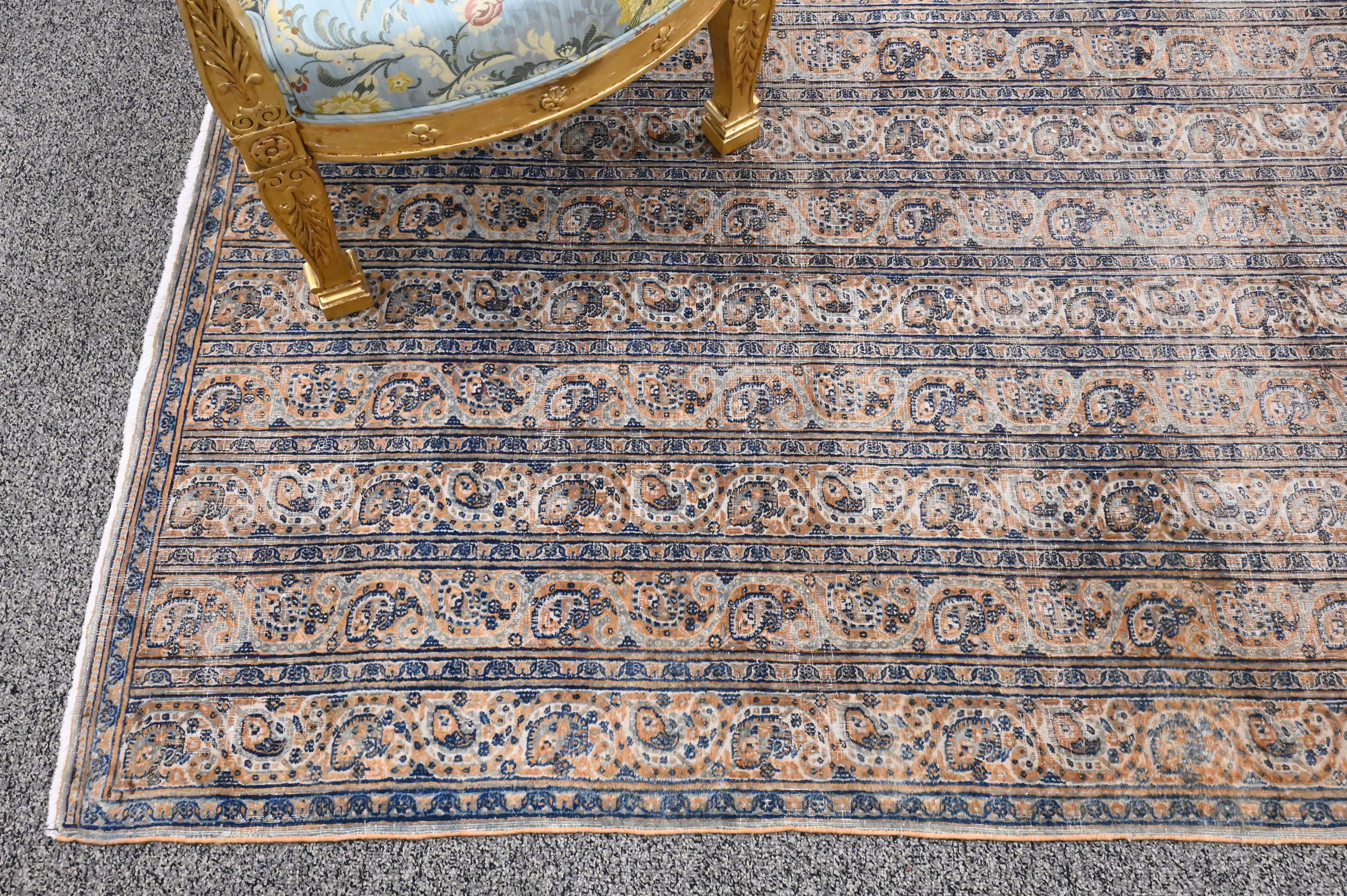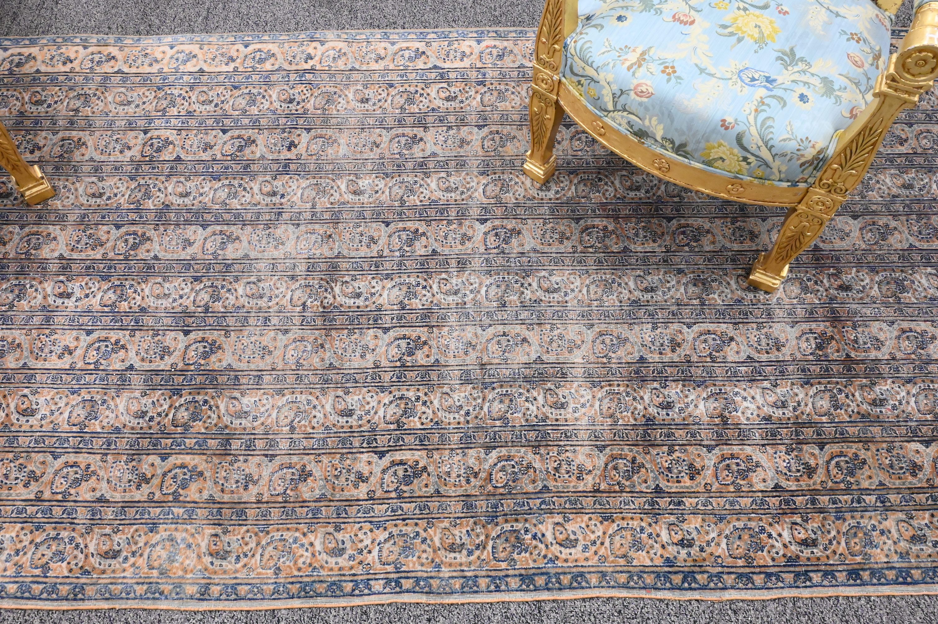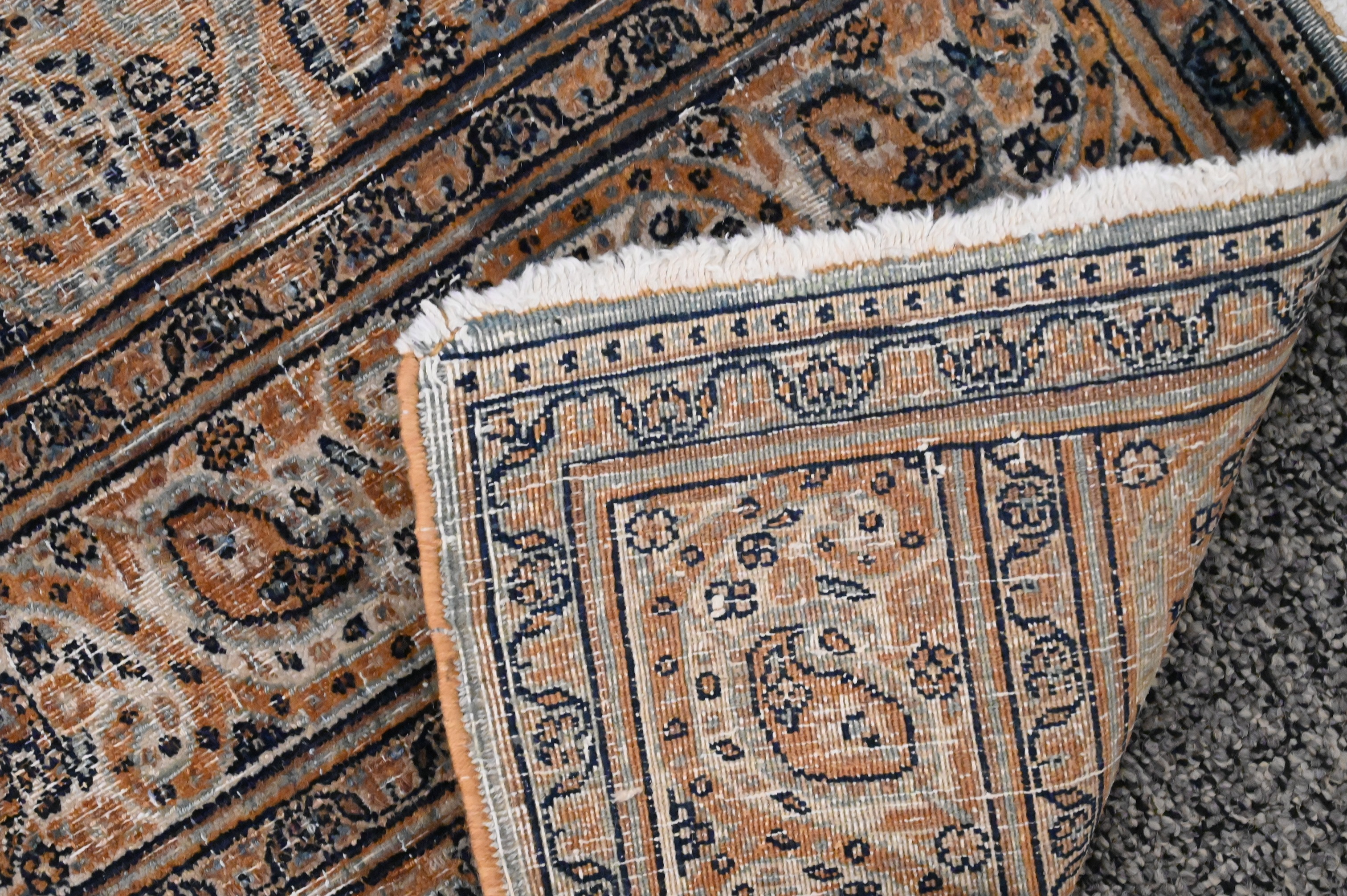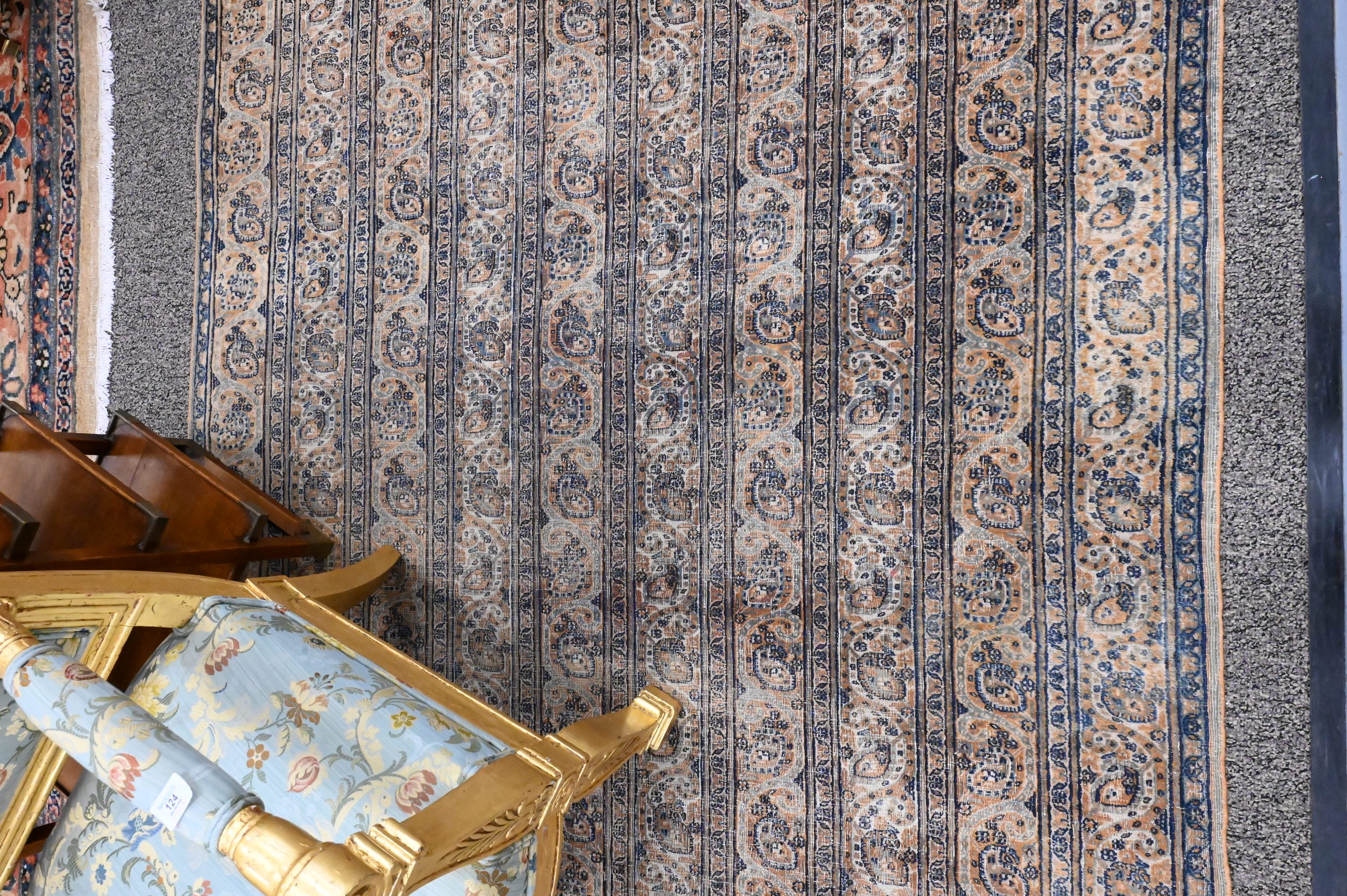 featuring all over boteh (paisley) motif arranged in vertical columns in shades of rust, indigo, and ivory within multiple floral guard borders, circa 1900