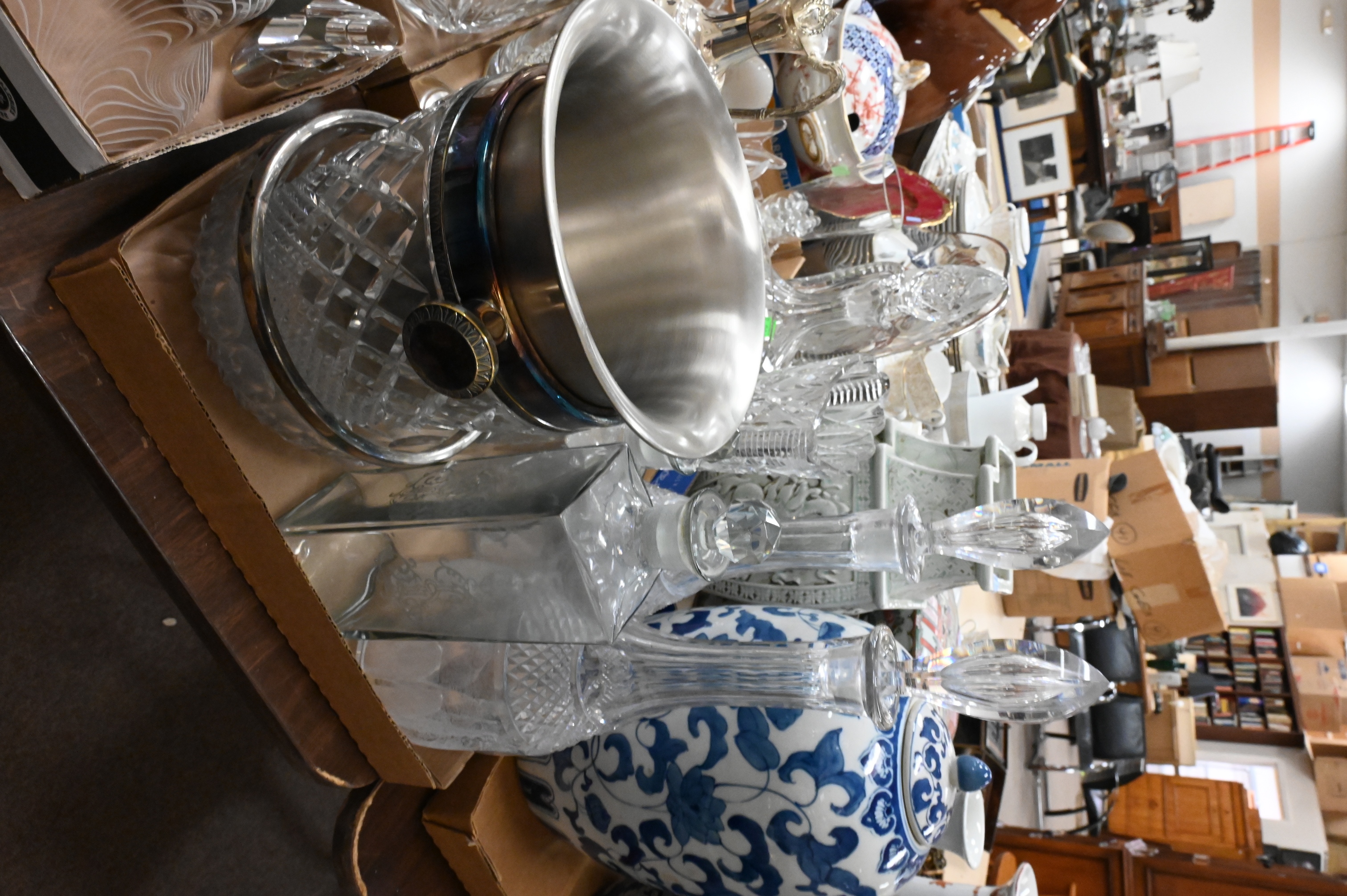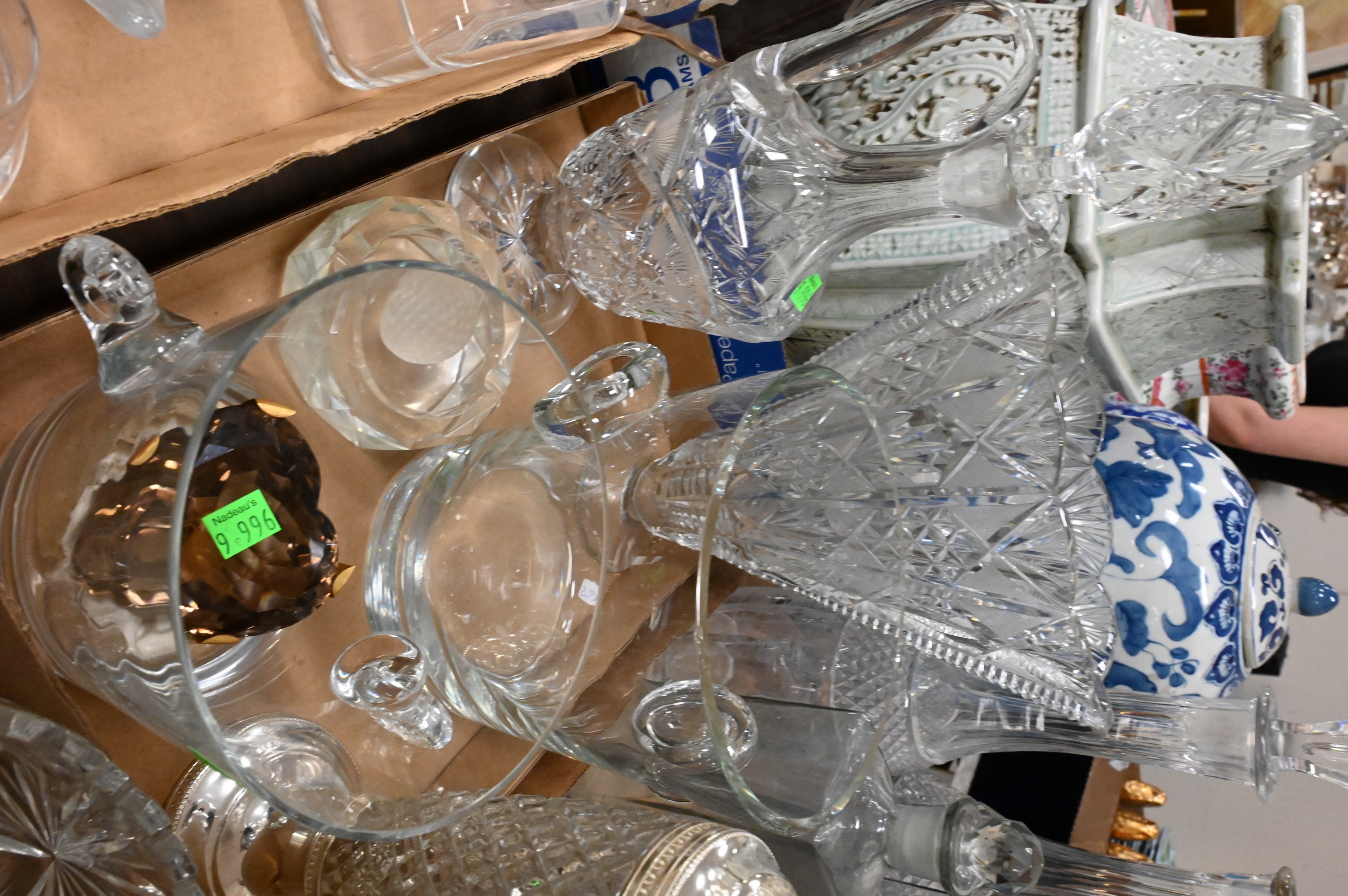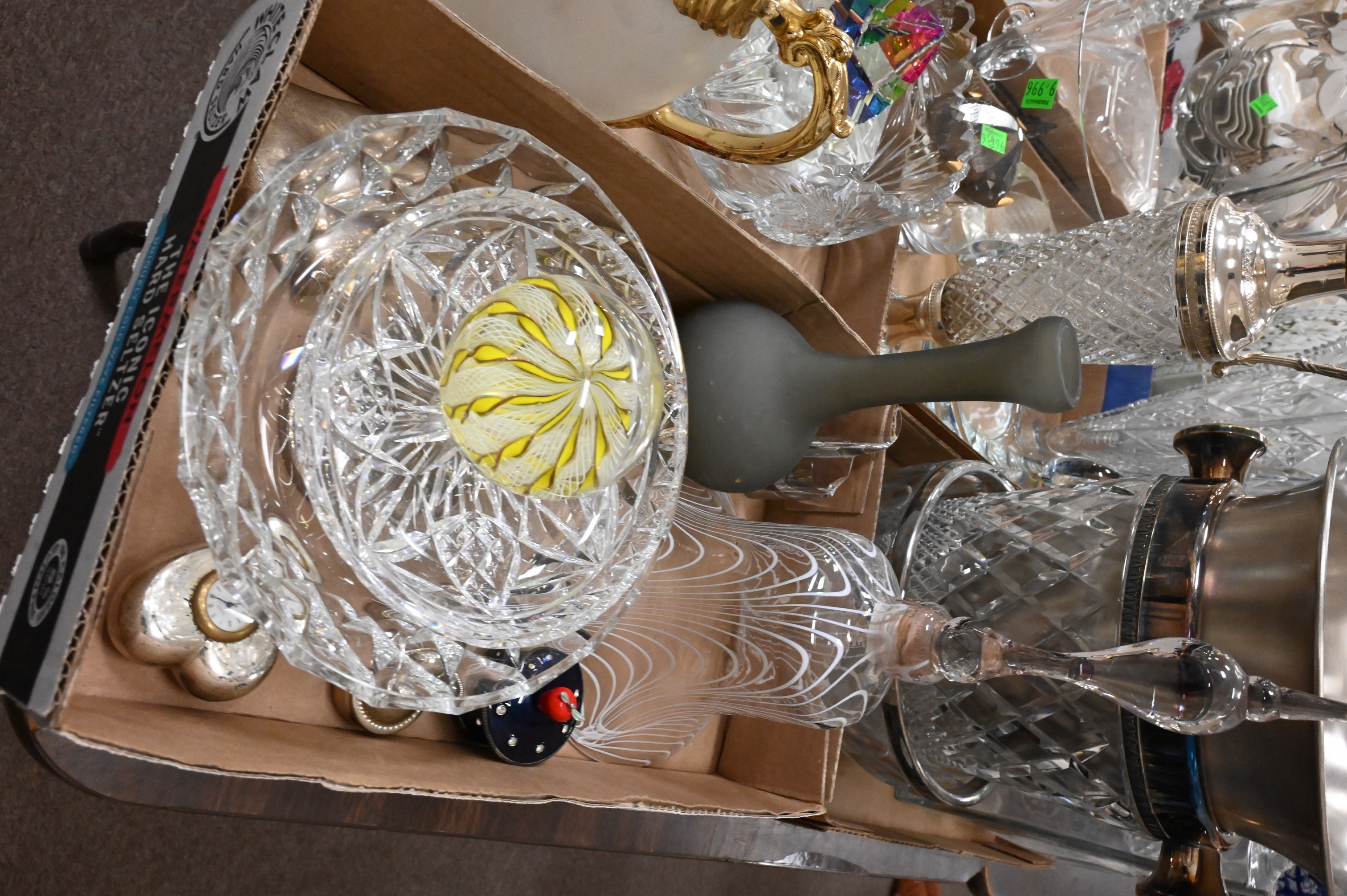 to include cut glass decanters, ice buckets, free form bowls, Carol Stapell gilt lion head pitcher, paperweights, etc.