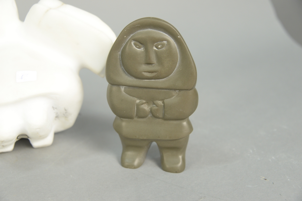 Lot 426: Three Inuit Eskimo carvings including Annie Niviaxie 1930-1989 Kuujjuaraapik serpentine Mother and Child ht. 4in., Eli Tikeayak…