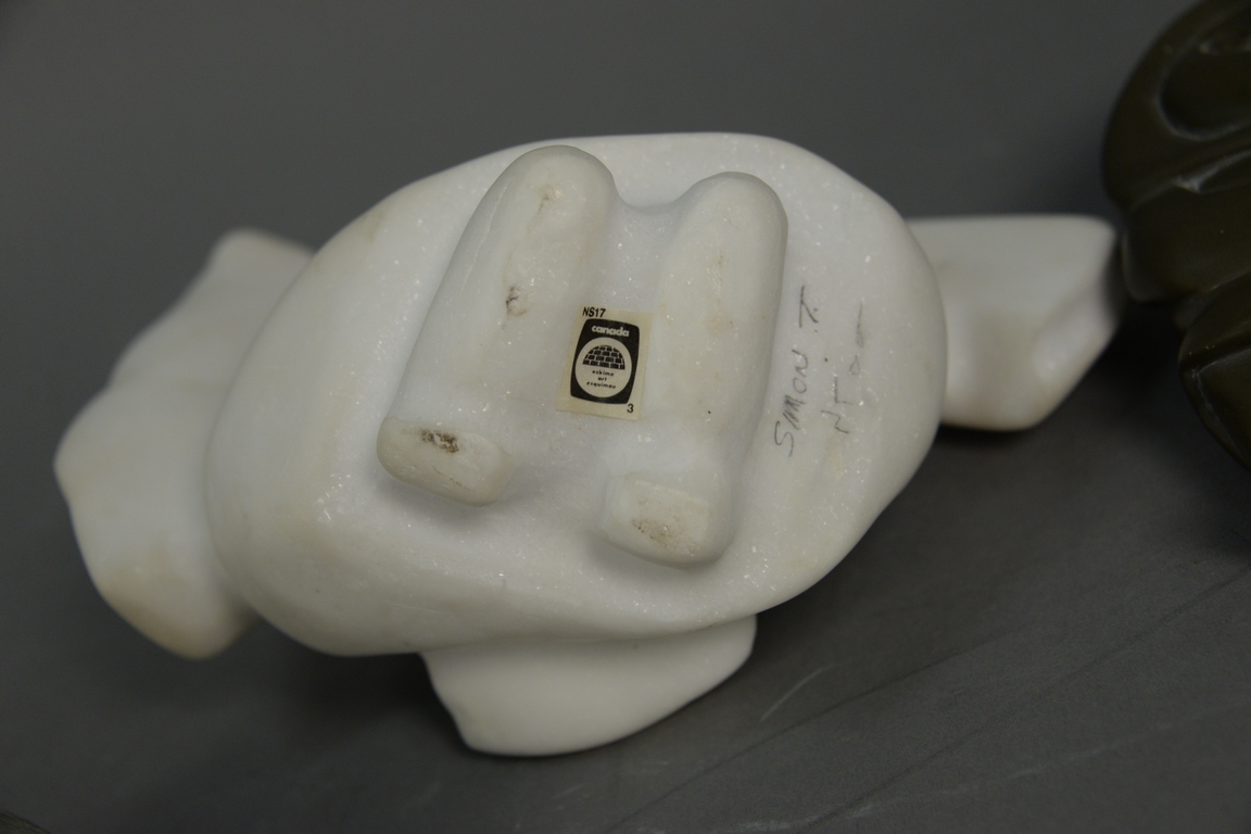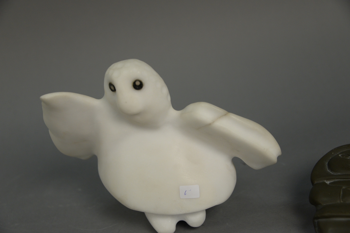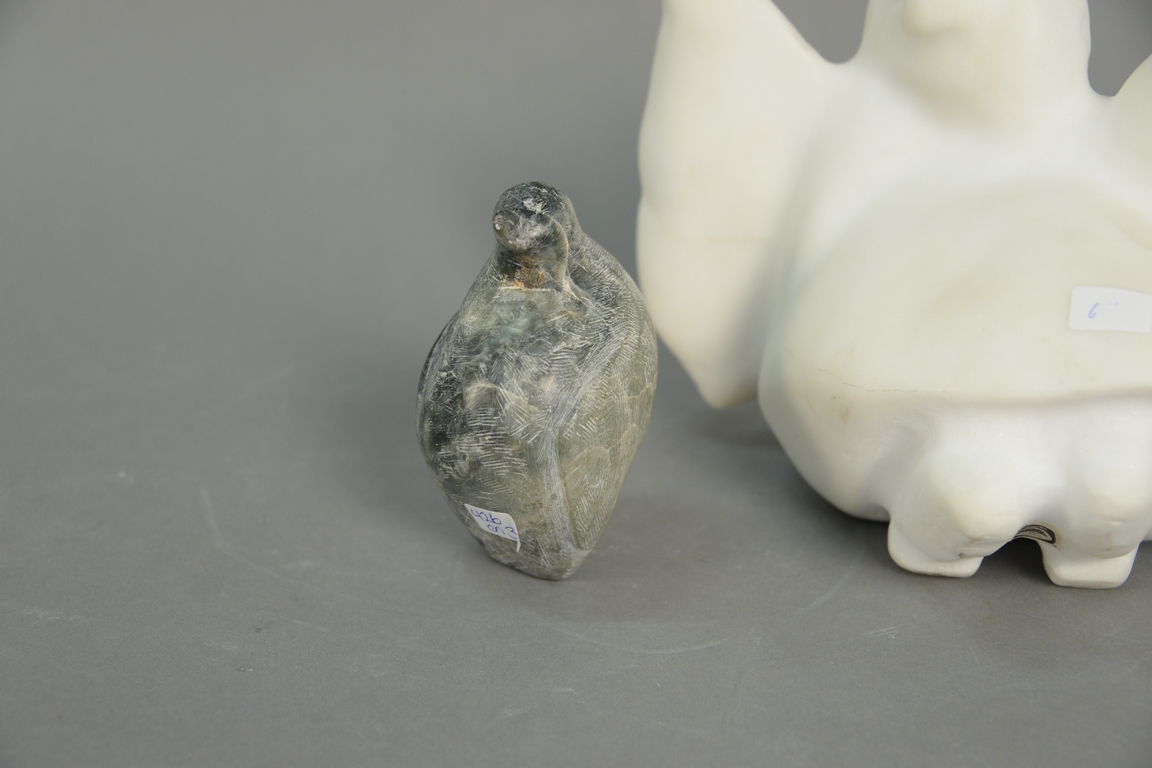 Three Inuit Eskimo carvings including Annie Niviaxie 1930-1989 Kuujjuaraapik serpentine Mother and Child ht. 4in., Eli Tikeayak 1933-1995 Rankin Inlet serpentine Bird ht. 4in., and Simon Takkiruq Gjoa Haven Canada marble White Bird Spirit ht. 6in..