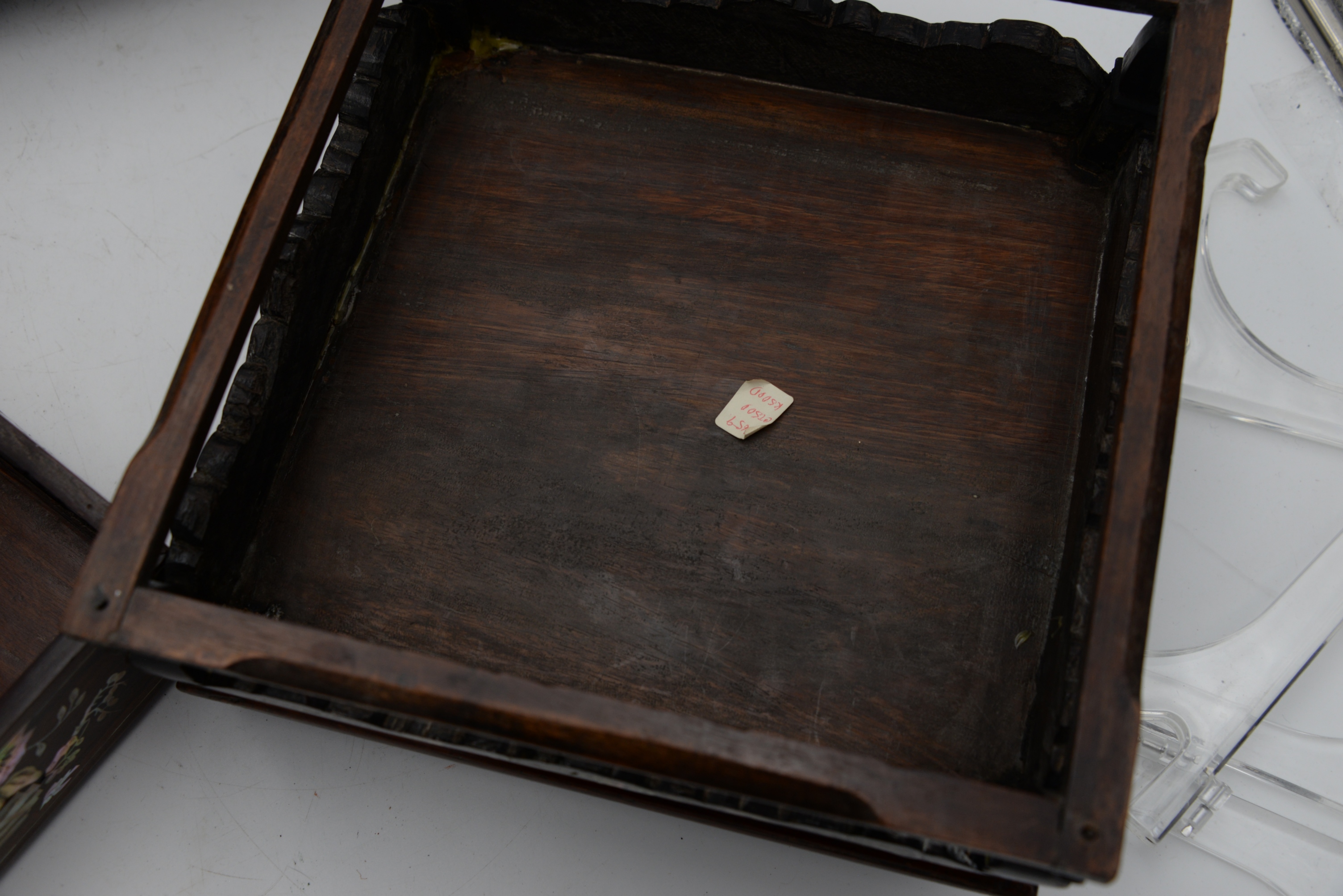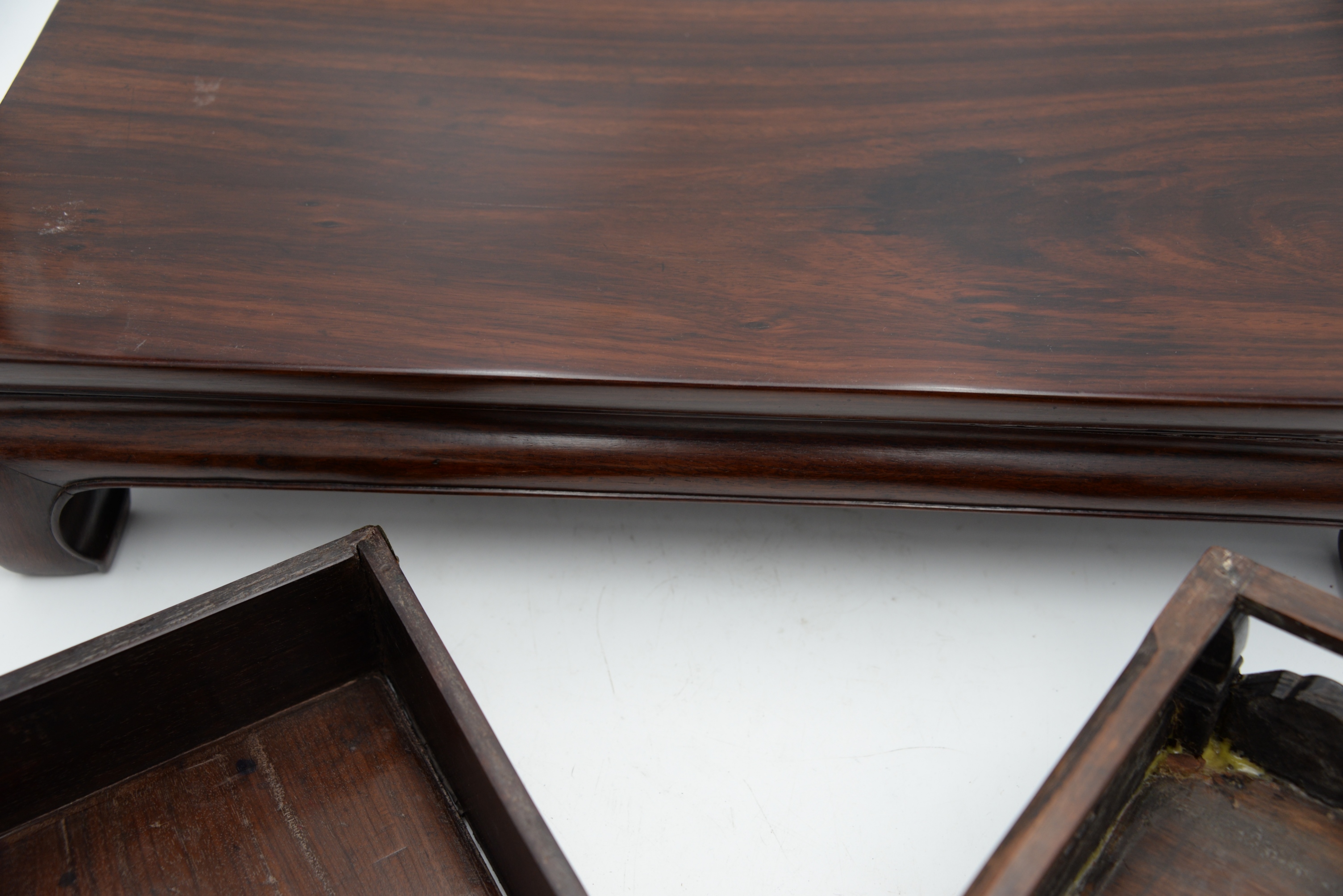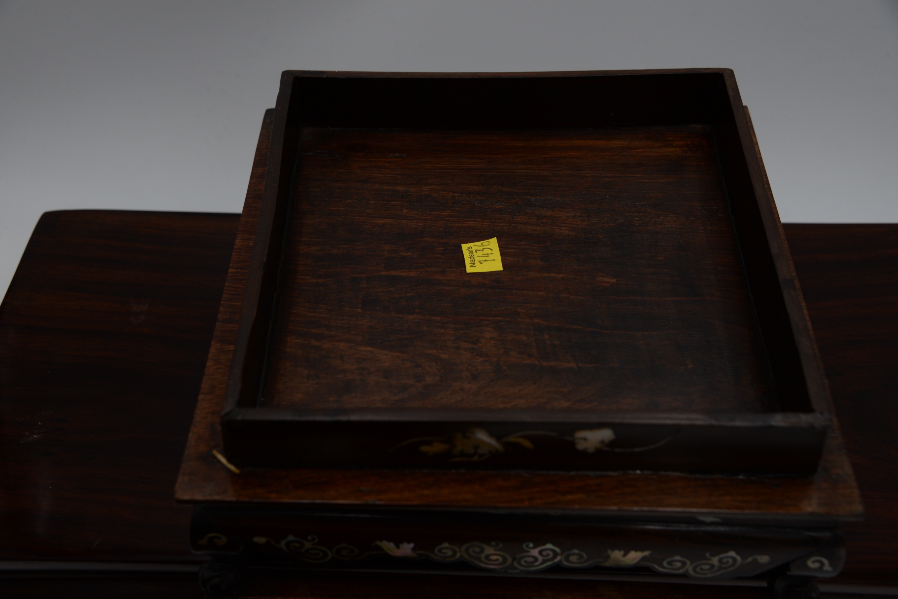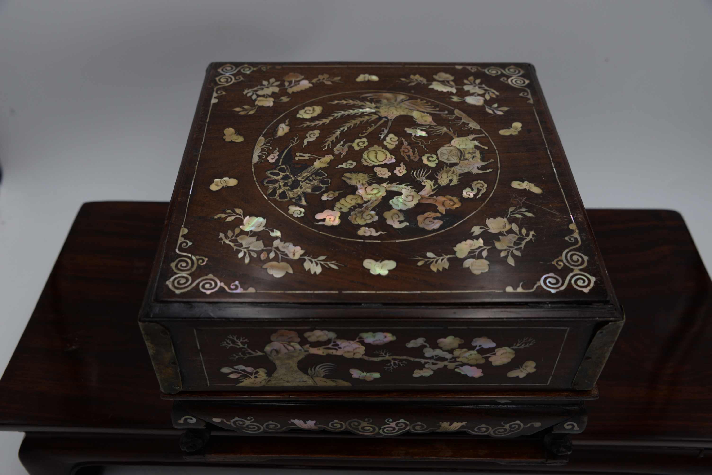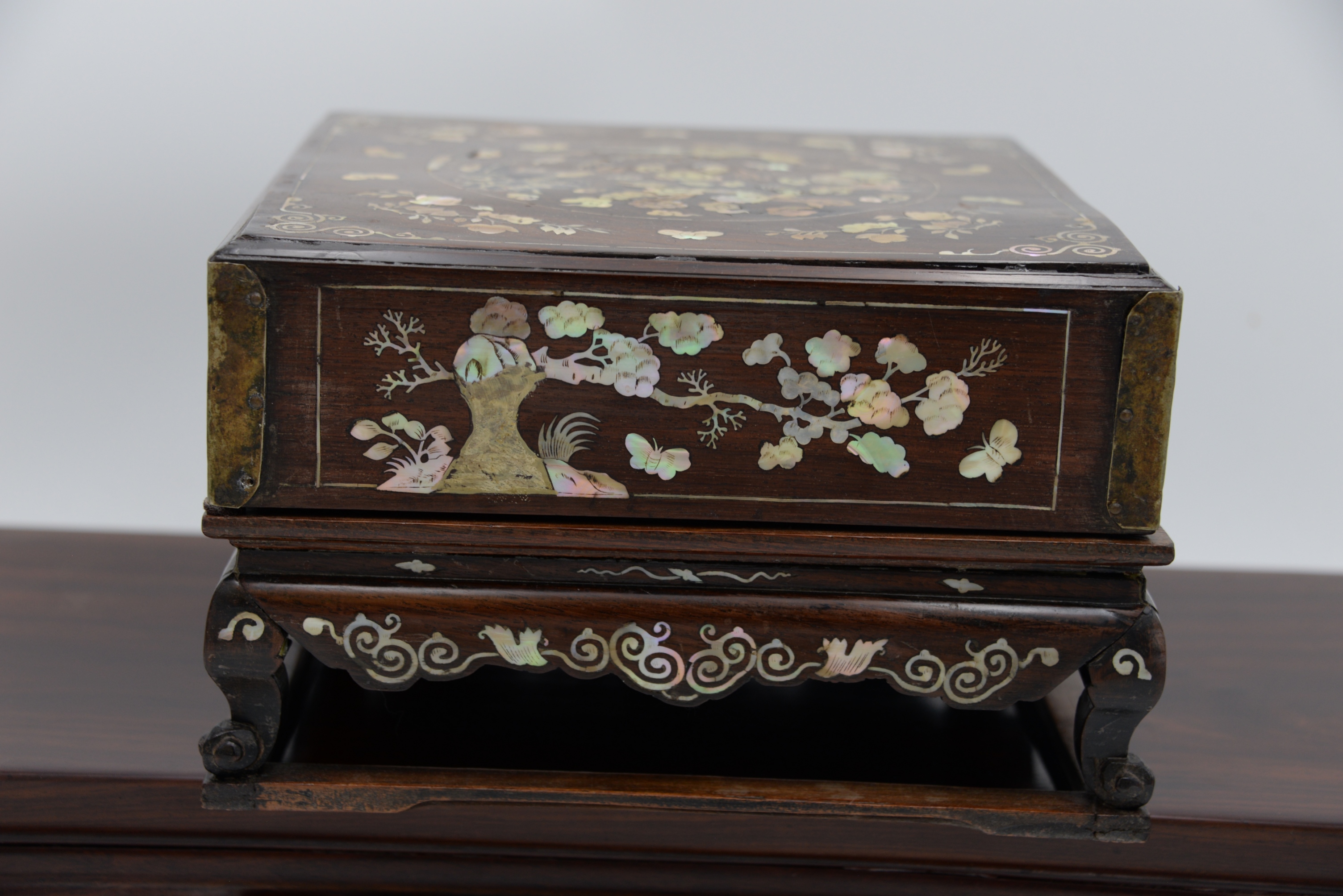 Two Carved Wood Pieces, to include a hardwood box having inlaid mother of pearl birds, flowers, phoenix bird, and auspicious motifs on stand on cabriole legs, height 6 1/4 inches, length 9 3/4 inches, depth 9 3/4 inches; along with a large hardwood rectangular stand, height 5 inches, length 22 inches, depth 9 1/2 inches.