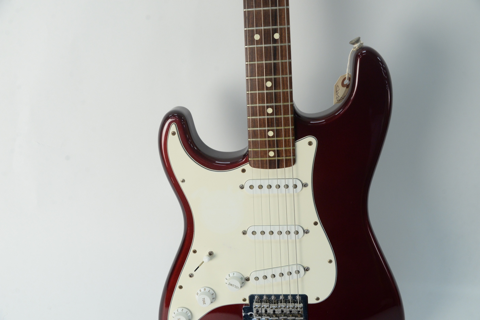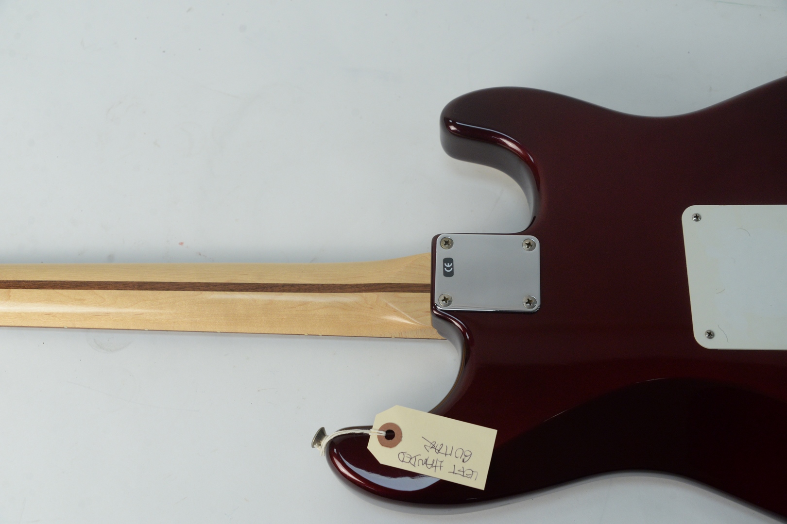 Lot 427: 2003 Fender Left Handed Stratocaster Guitar, serial #MZ3099790, Midnight Wine Red, soft gig bag, made in Mexico, length 38 1/2 inches.