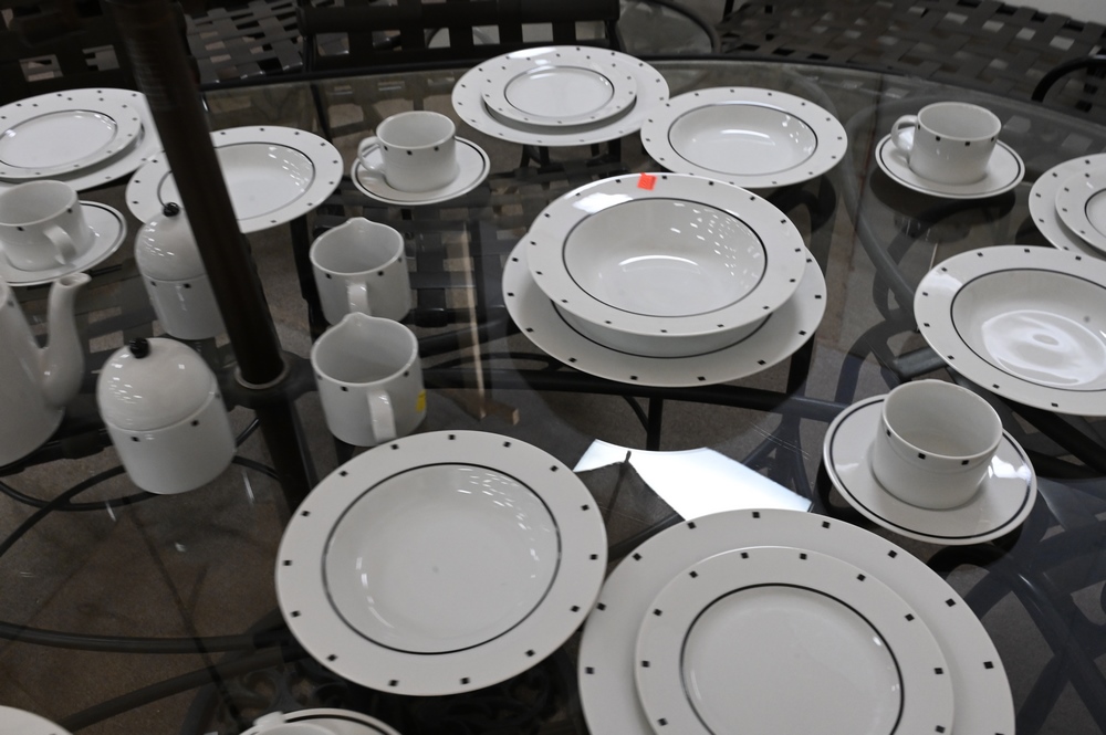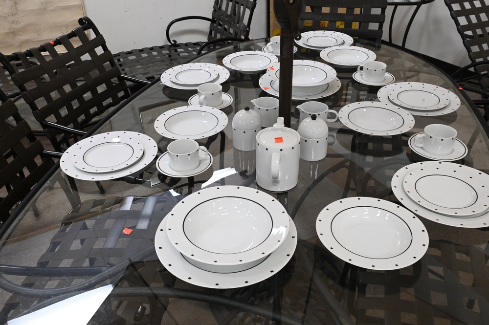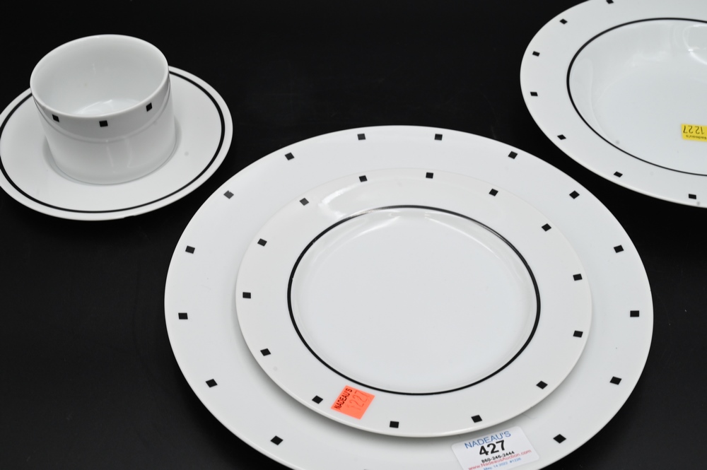 Lot 427: 87 Piece Sasaki Set of China Dinnerware, to include 16 dinner plates, 14 salad plates, 16 soup bowls, 16 tea saucers, 16 tea cups, along with 9 serving pieces.