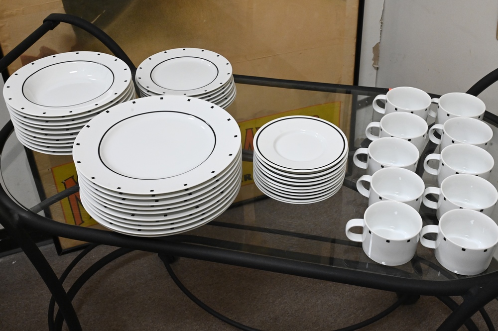 87 Piece Sasaki Set of China Dinnerware, to include 16 dinner plates, 14 salad plates, 16 soup bowls, 16 tea saucers, 16 tea cups, along with 9 serving pieces.
