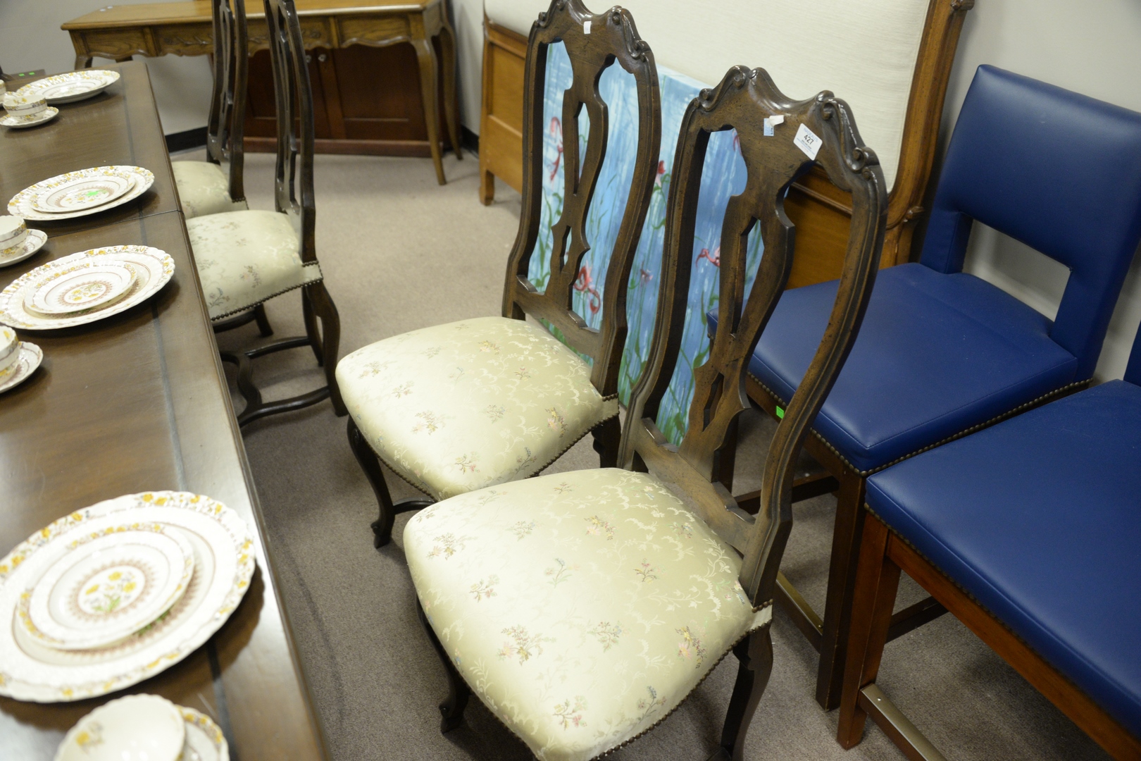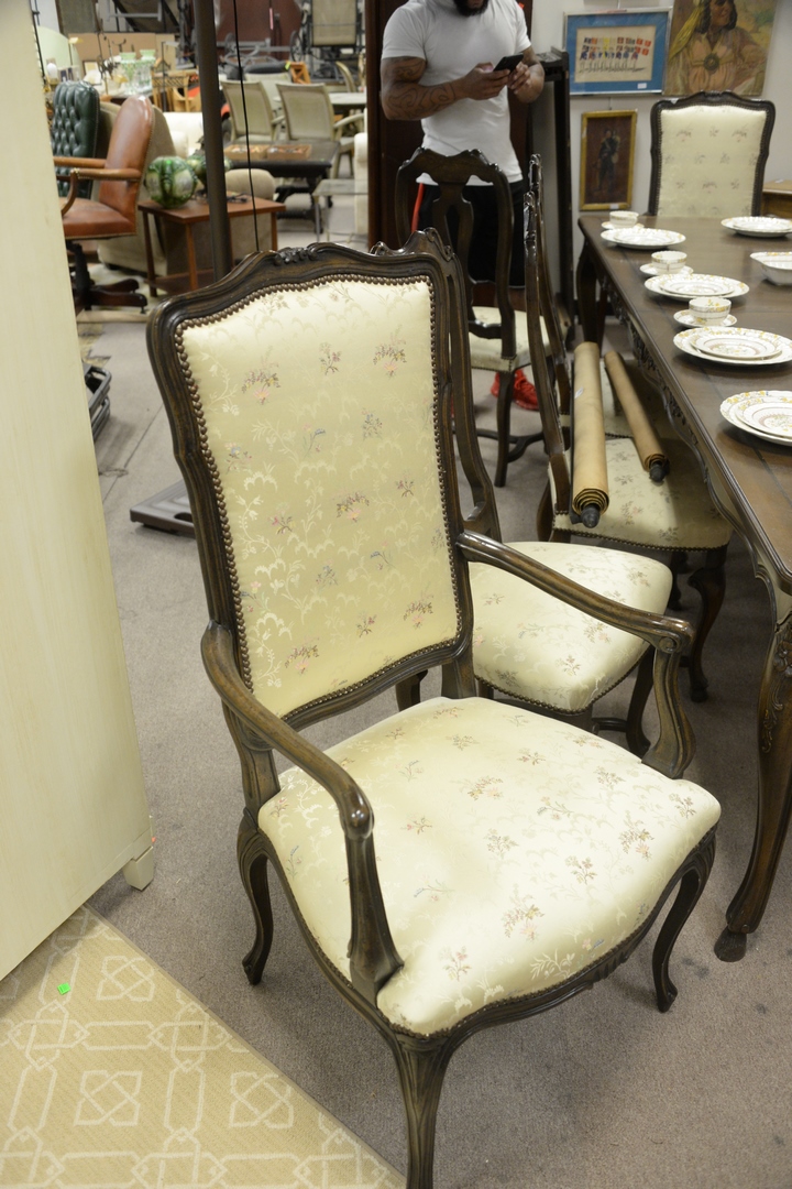Lot 427: Auffray & Company Set of Ten Louis XV Style Dining Chairs, to include two arm, eight side, having custom upholstery, seat height 17 1/2 inches.