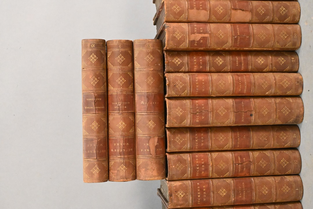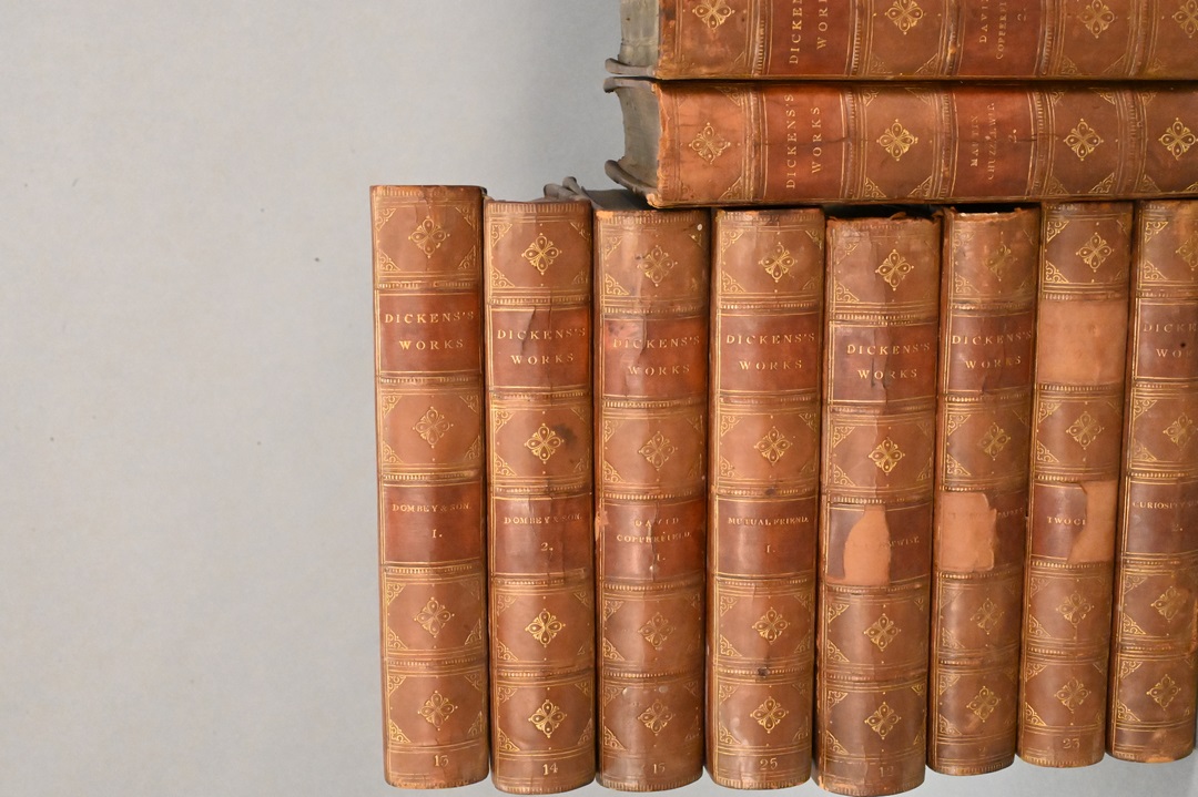 Complete Set of 29 Volumes of Leatherbound “Works of Charles Dickens – Library Edition” Books, published in 1870’s, Provenance: Estate of Cyril H. Moore Jr, Kent, Connecticut.