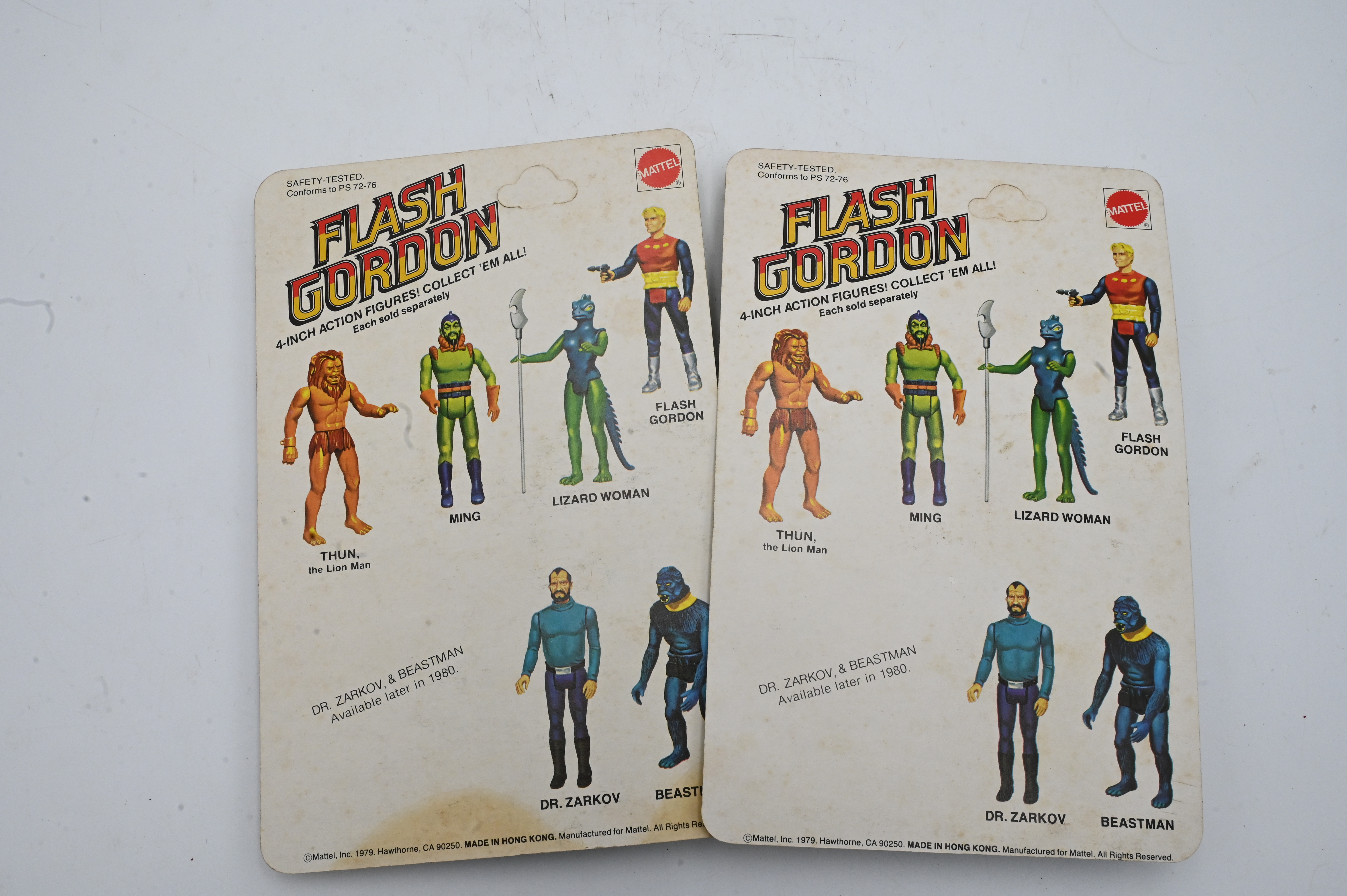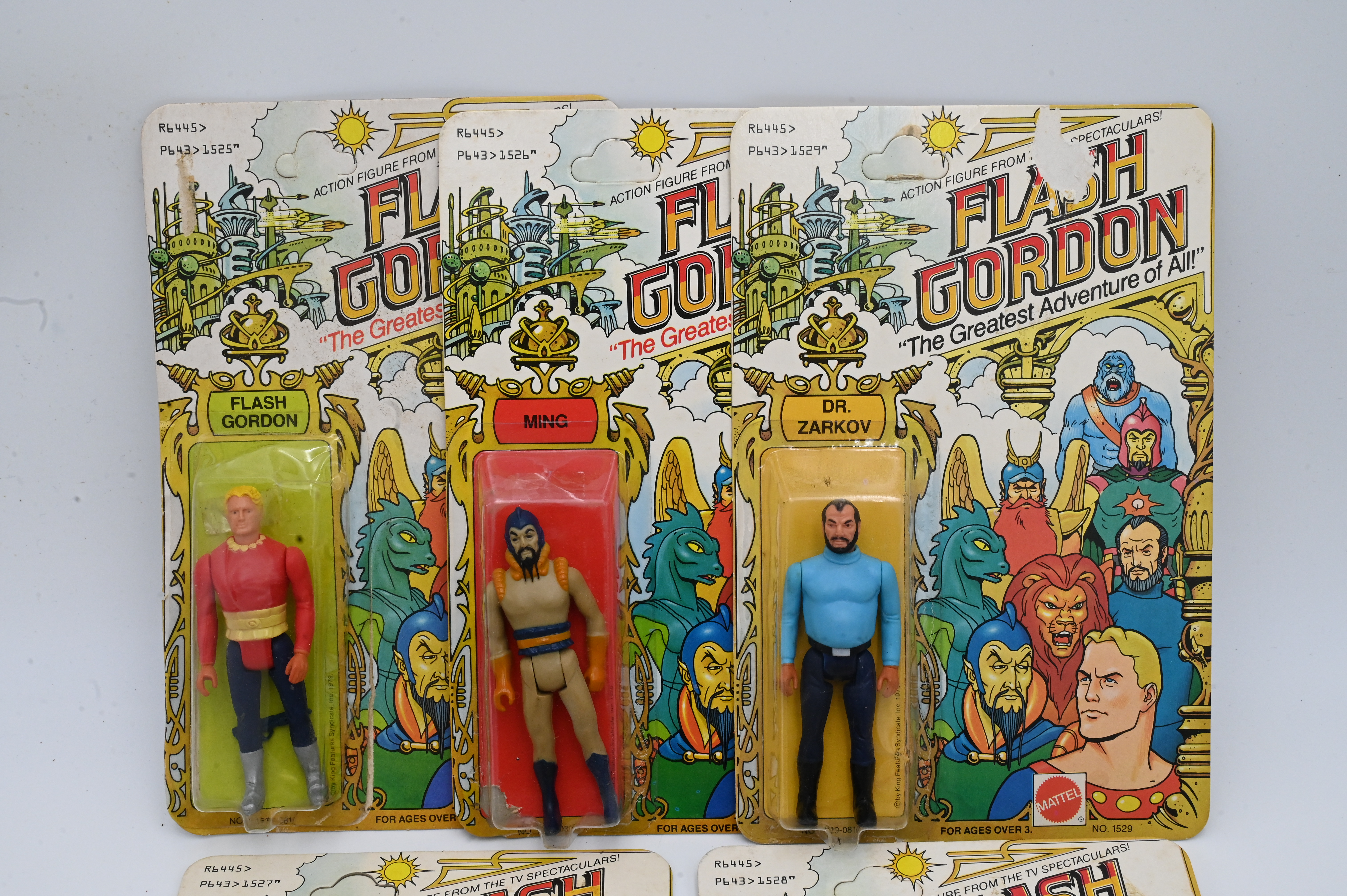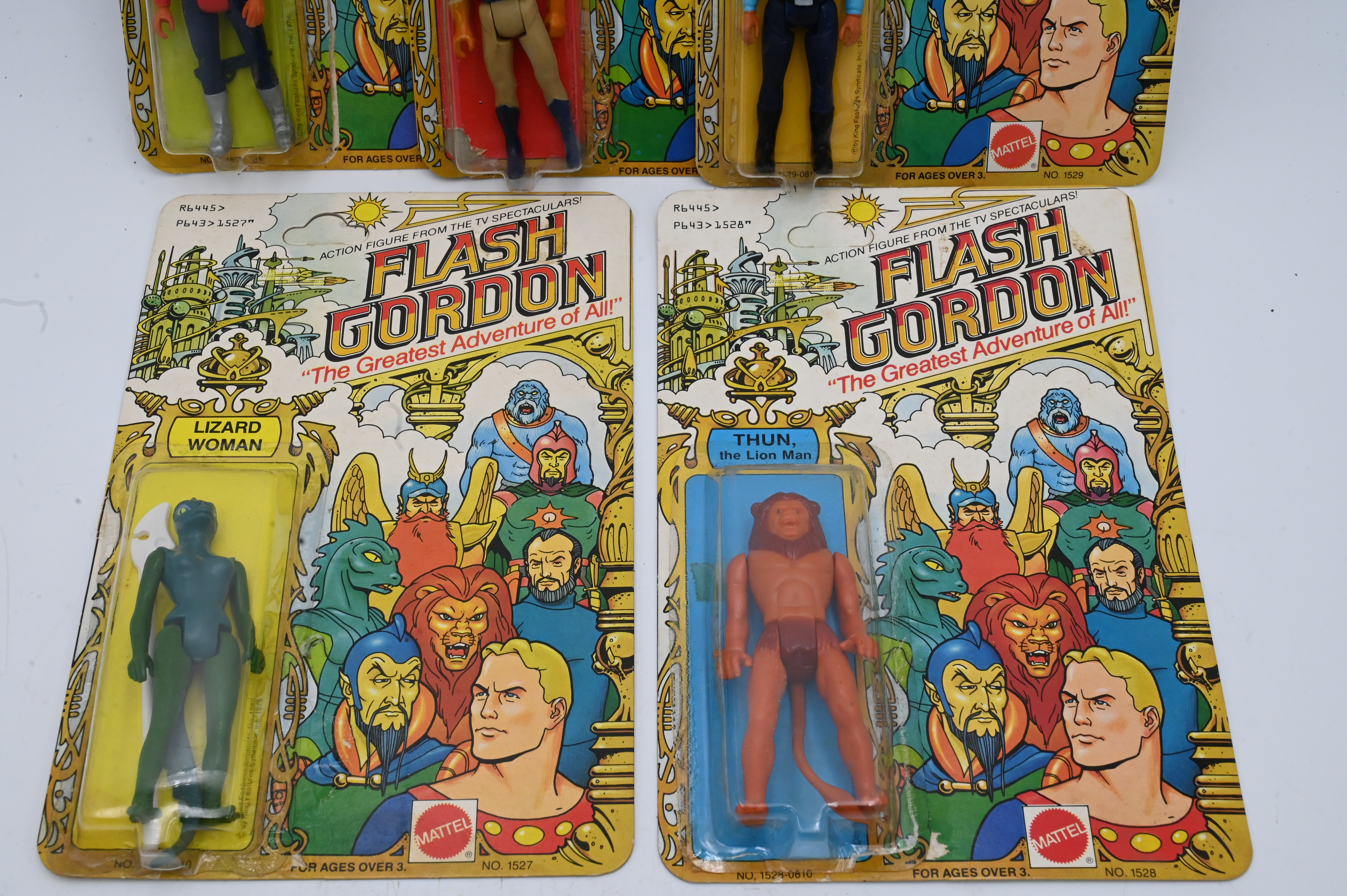Five 1979 Mattel Flash Gordon Action Figures, to include Dr. Zorko, Ming, Flash Gordon, Thun, along with Lizard Woman, all in original packaging, (as is).