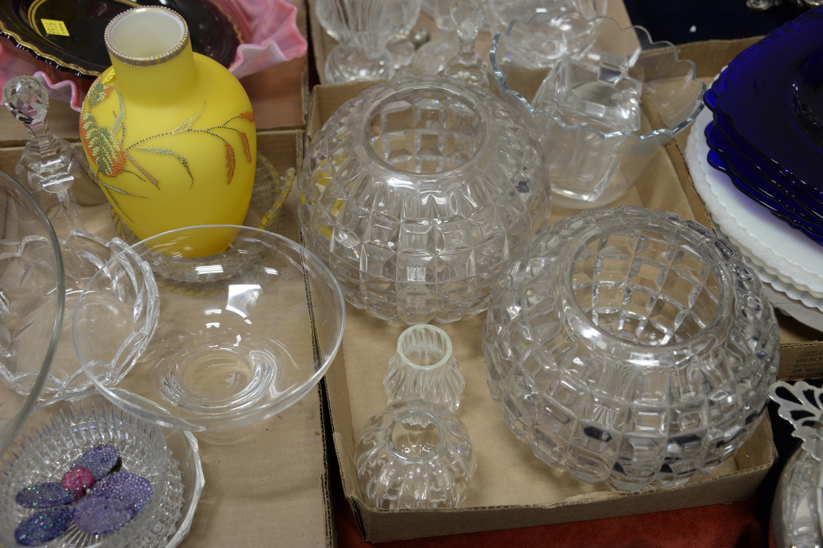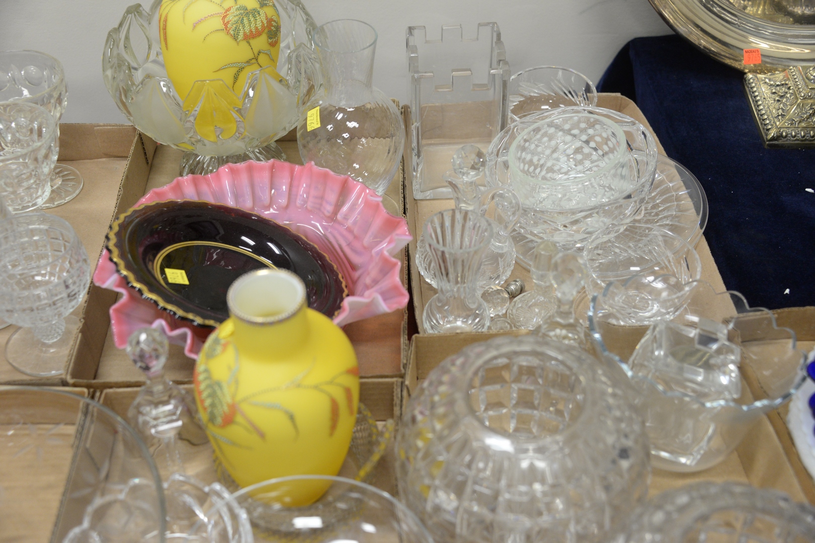 Five Tray Lots of Crystal and Glass, to include Val Saint Lambert Rosenthal cut glass a pink glass flowered bowl along with a pair of case glass yellow vases.