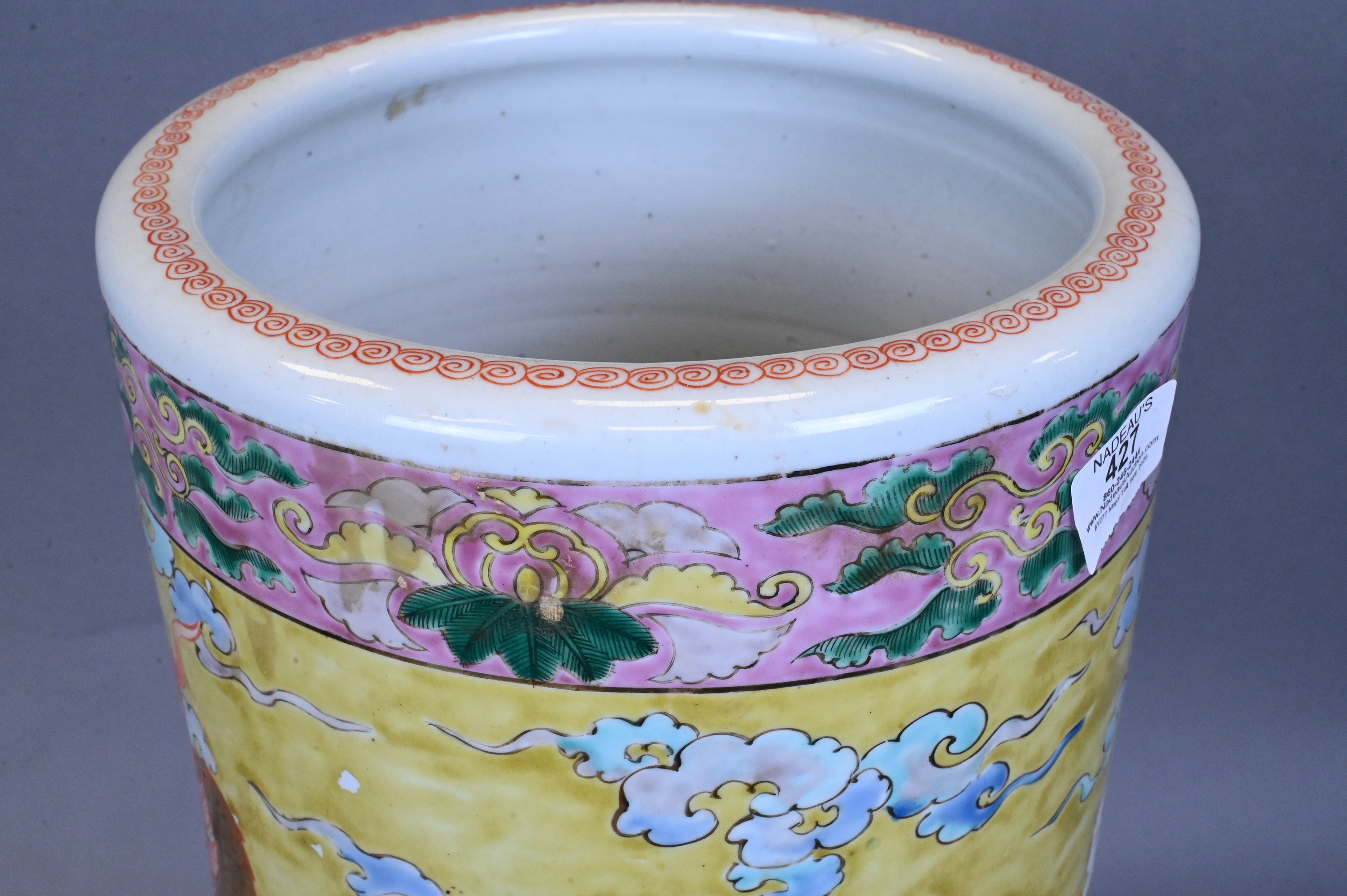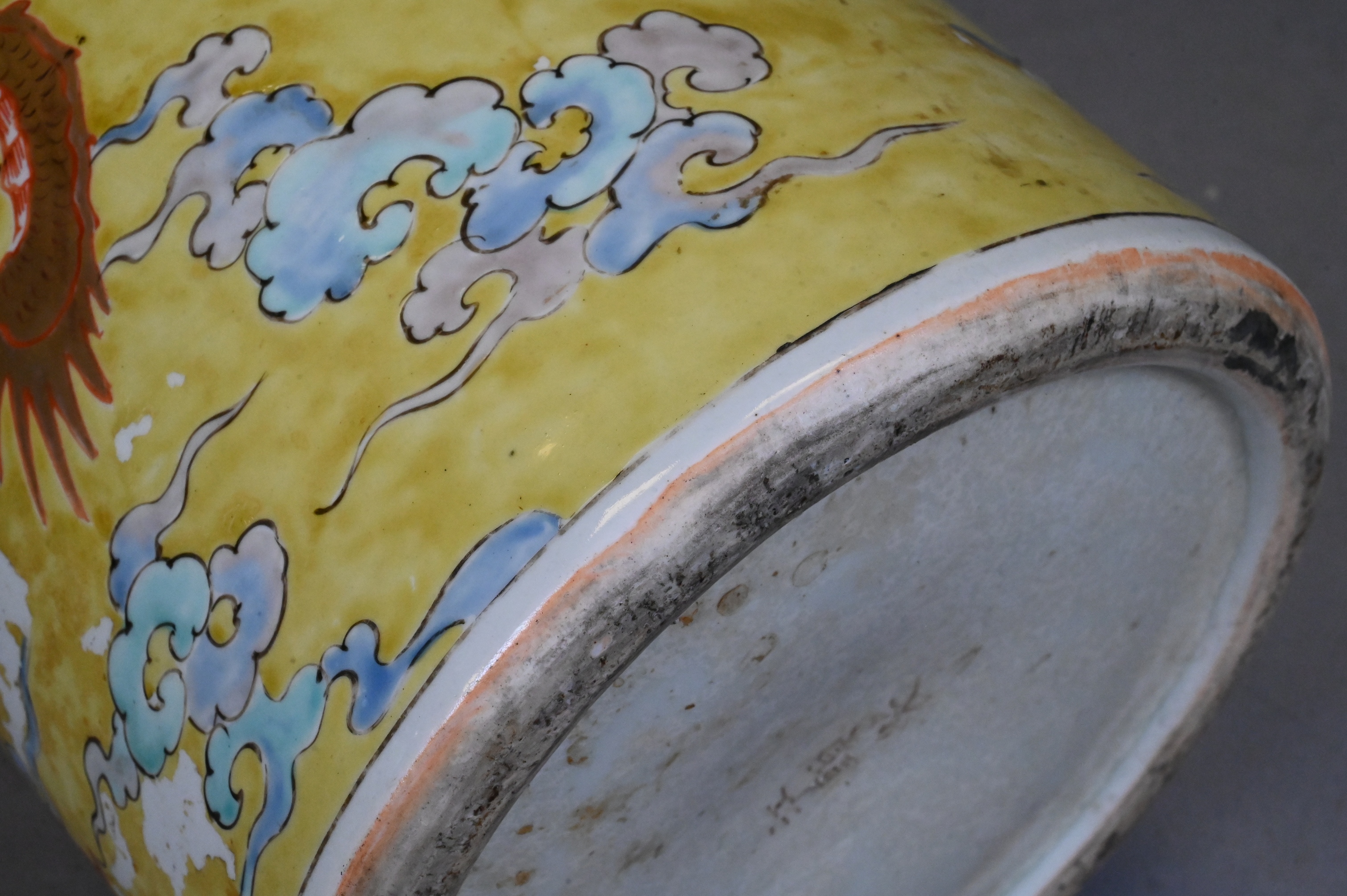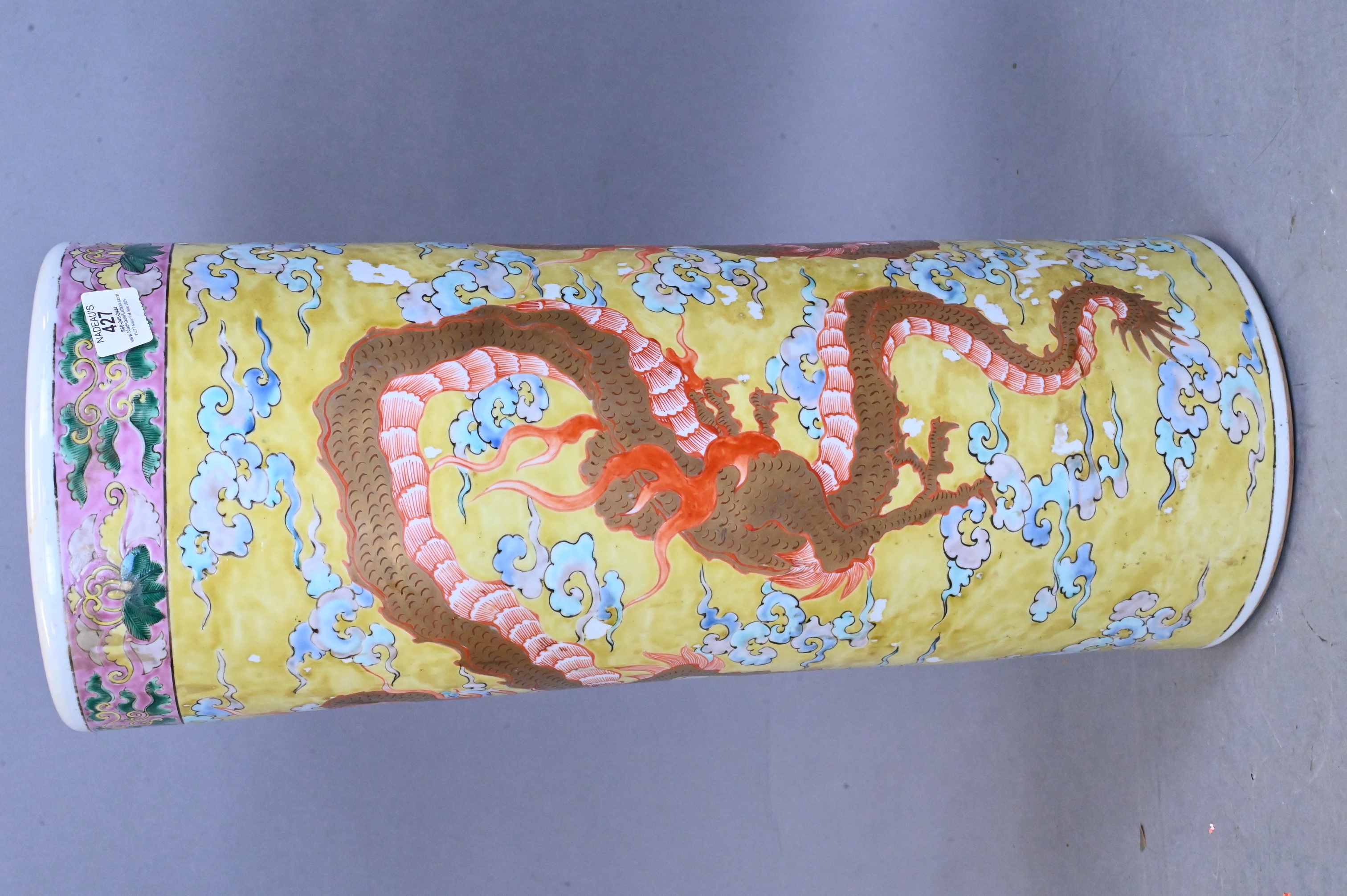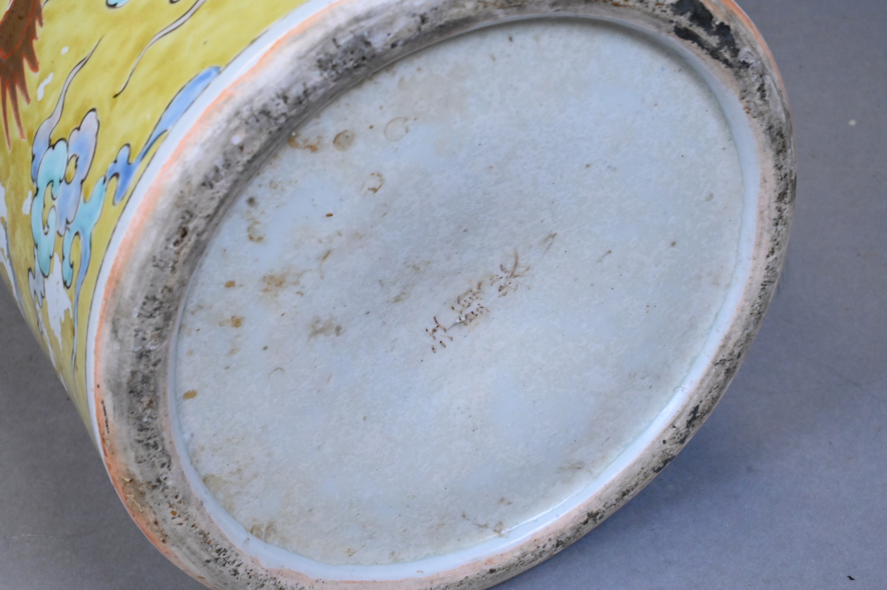 A large Chinese porcelain umbrella stand of cylindrical form, decorated in famille rose enamels with a three-clawed dragon chasing a flaming pearl amidst clouds on a yellow ground, the rim with a band of stylized lotus scrolls.