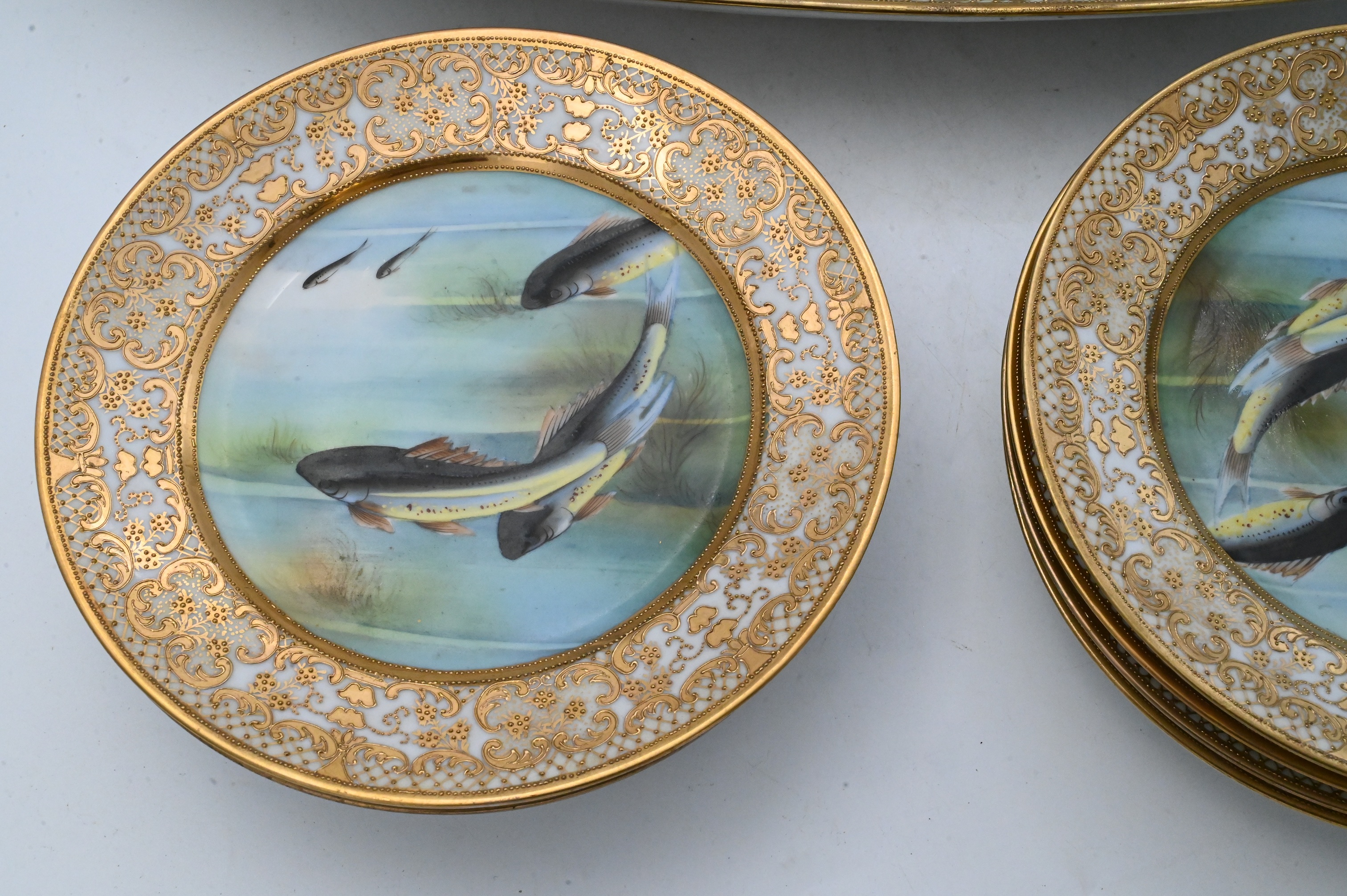 eight plates along with fish platter with high relief gilt and fish and seaweed motif