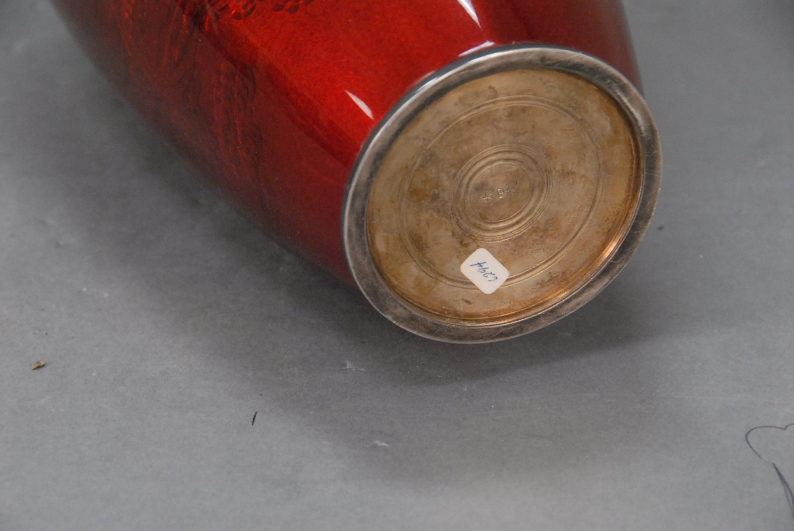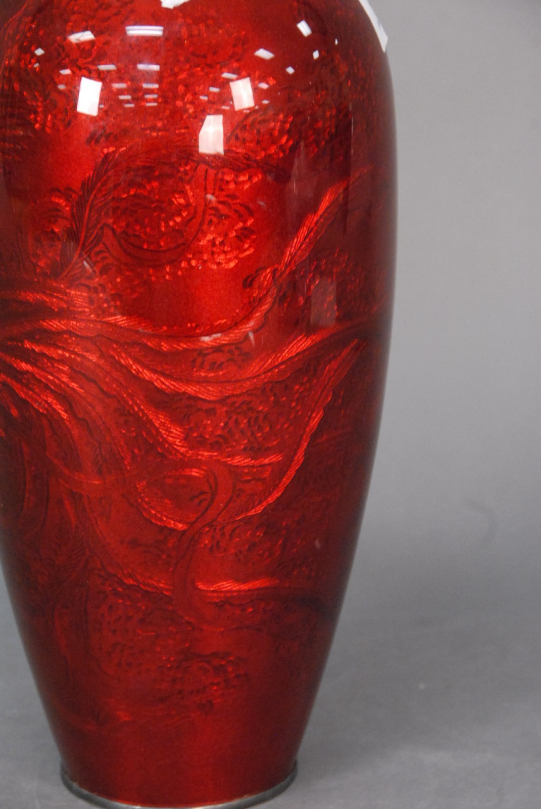 Ota Jinnoei signed mythological peacock red enameled vase on stand, small ding.