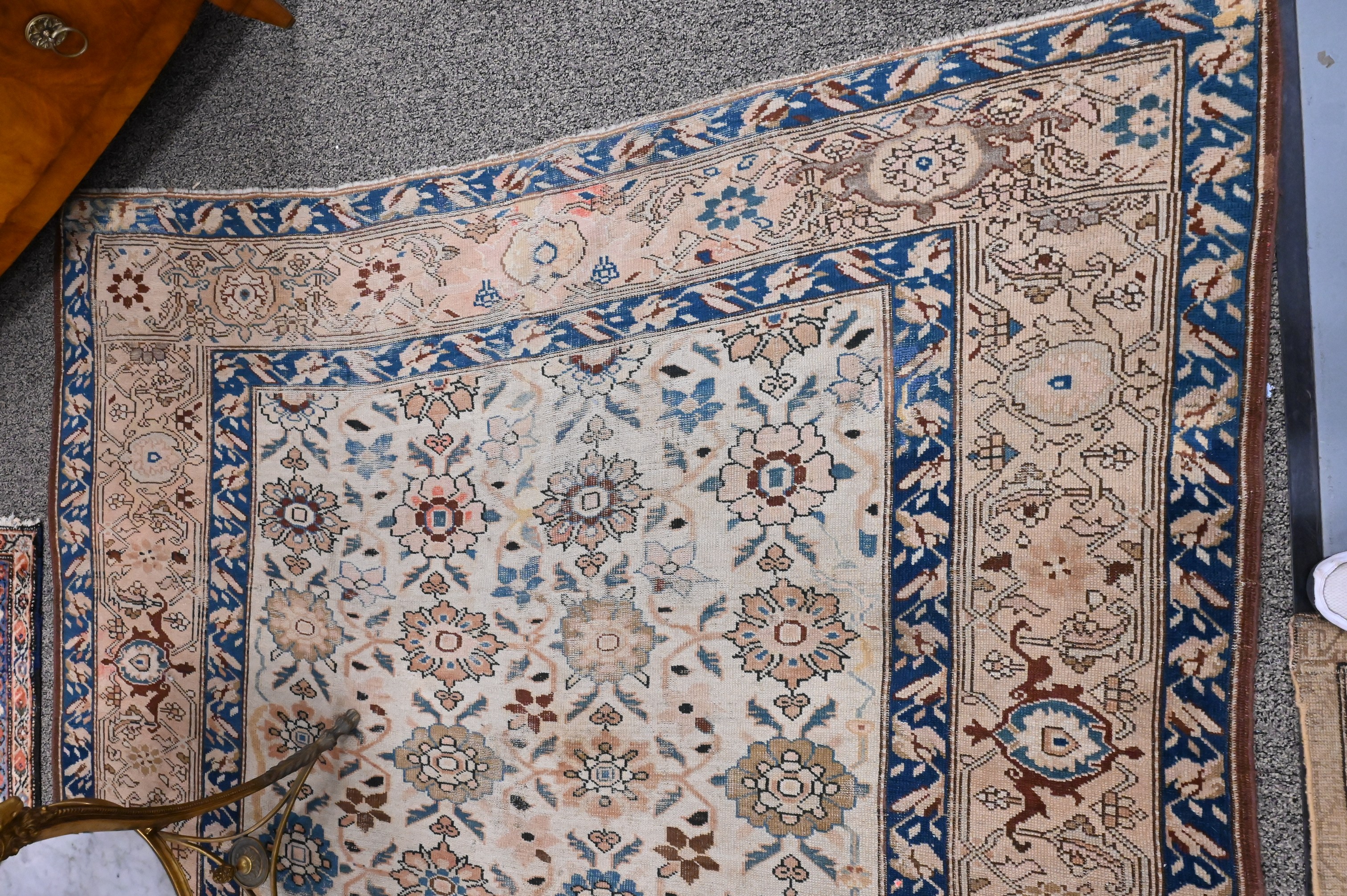 having allover floral and palmette design in shades of rust, soft blue, and ivory within multiple floral border, late 19th century