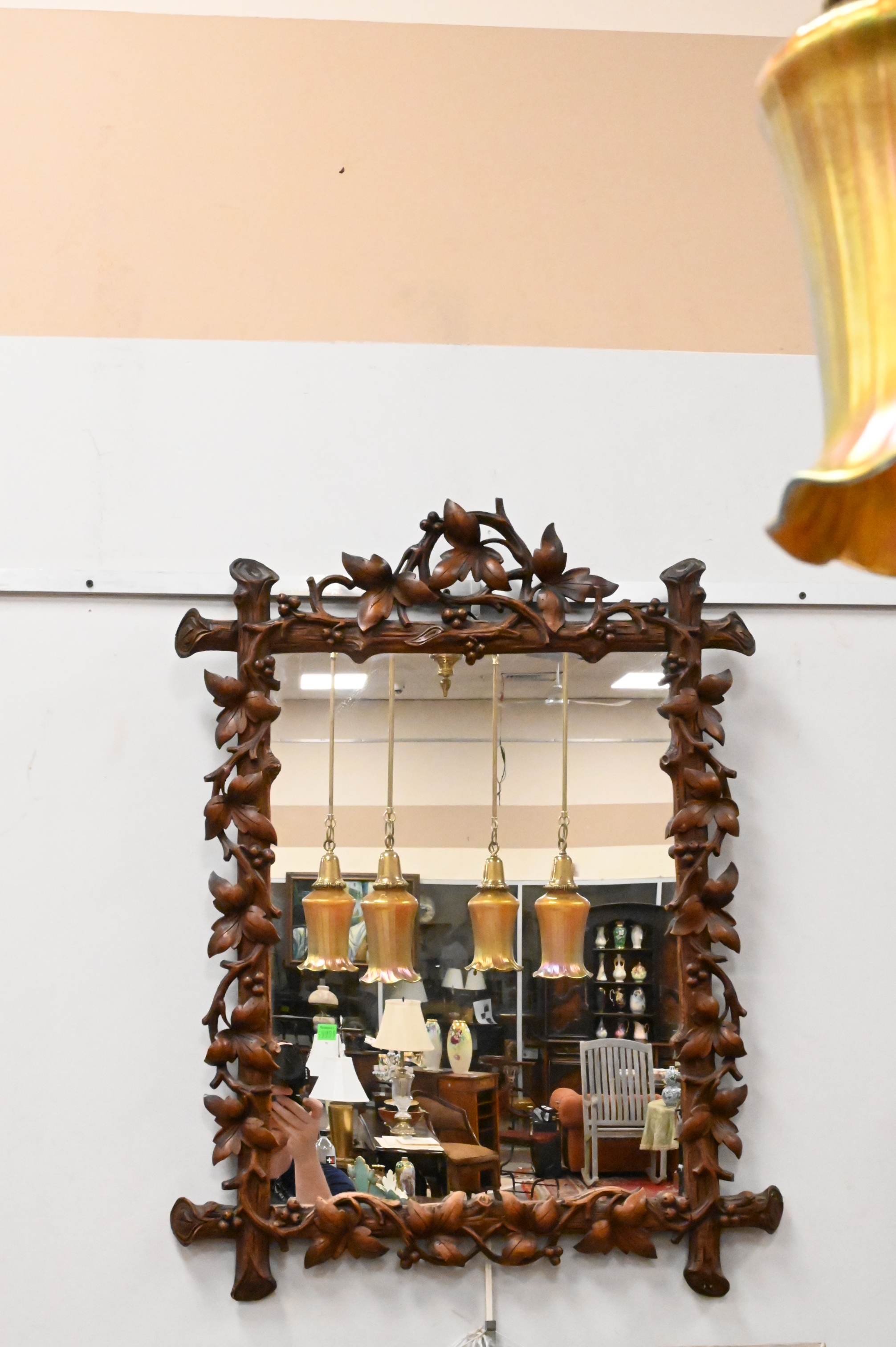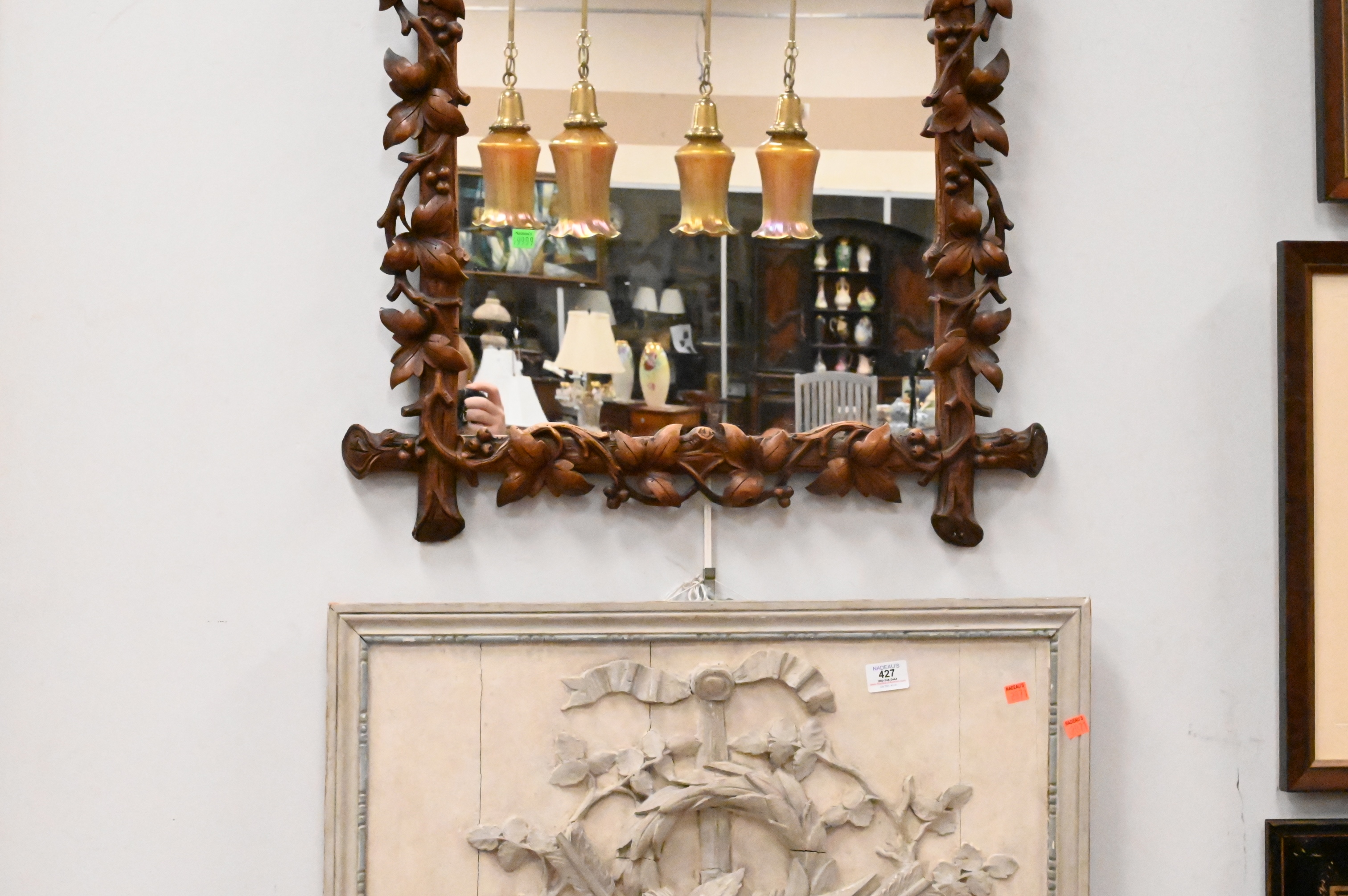 Two Piece Carved Wall Hanging Lot, to include a leaf carved mirror, along with a carved crest, mirror 34″x25″