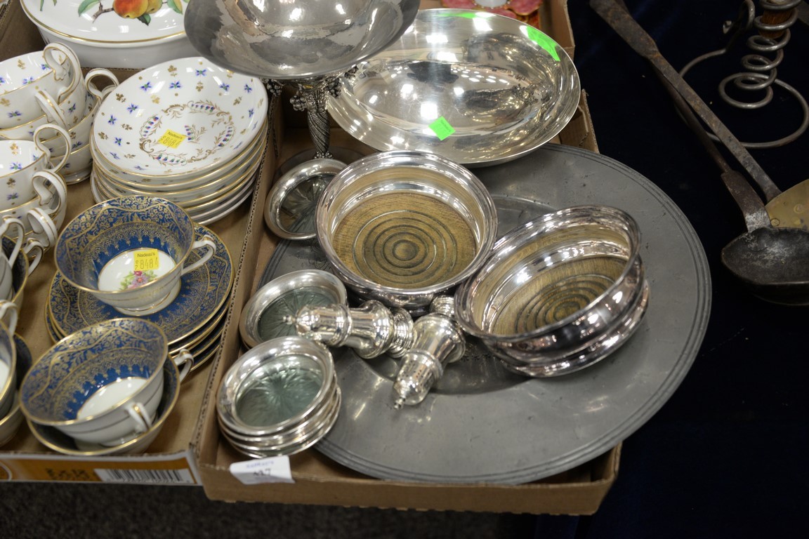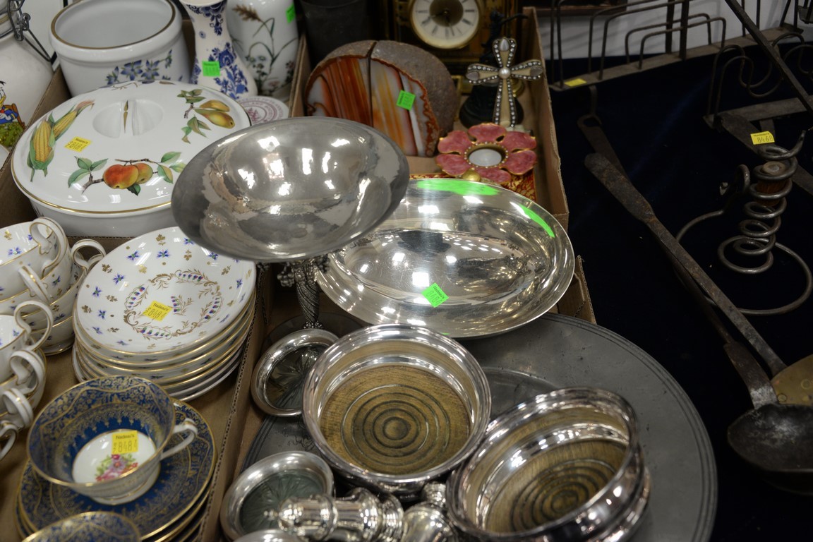Lot 427: Two tray lots with sterling, silverplate, and miscellaneous items including Godinger Jensen style compote, Burnes enameled sterling …