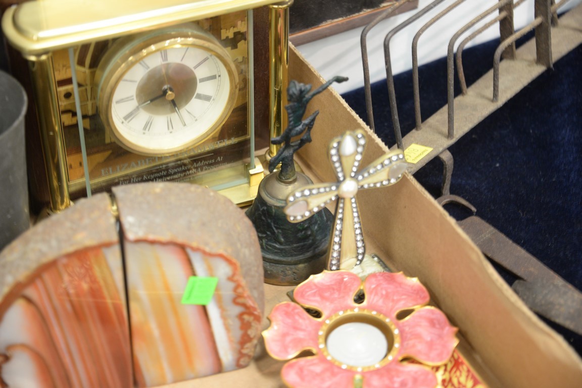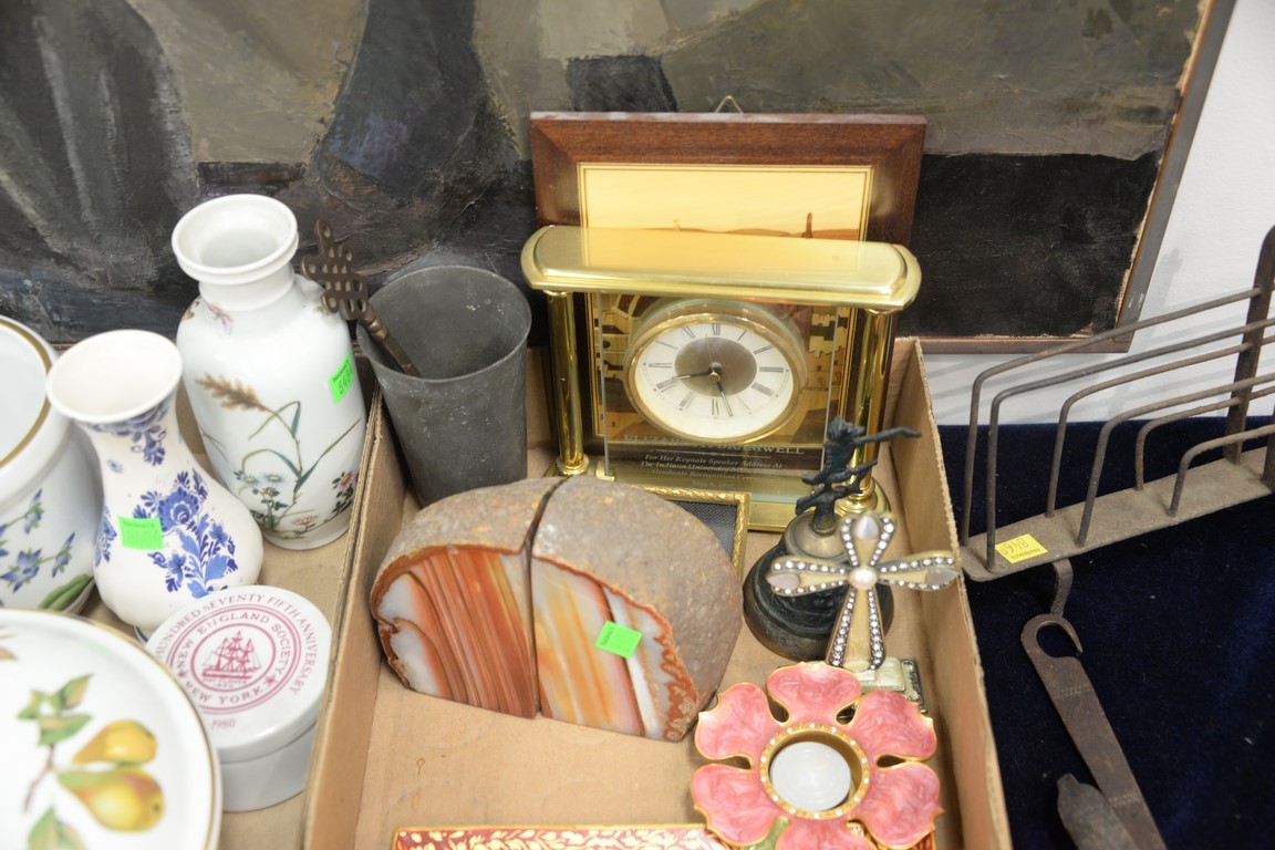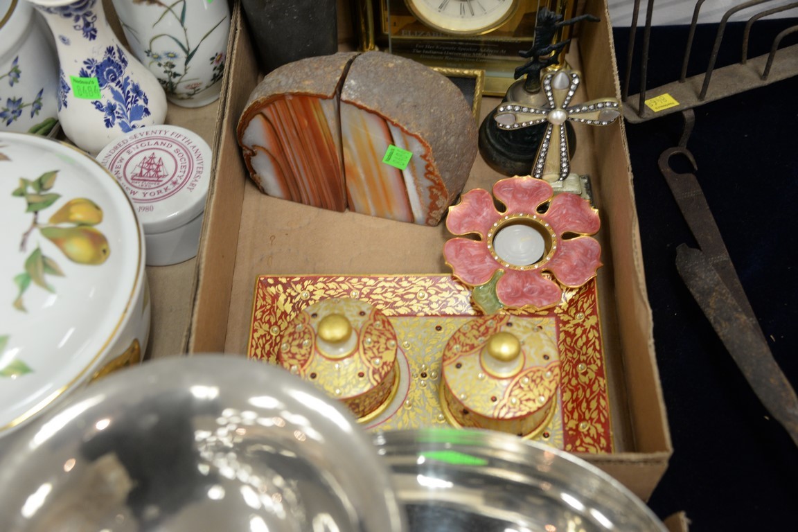 Two tray lots with sterling, silverplate, and miscellaneous items including Godinger Jensen style compote, Burnes enameled sterling salt and pepper, stone bookends, inlaid plaque, and pewter plate.