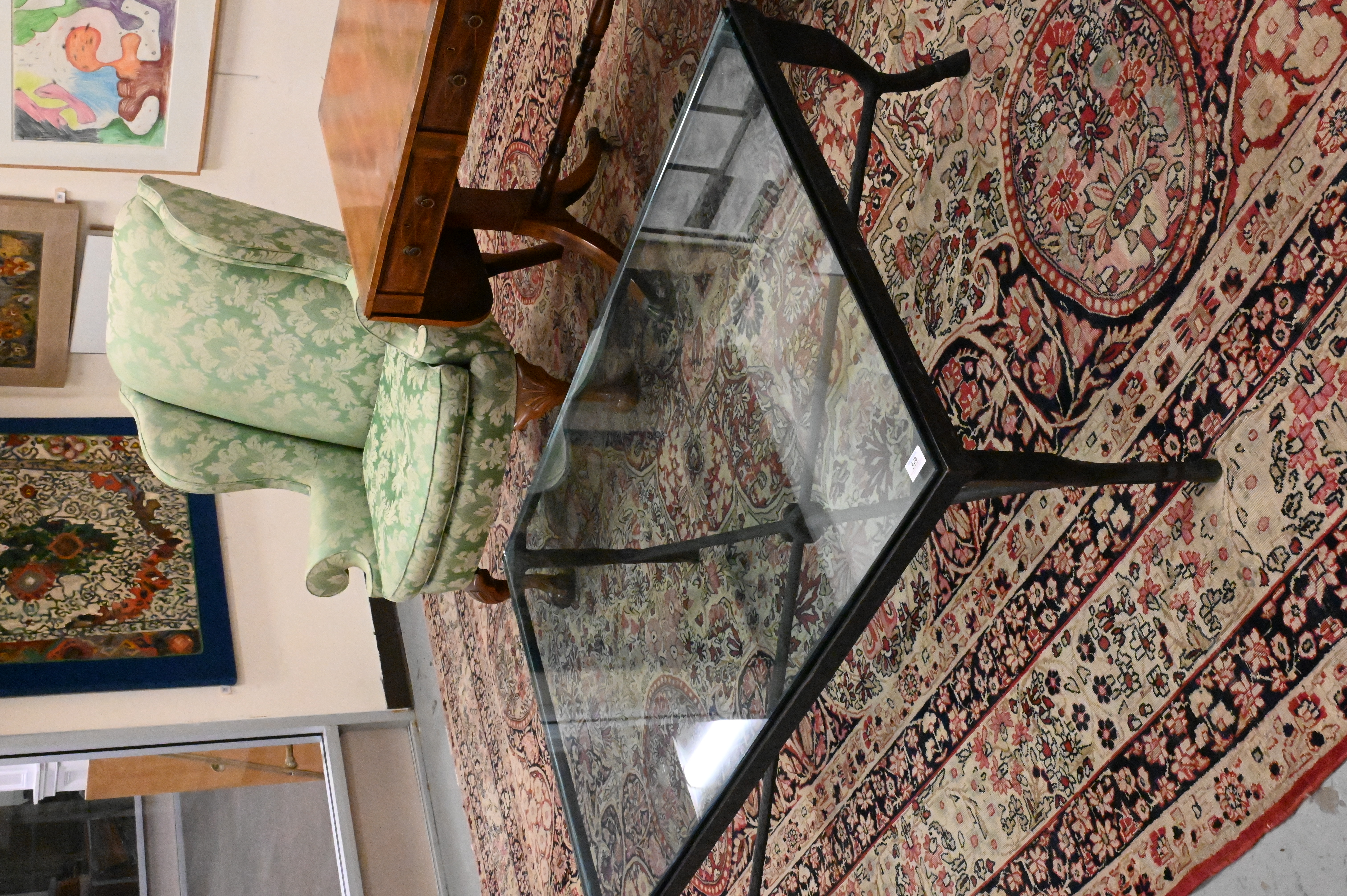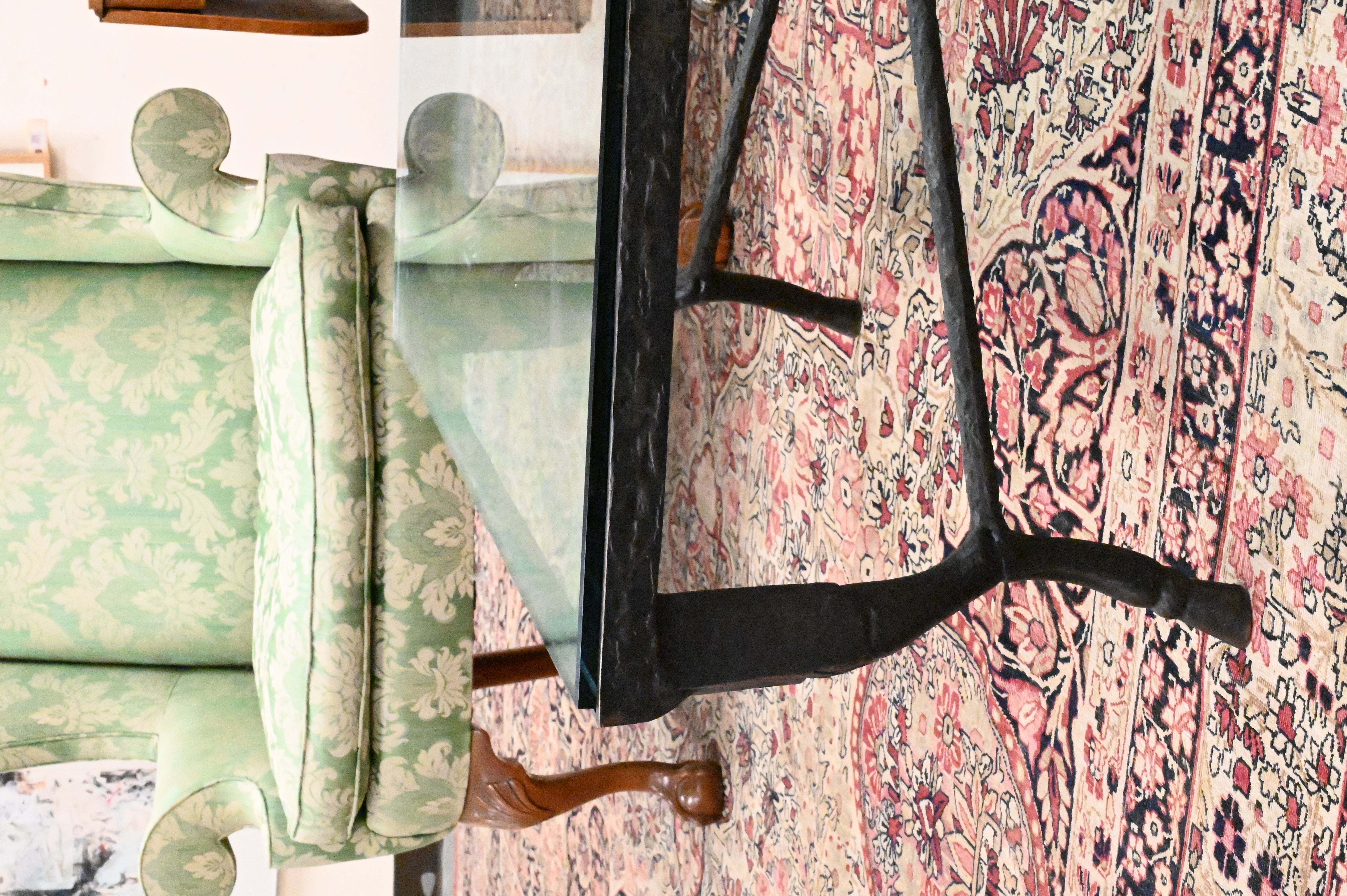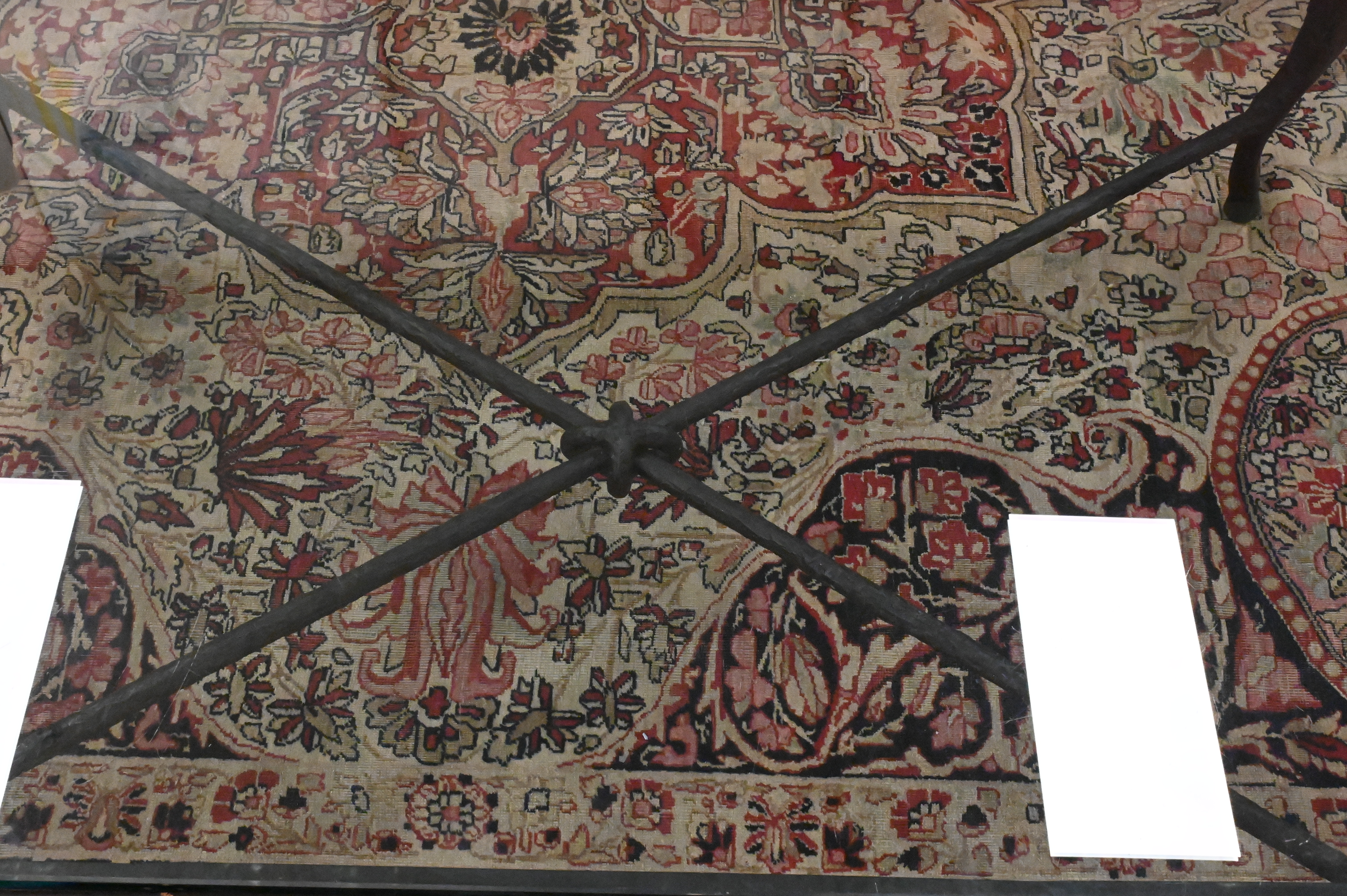 Bronze and glass coffee table having glass top on raised hoof or chevre feet, X form stretcher with center knot