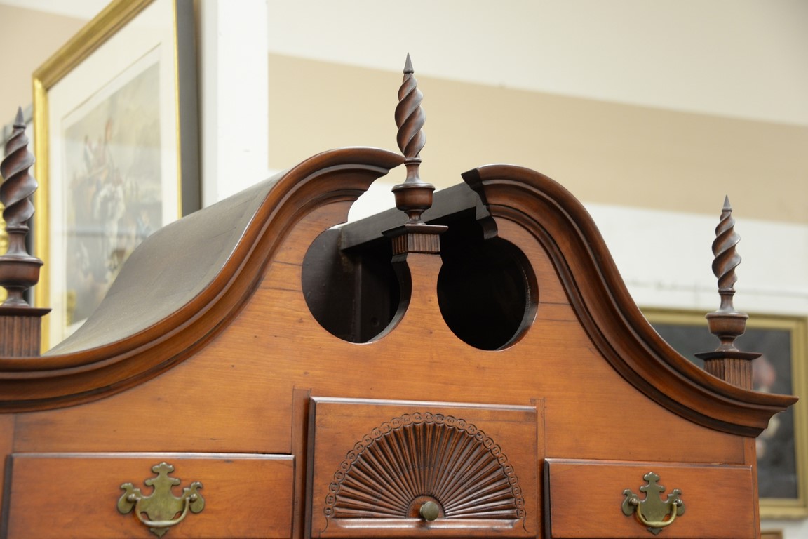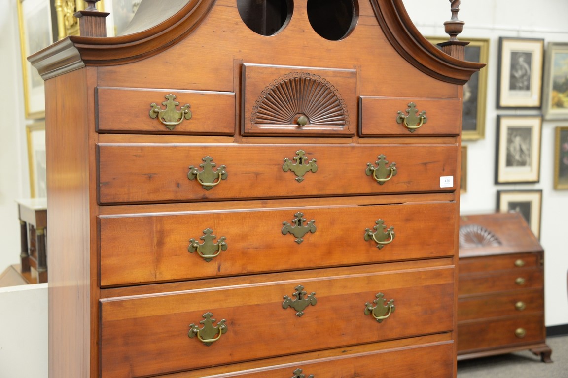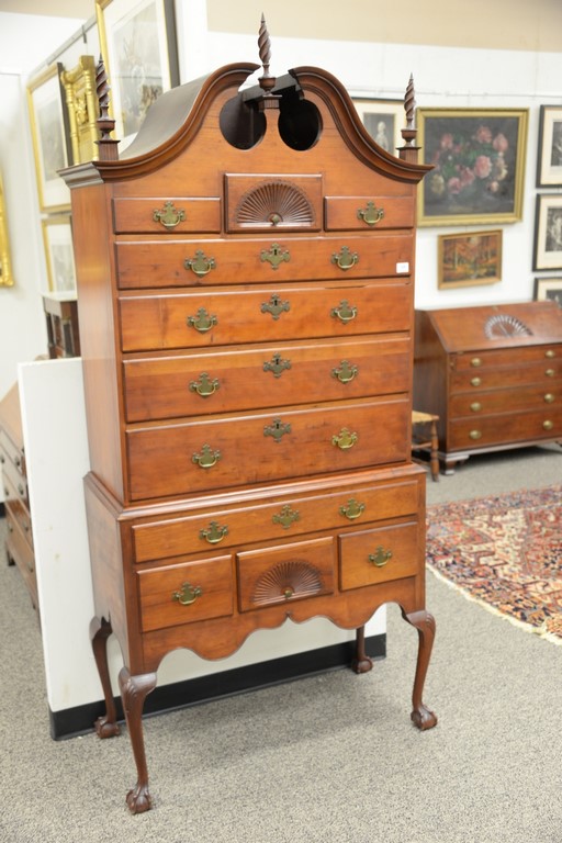 Lot 428: Chippendale cherry high chest in two parts, upper section with full bonnet top on lower section with carved skirt set on cabriole le…