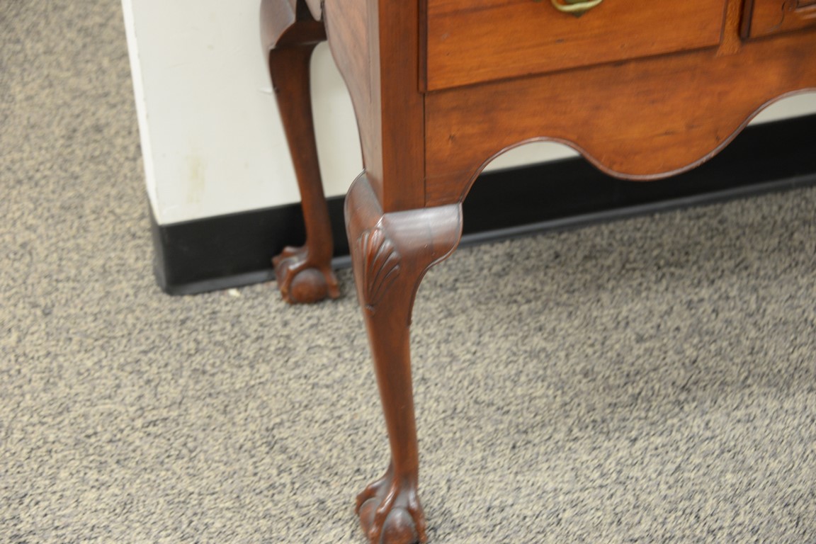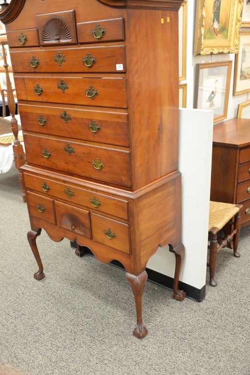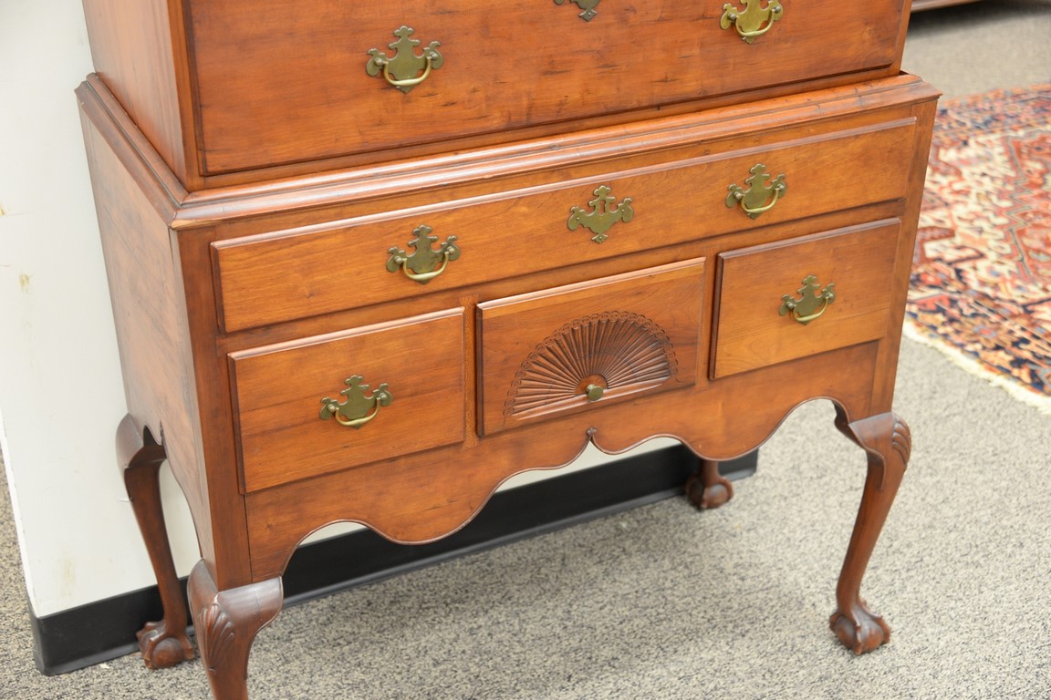 Chippendale cherry high chest in two parts, upper section with full bonnet top on lower section with carved skirt set on cabriole legs ending in ball and claw feet, circa 1760, married. ht. 85in., upper section wd. 36in., dp. 18in.