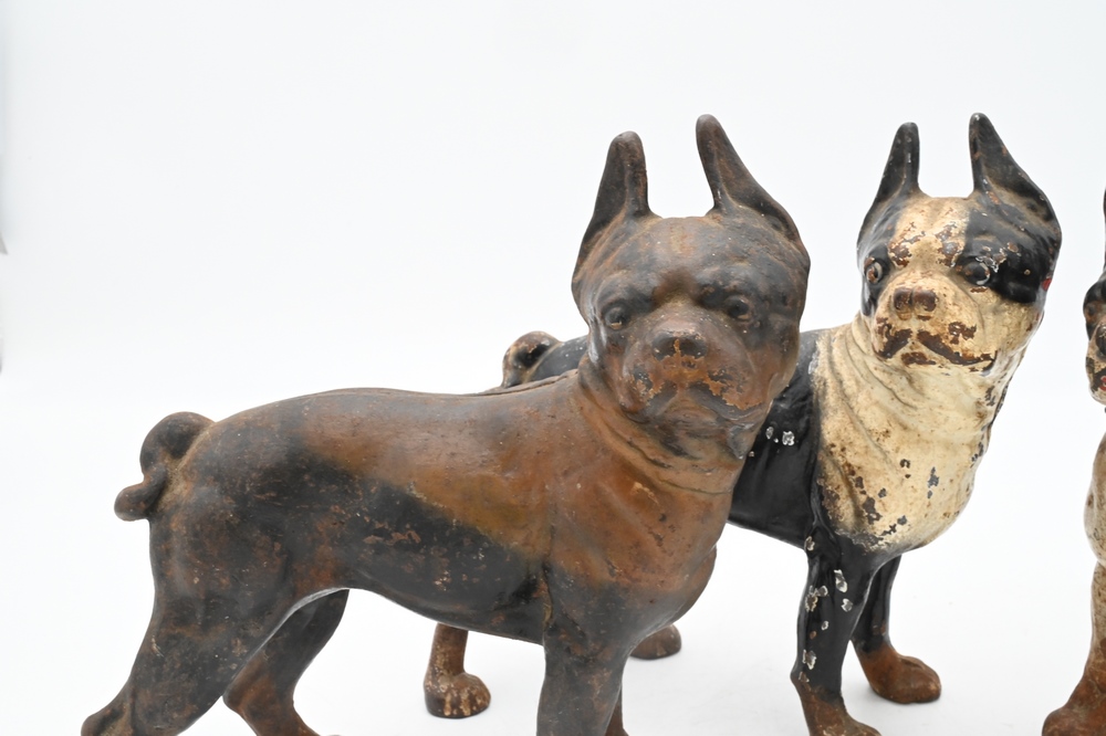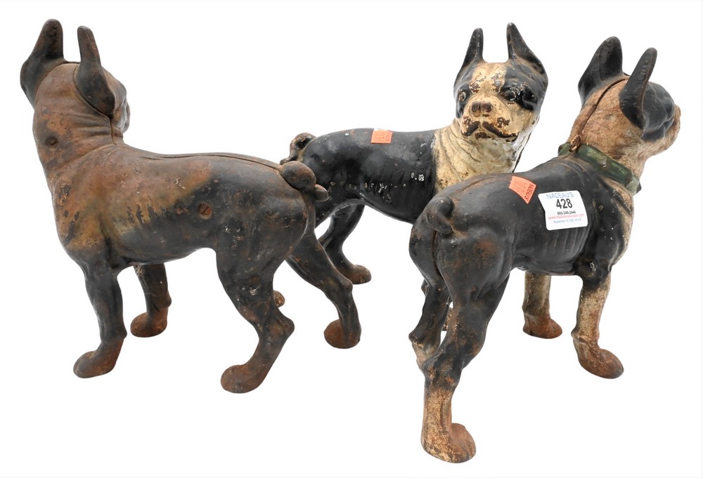 Lot 428: Three Cast Iron Hubley Bulldog Door Stops, length 9 inches.