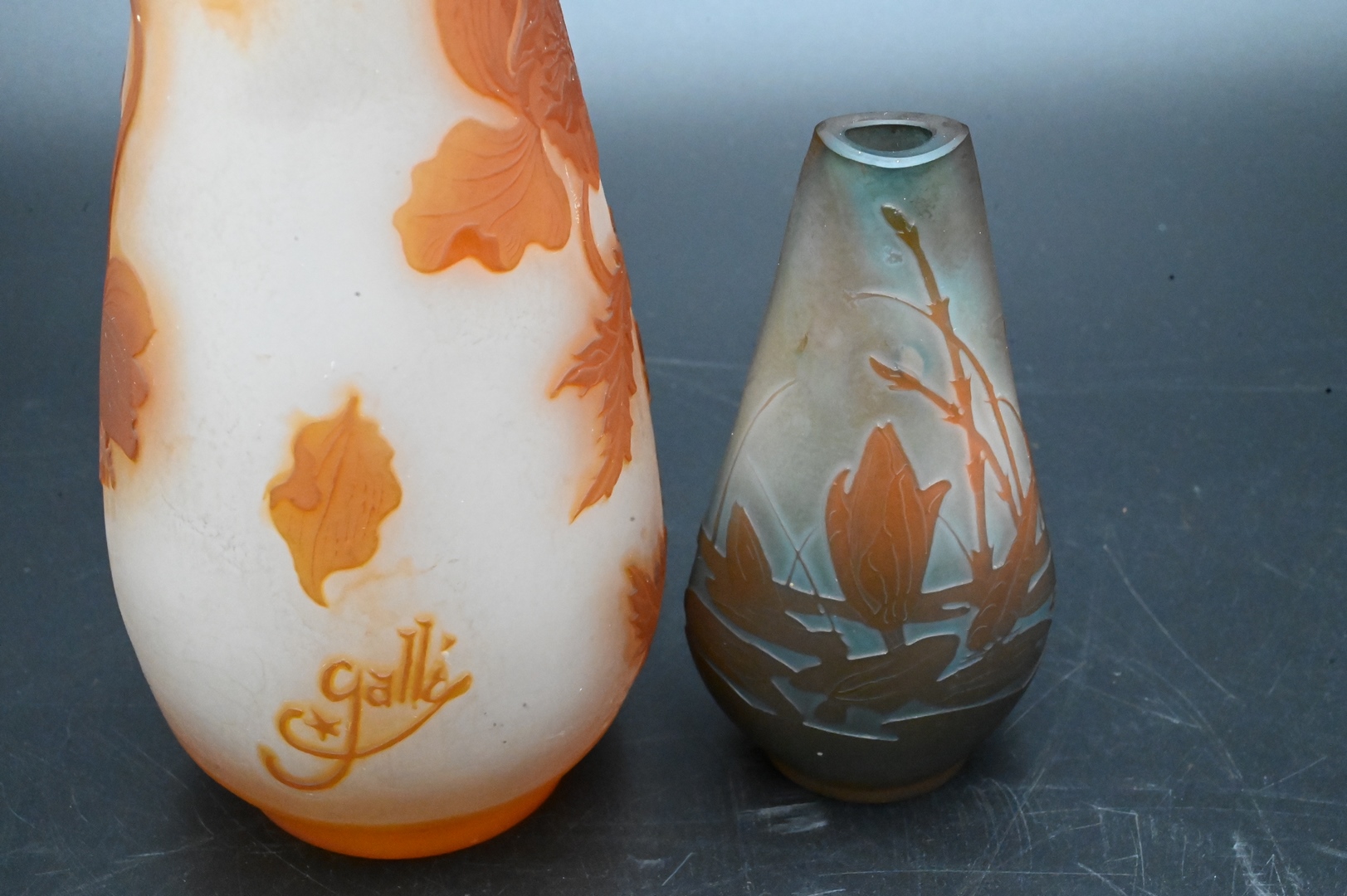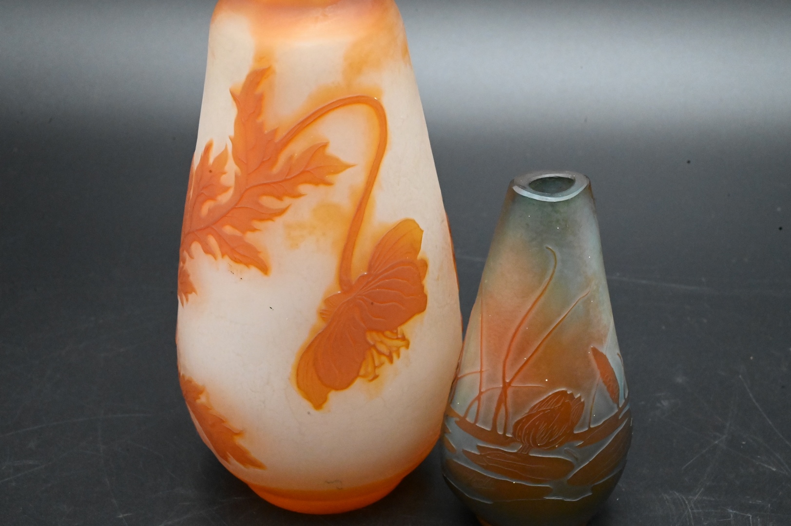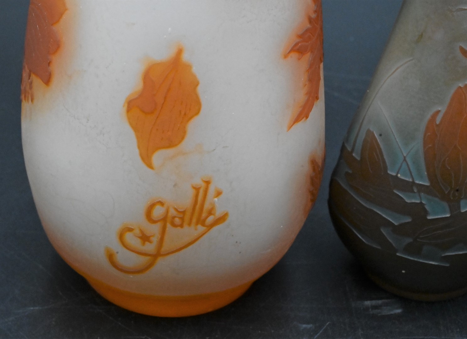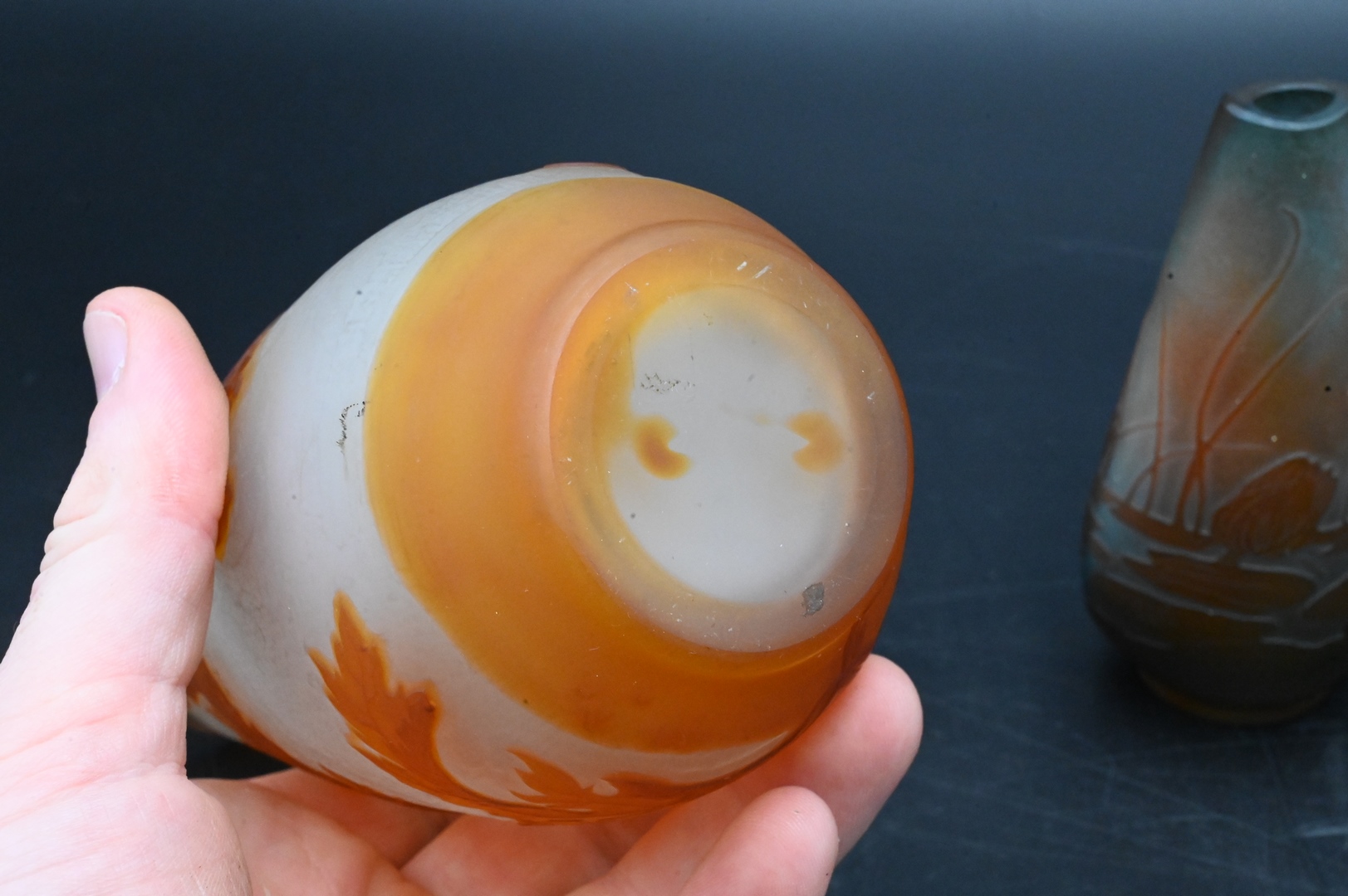 Two Galle Cameo Art Glass Vases, to include a small lily pad bud vase, along with a norange cut to frosted glass flower vase; heights 6 and 4 inches. Provenance: From the Estate of Elwyn W. Lemon, Enfield, Connecticut.