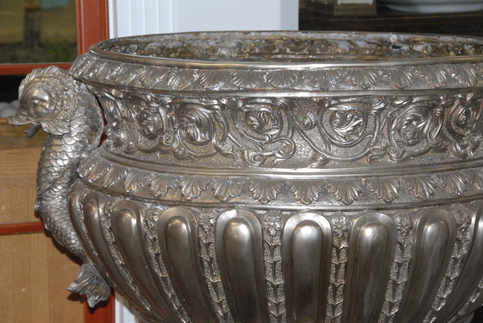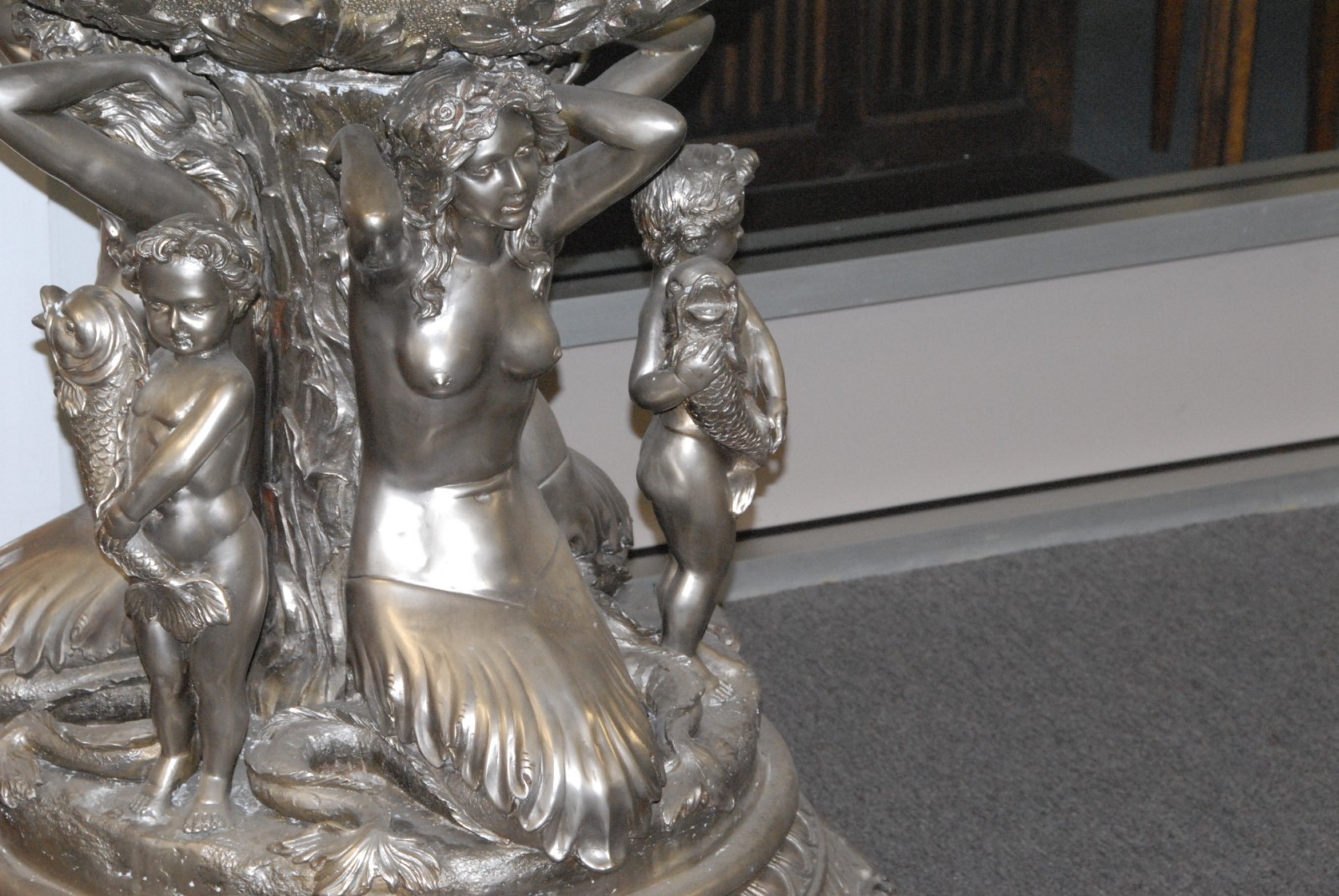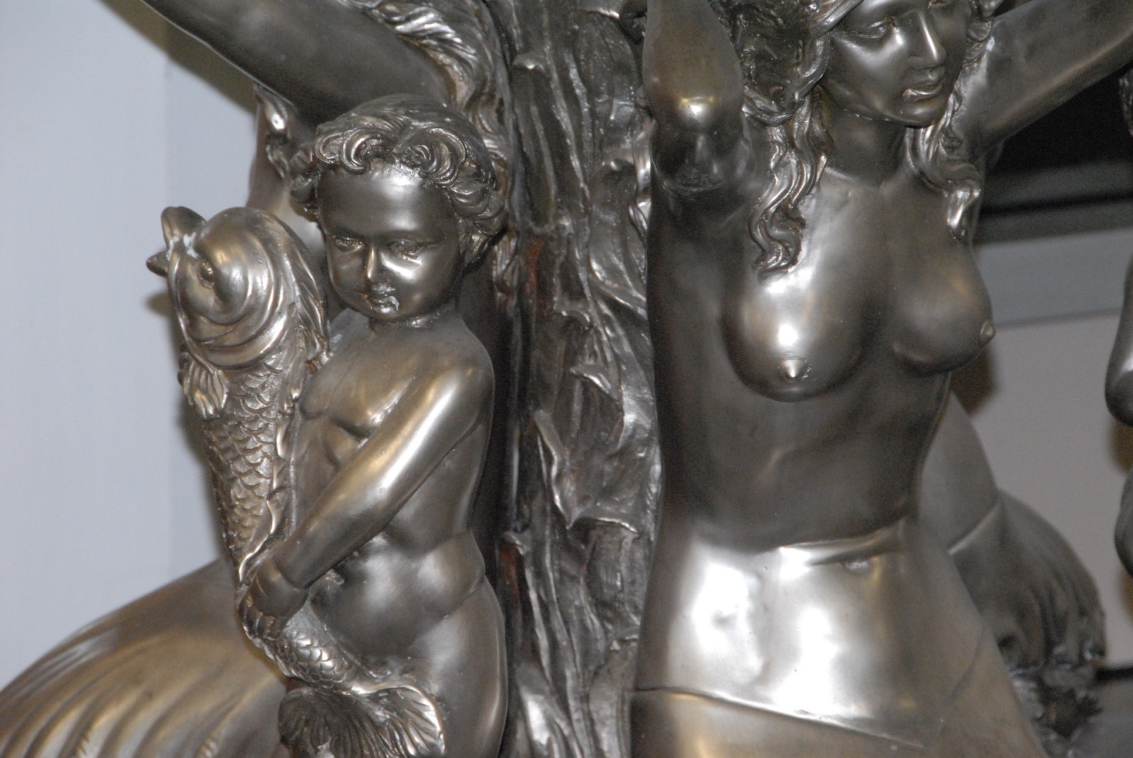Pair of bronze silvered urns with figural bases and seahorse handles.