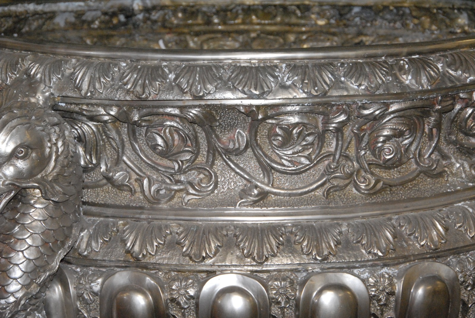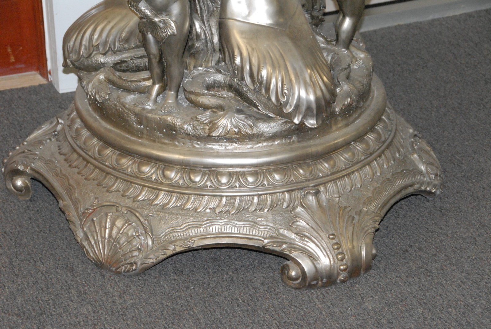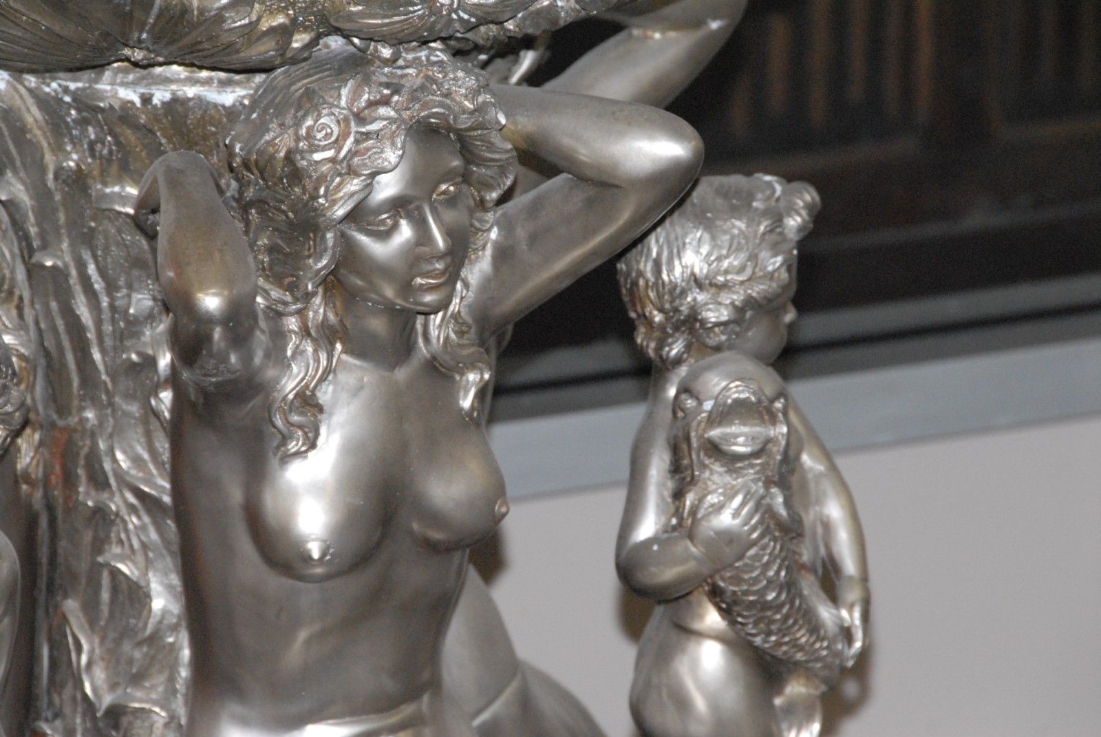 Pair of bronze silvered urns with figural bases and seahorse handles.