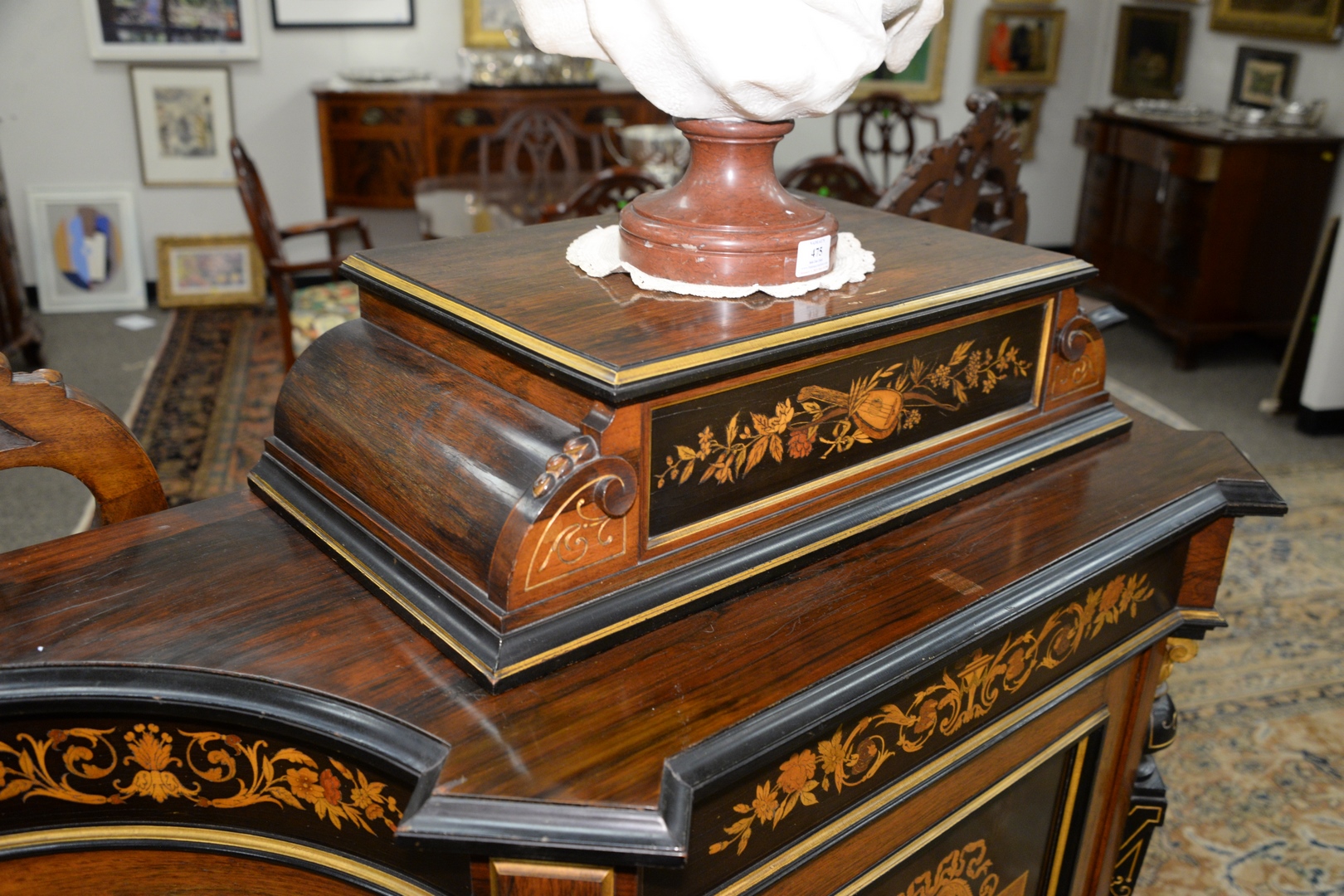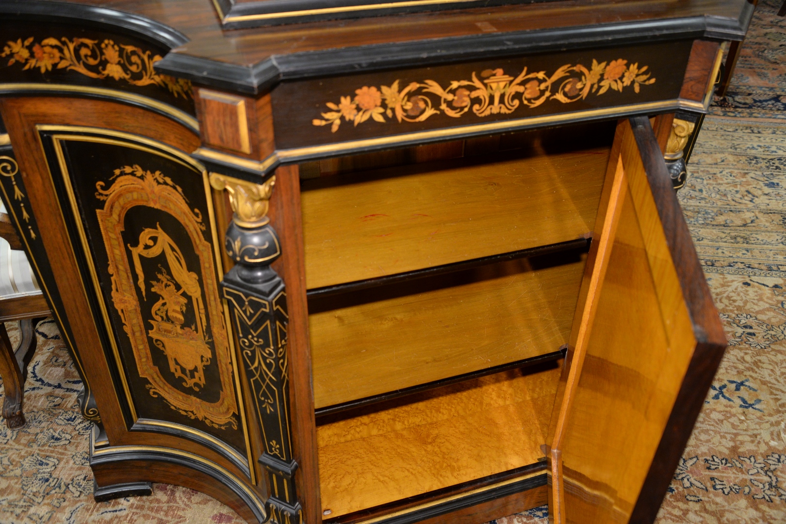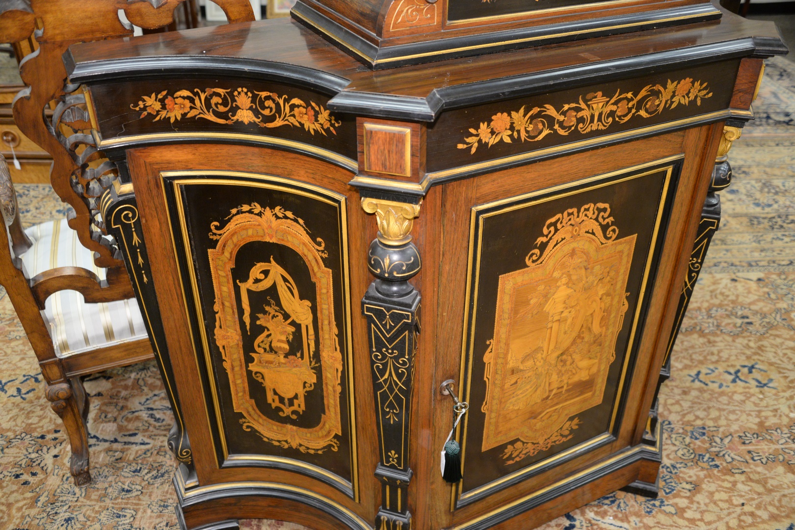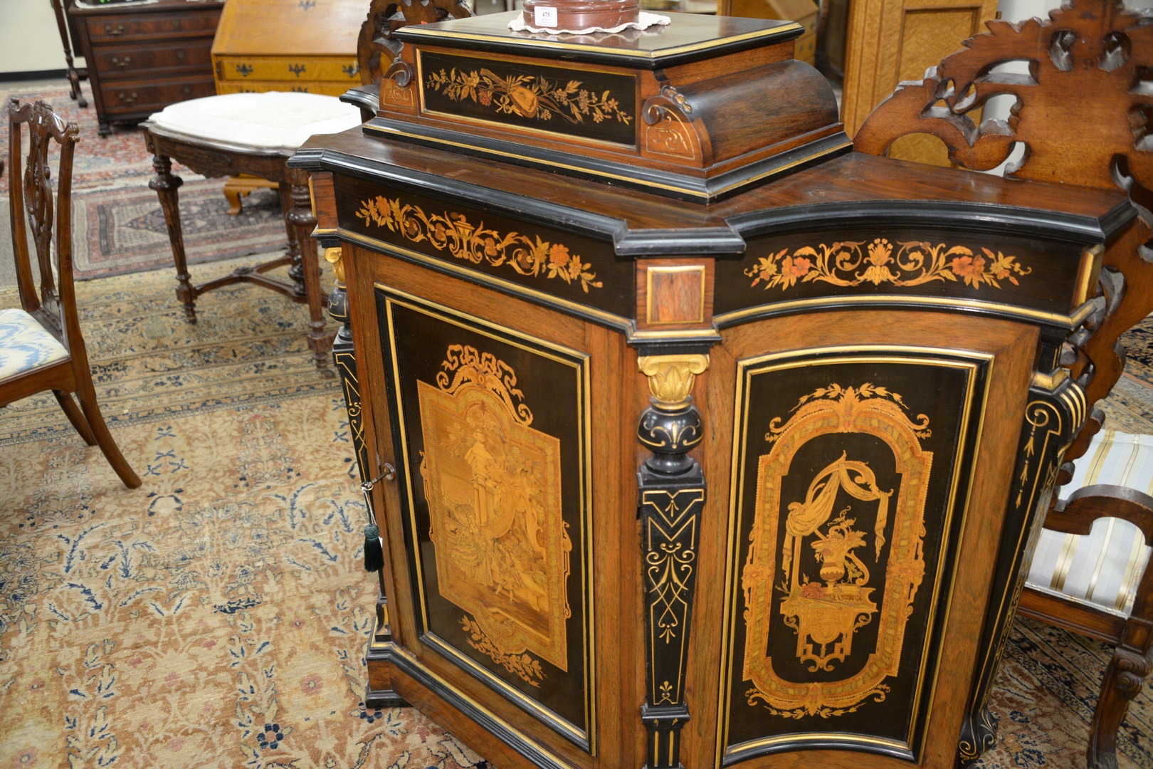 Lot 429: Aesthetic Rosewood Side Cabinet having inlay and inlaid panels, central door inlaid depicting romantic scene, opening to birdseye ma…